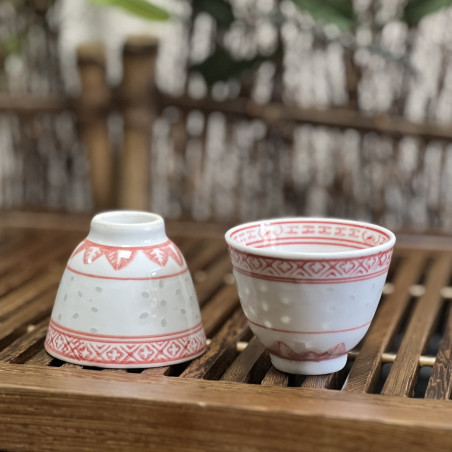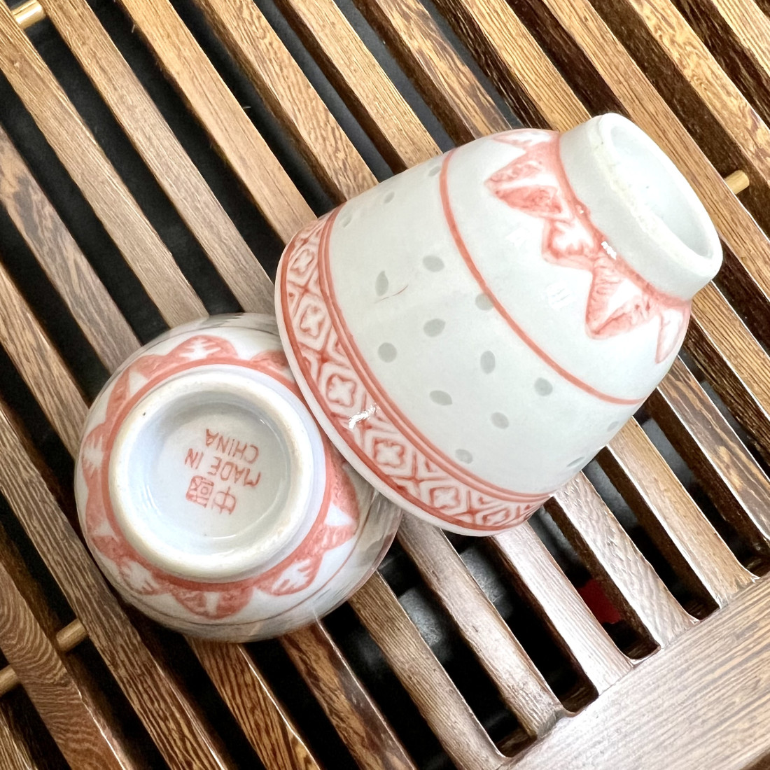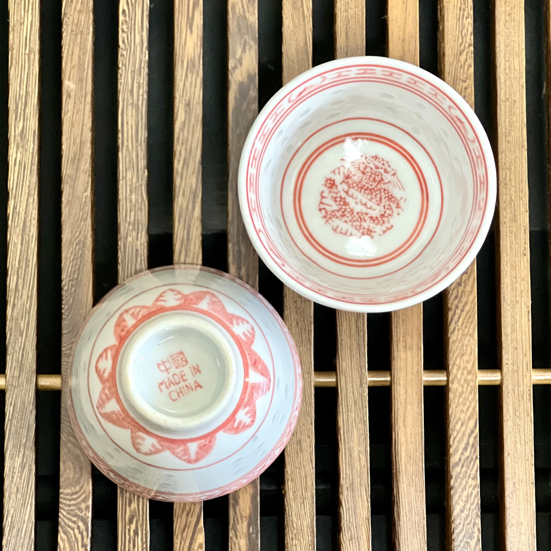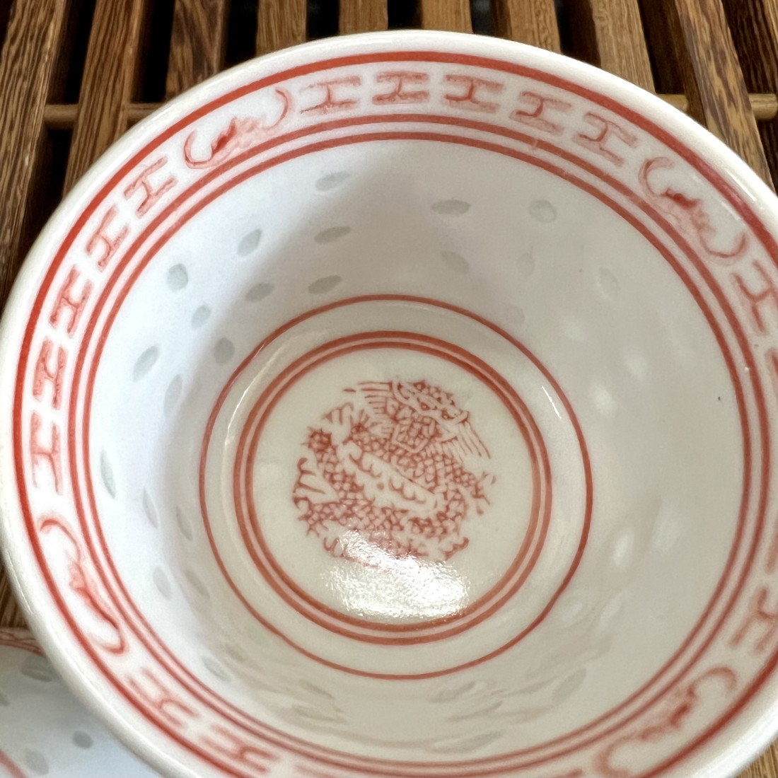 Взагалі, чаші точно не "придворні", незважаючи на цінність самого цзиндечженьського фарфору. "Рисінки" вирізані грубо і залиті каламутною глазур'ю. Нанесення кобальтового малюнка неакуратне та нерівномірне. А малюнок дракона на дні чаші іноді більш-менш виразний, іноді лише вгадується.
