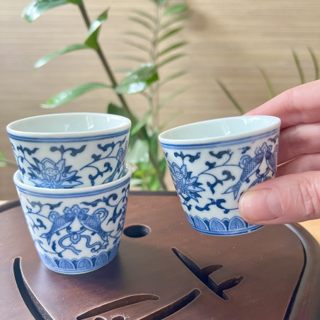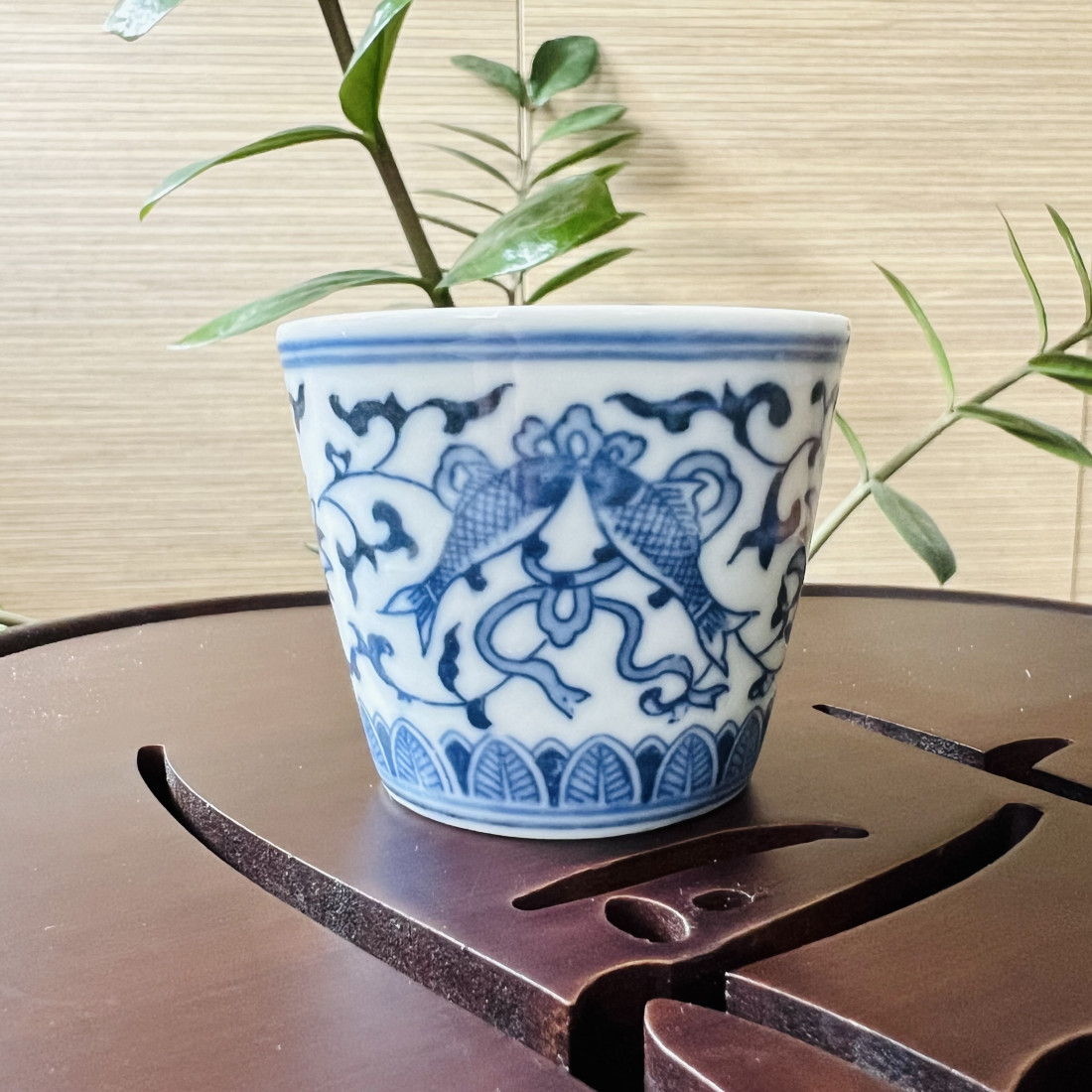 На цій чаші зображено дві риби в оточенні лотосів. Символіка така: ієрогліф риба звучить так само, як ієрогліфи надлишок та нефрит/дорогоцінність — юй, тому метафорична риба стала синонімом багатства. Вона настільки асоціюється з добробутом, що навіть на свято китайці можуть подарувати справжню рибу, побажавши цим процвітання вашому будинку. А подібне зображення двох риб, як на чаші, часто супроводжується побажанням: нехай достаток множиться рік у рік. Лотос означає чистоту і шляхетності, оскільки він цвіте серед бруду, залишаючись чистим. Тому символіку чаші можемо розшифрувати так: досягай процвітання, зберігаючи душевну чистоту.