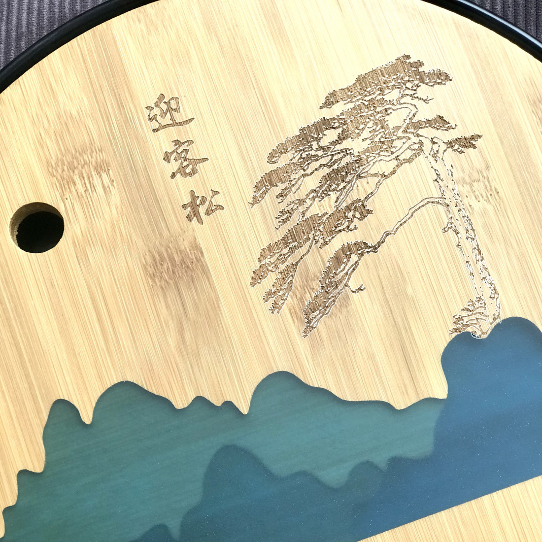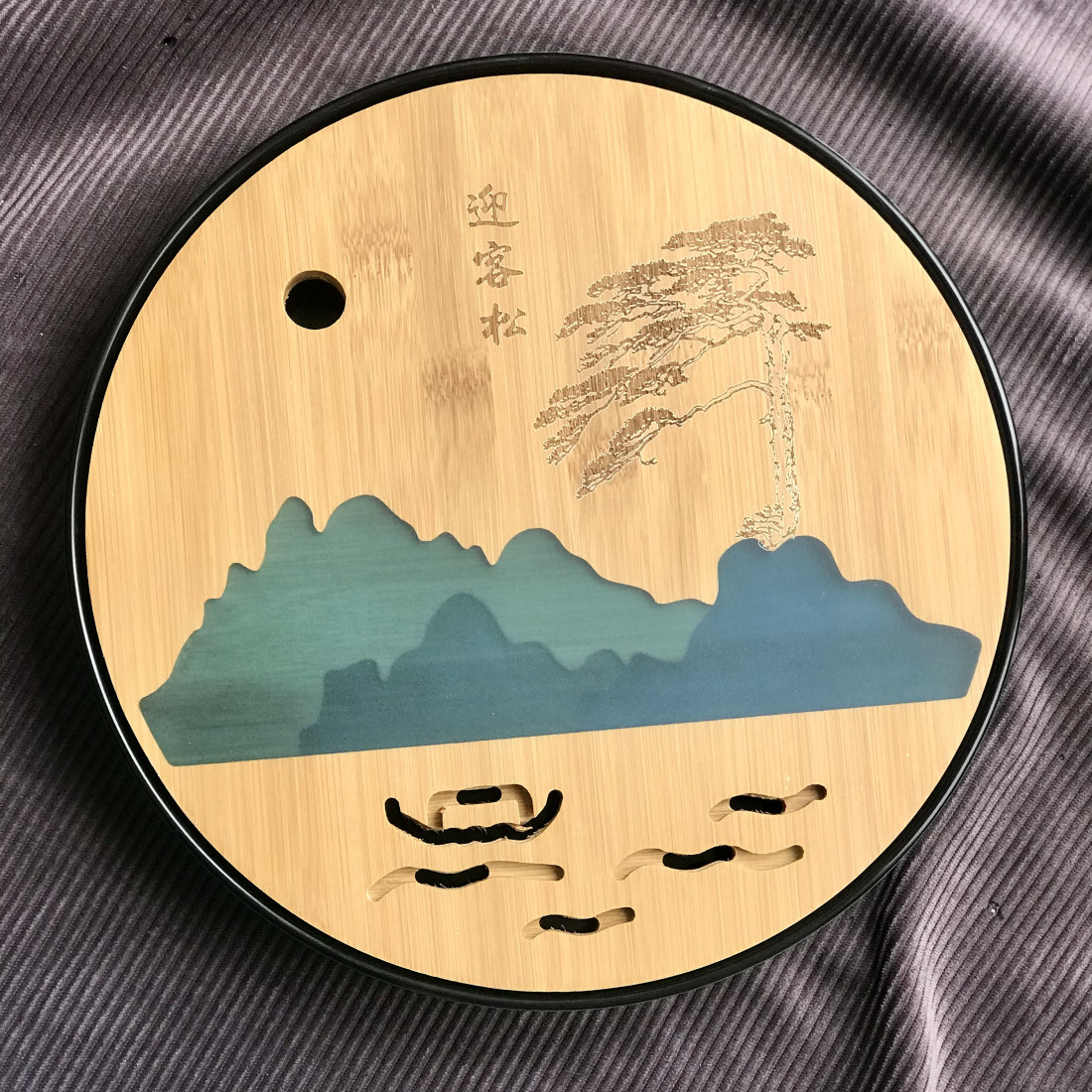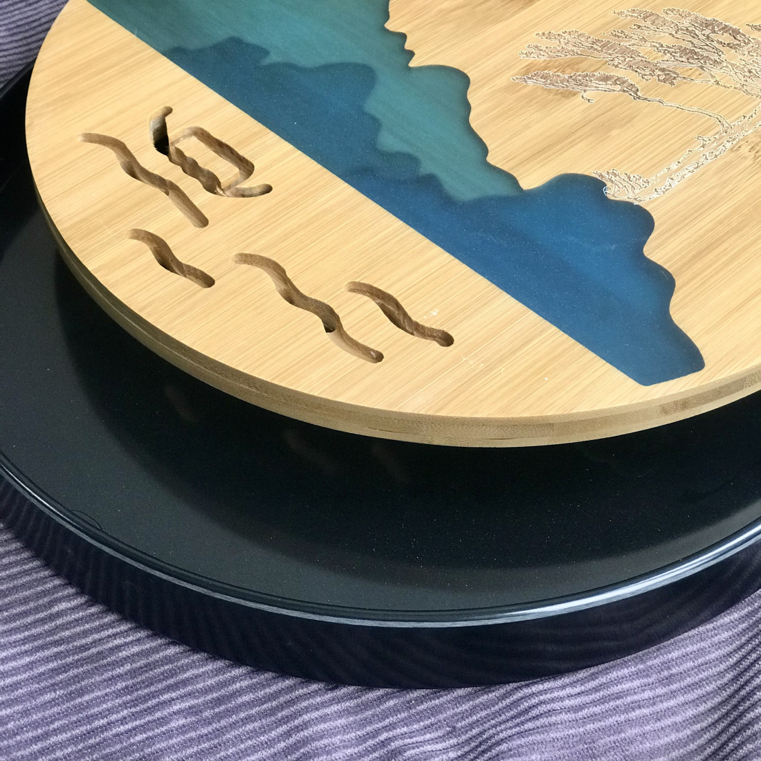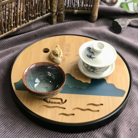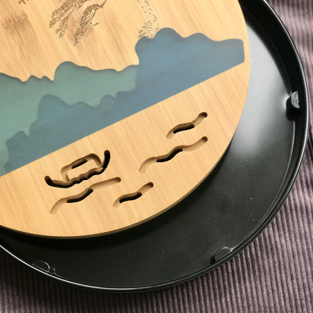 Кругла чабань з чорною меламіновою основою середніх розмірів. Верхня решітка з бамбука, з кольоровим зображенням гір: матеріал типу епоксидної смоли, кольори варіюються в різних чабанях від ніжно-бірюзового до насичено синього.
