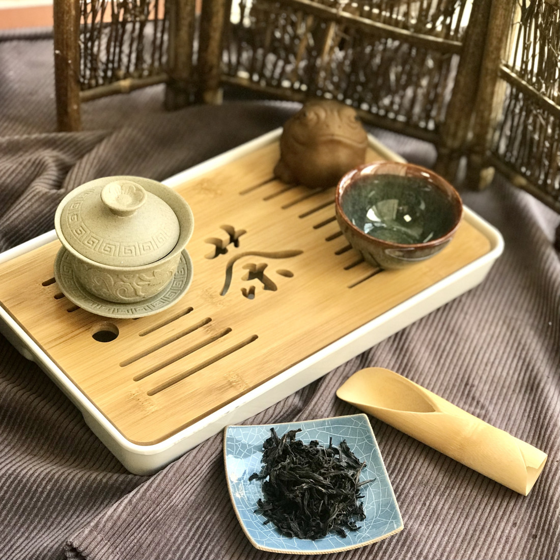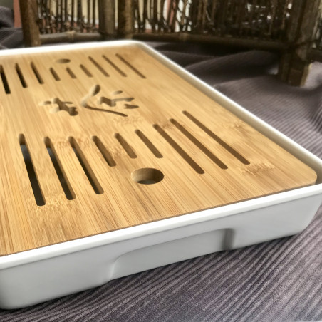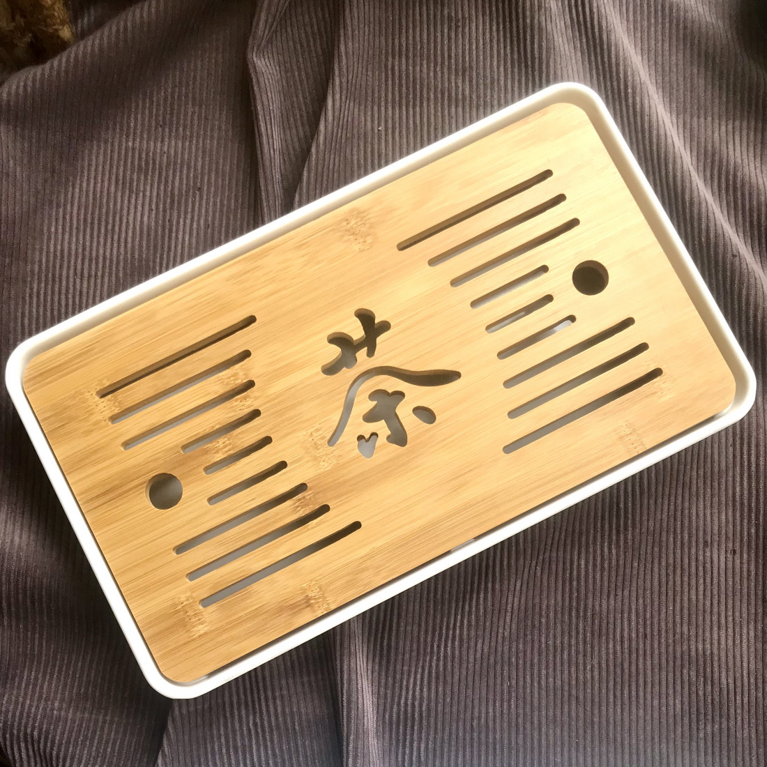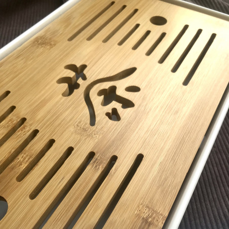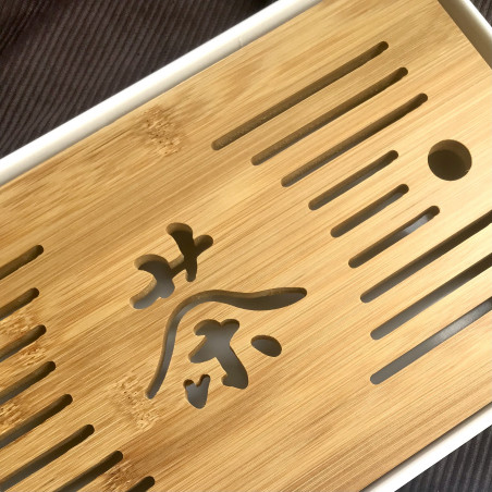 Прямокутна чабань з білою пластиковою основою середніх розмірів. Верхня решітка з бамбука, з вирізаним ієрогліфом "Чай".