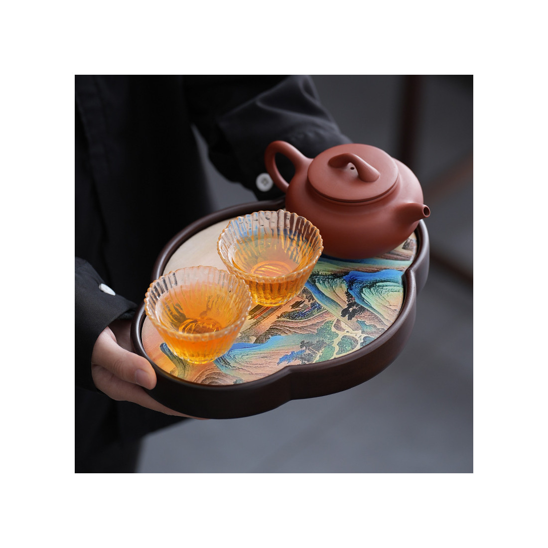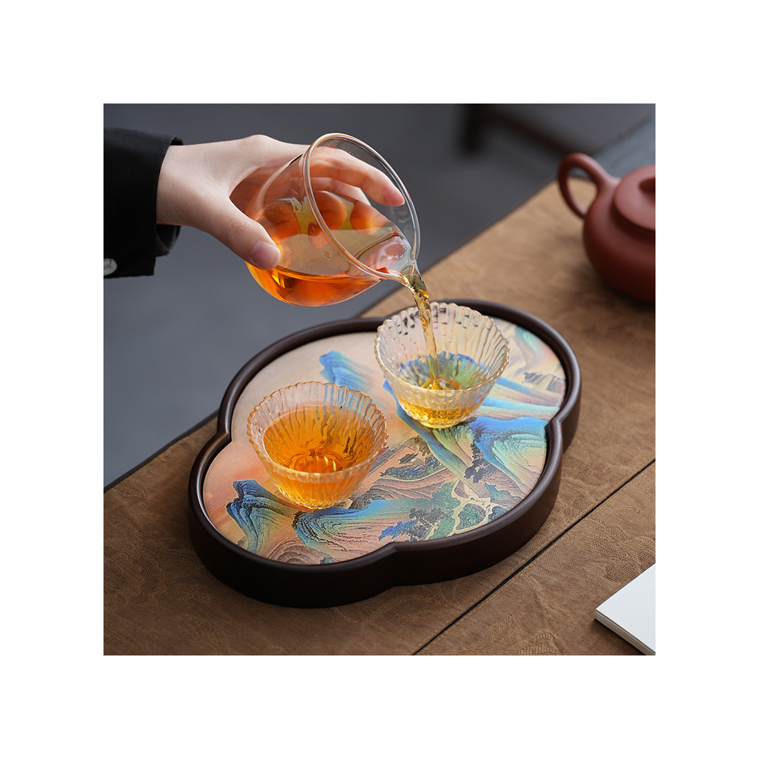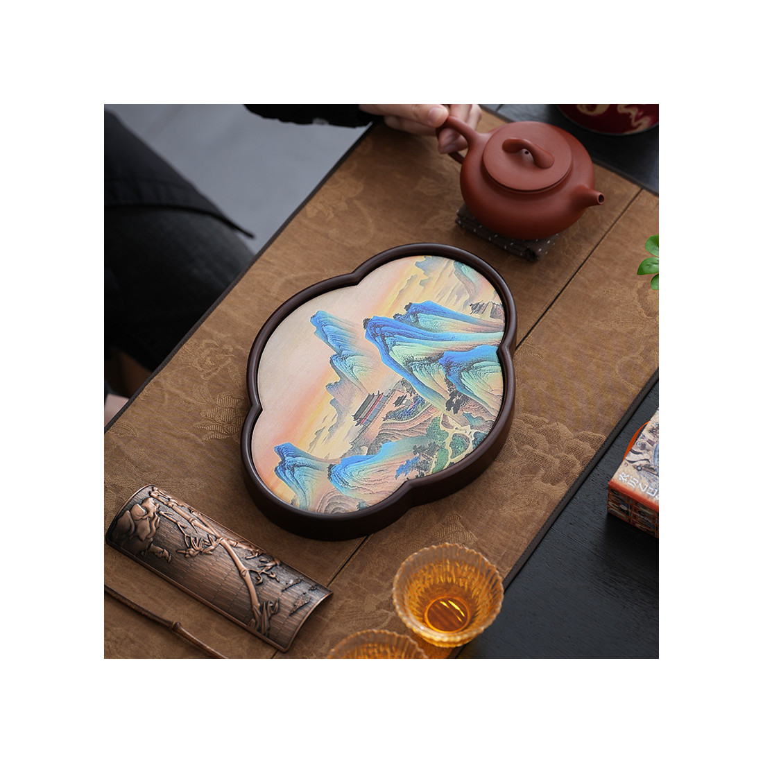 Дошка для чаювання, яка поєднує в собі і чабань для "сухого" заварювання, і тацю, і посудину, що живить чайник. Можна назвати її новаторським предметом для традиційних чаювань. Основа зроблена з бамбука, а зверху встановлений товстий, відносно м'який килимок на жорсткій основі. Верхня частина не знімається. Незважаючи на те, що всередині є вільне місце, вона не розрахована на великий обсяг води. Ми звикли, що на чабань можна виливати багато рідини і все стіче в піддон, але у цієї інша функція: краплі, що потрапляють на килимок, вбираються і не залишаються на поверхні, таким чином наше заварювання виглядає більш естетично.