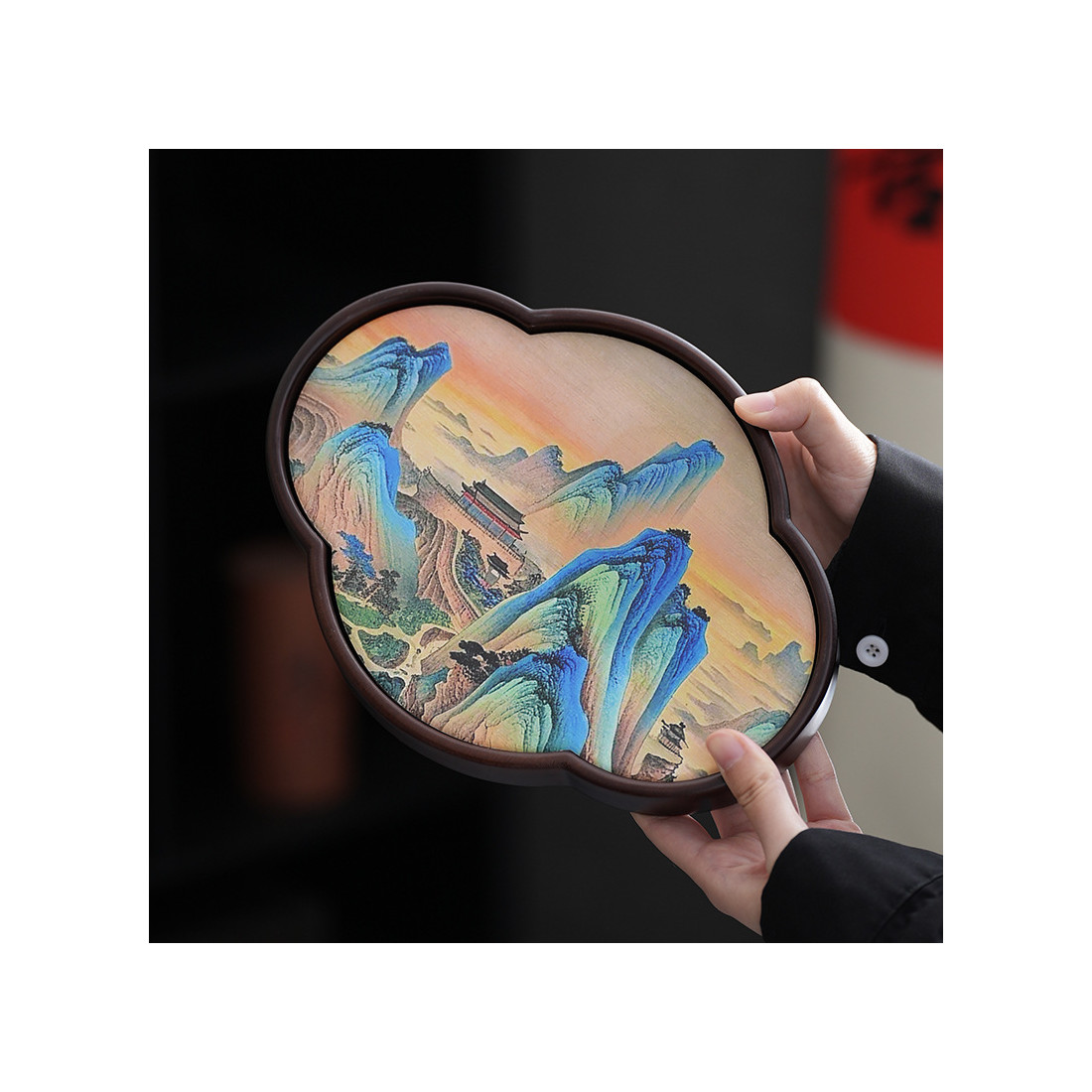 Дошка виконана акуратно, виглядає дуже красиво та зручна у використанні з урахуванням перерахованих вище особливостей. На килимку зображено репродукцію найвідомішої картини Ван Сімена "Гори та води на тисячу" (XVII століття).