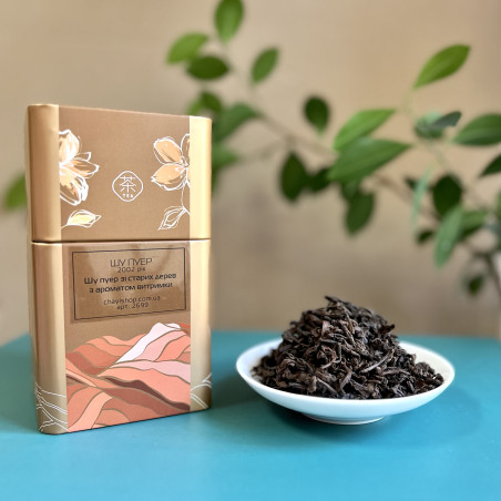 100 грам "Шу пуера зі старих дерев з ароматом витримки" 2002 року у бляшанці.