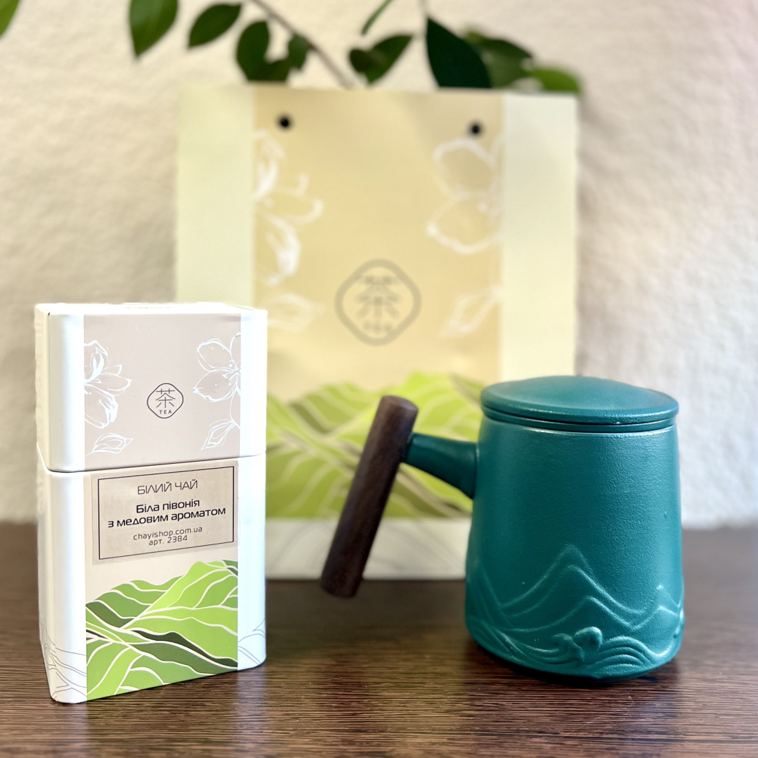 Набір у подарунковому пакеті: кружка для офісу + білий чай у бляшанці