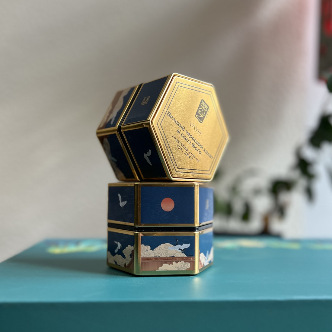 25 грам північнофуцзянського чаю "Великий червоний халат зі скелі Фоґо" у бляшанці.