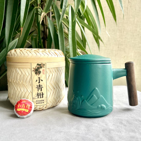 Подарунковий набір: кружка для офісу + шу пуер у мандарині в бамбуковому кошику