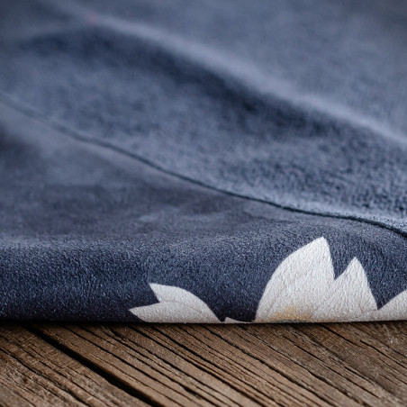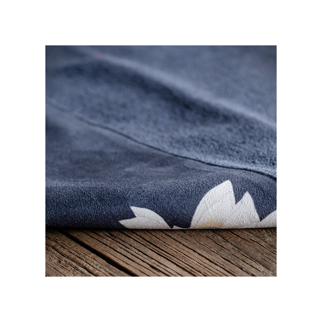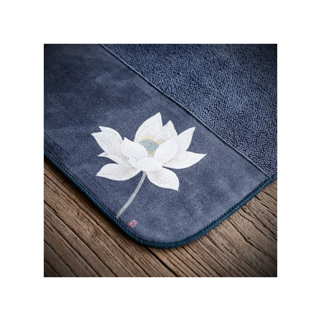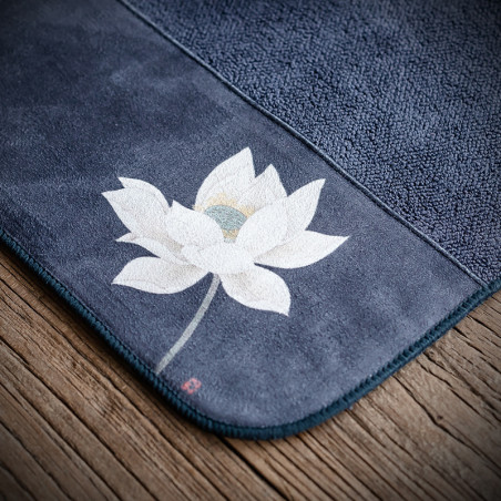 На одній із сторін рушника зроблено борт із гладкої тканини, на нього нанесено зображення лотоса. По цій вставці рушник зручно складати.
