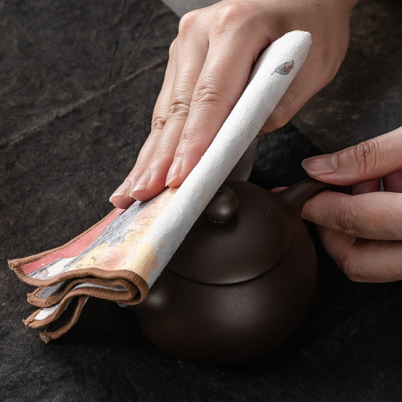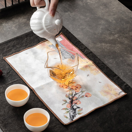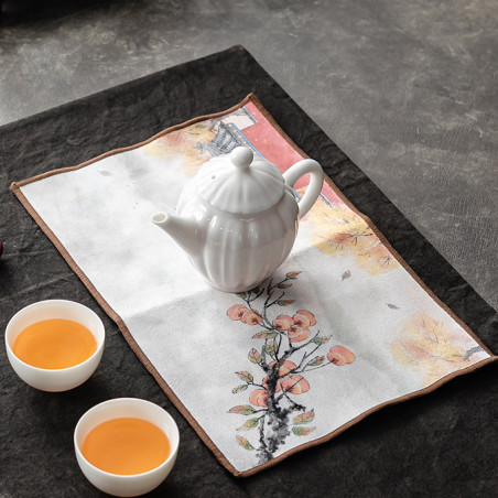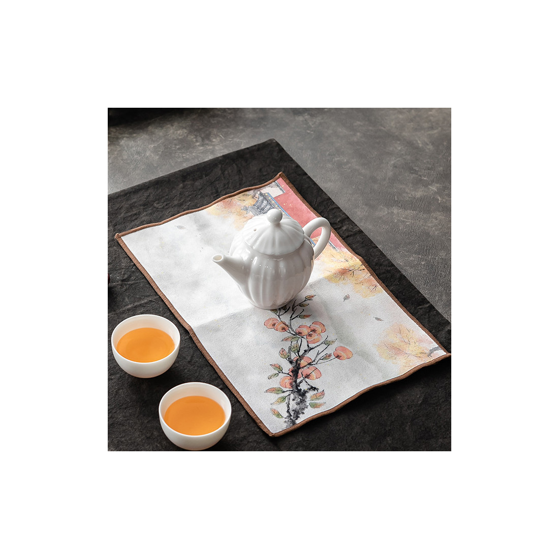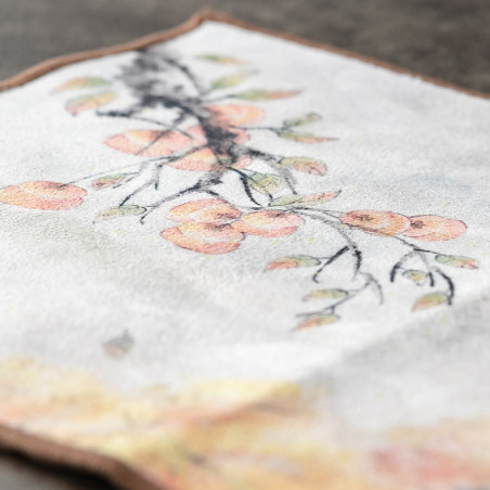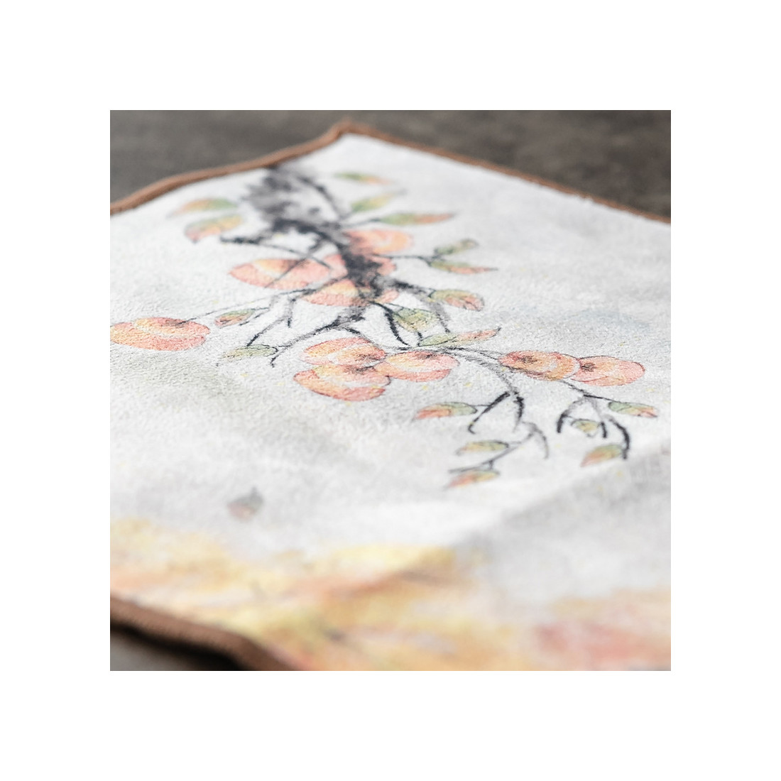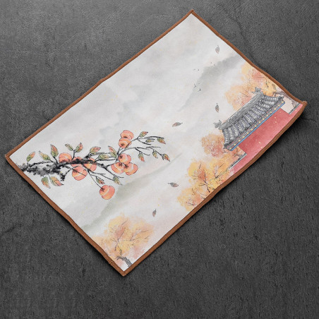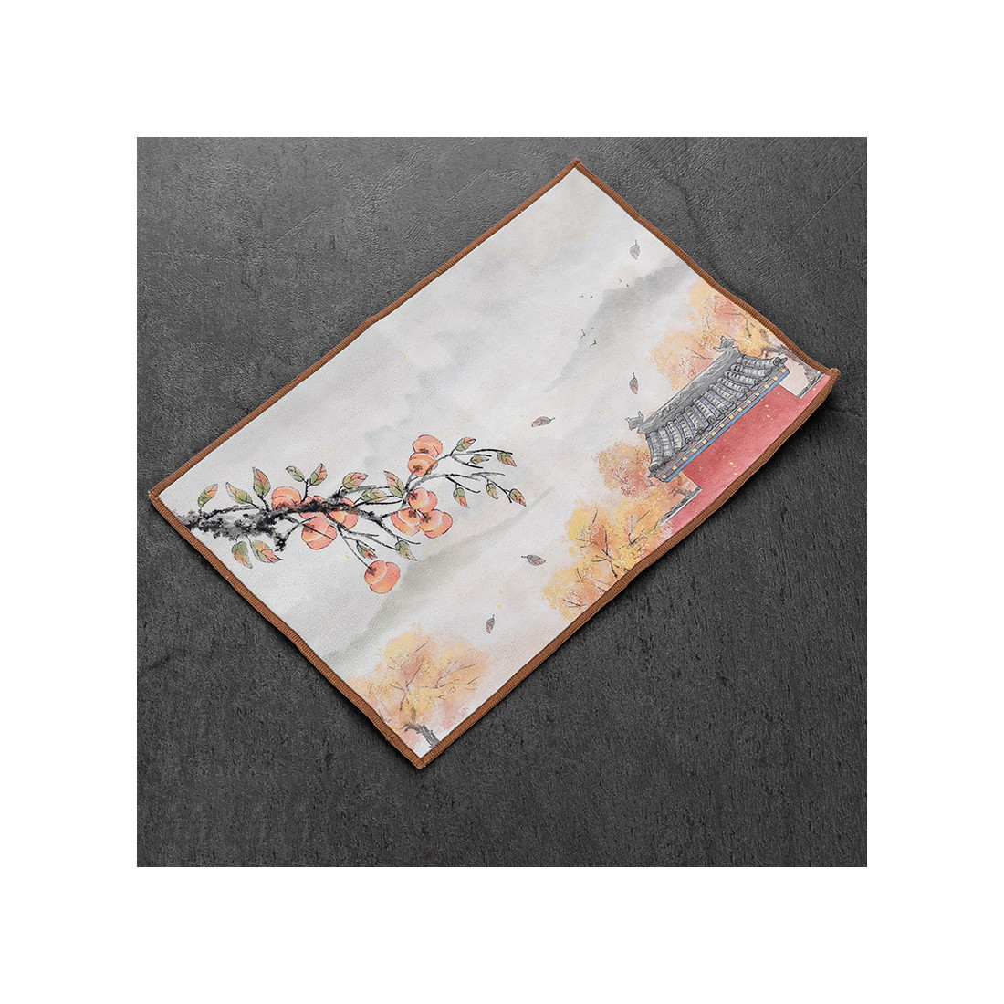 Невеликий двосторонній рушник-килимок. З одного боку, зображення осіннього пейзажу: гілка хурми на тлі китайського будиночка. З іншого — поверхня з довгим ворсом. Рушник добре вбирає воду, можна прати.