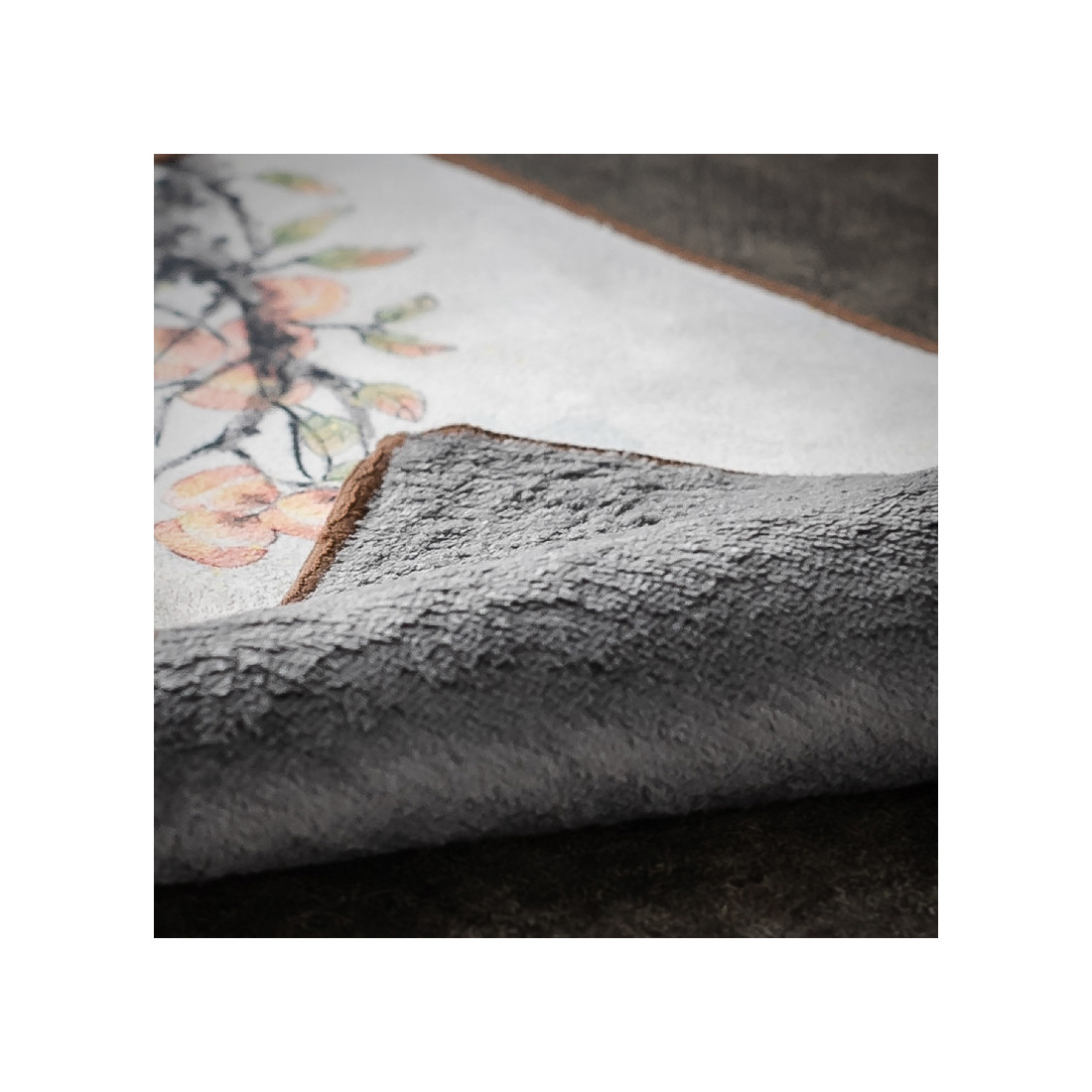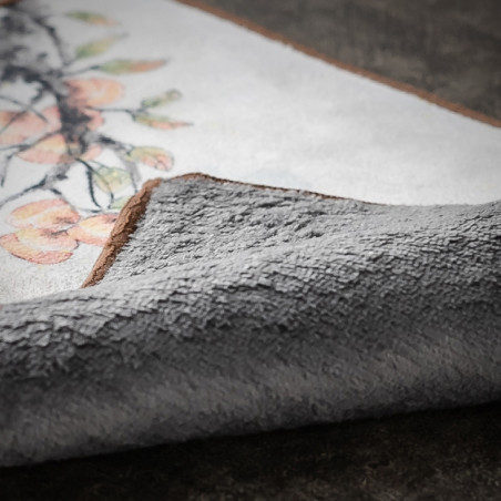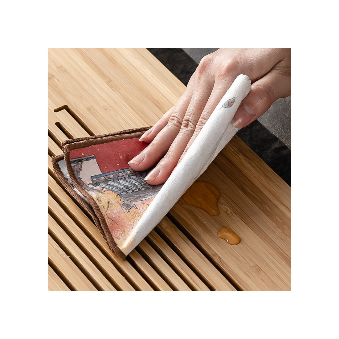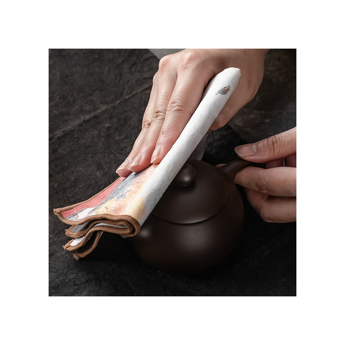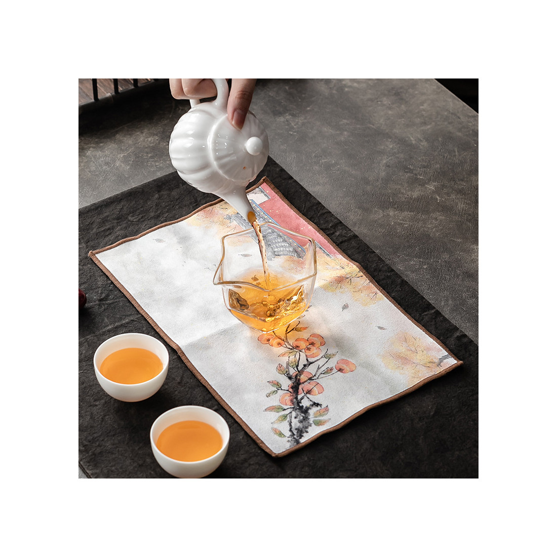 Невеликий двосторонній рушник-килимок. З одного боку, зображення осіннього пейзажу: гілка хурми на тлі китайського будиночка. З іншого — поверхня з довгим ворсом. Рушник добре вбирає воду, можна прати.