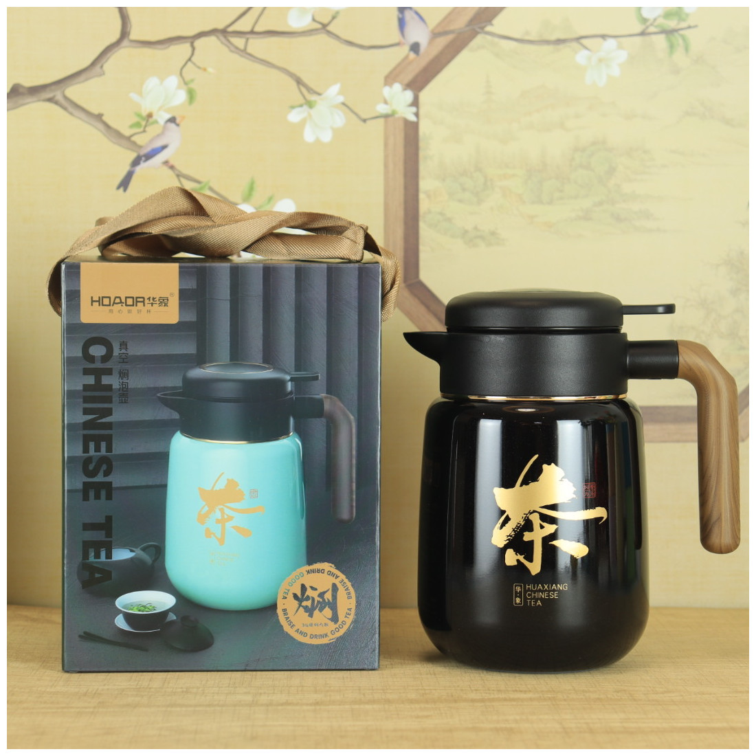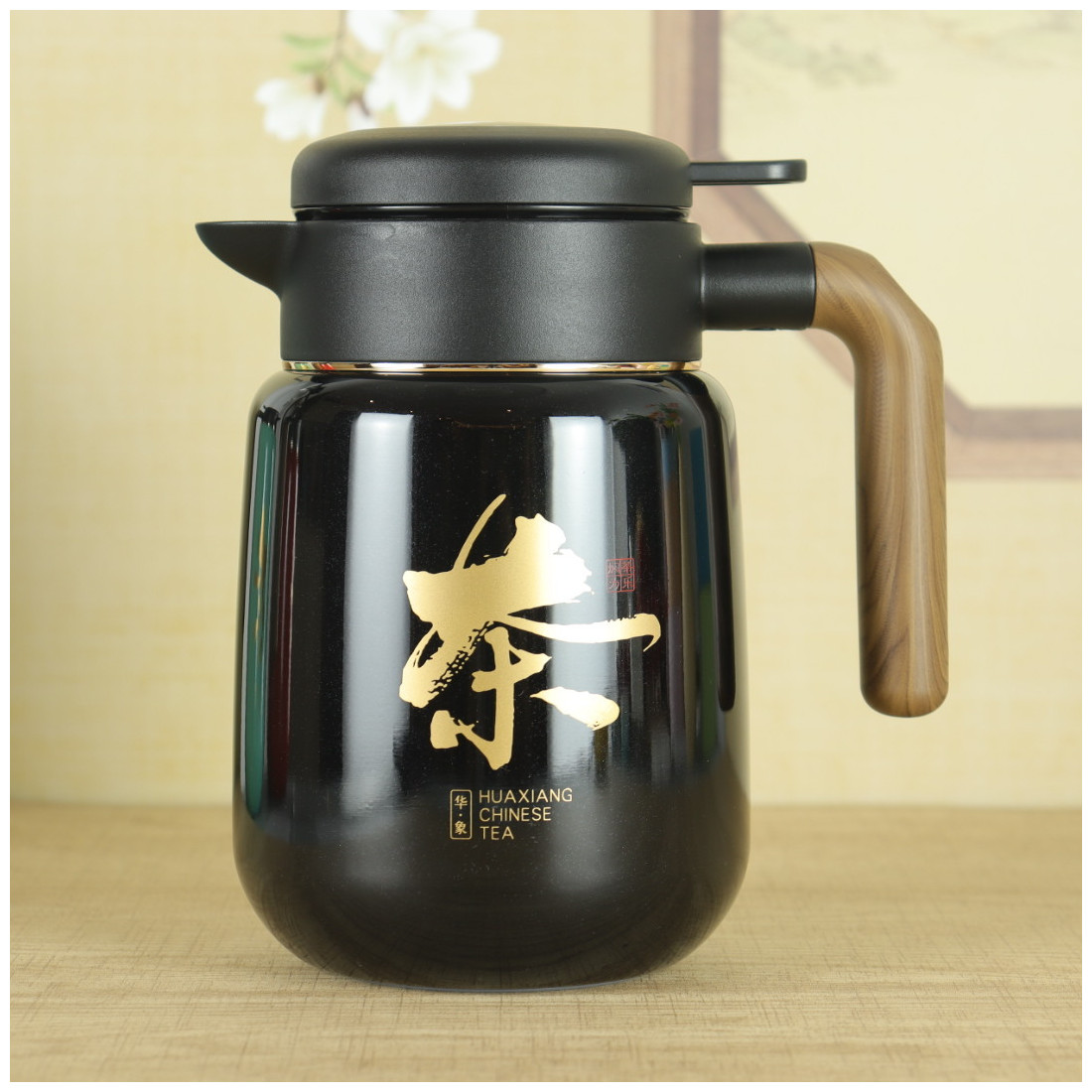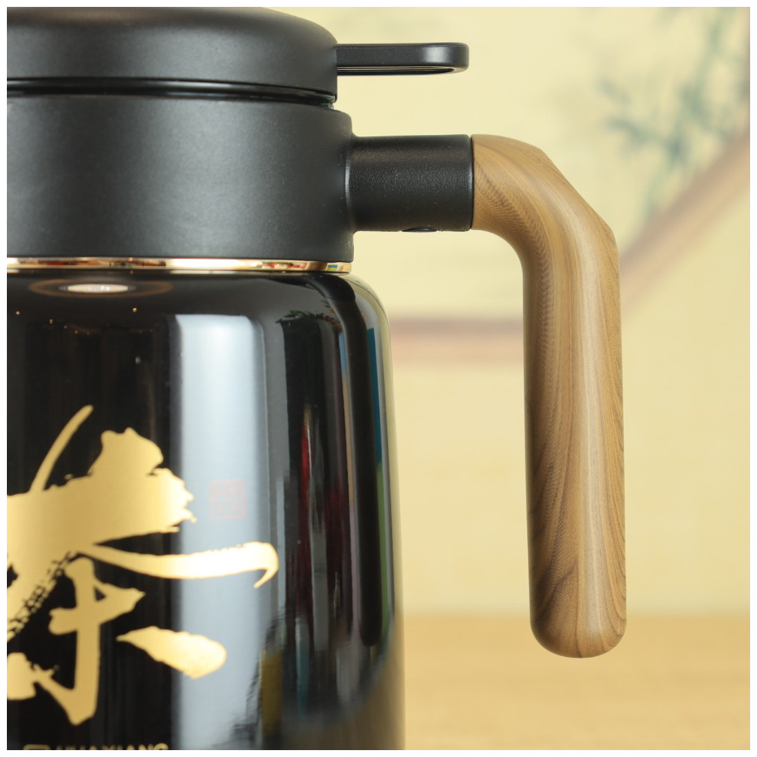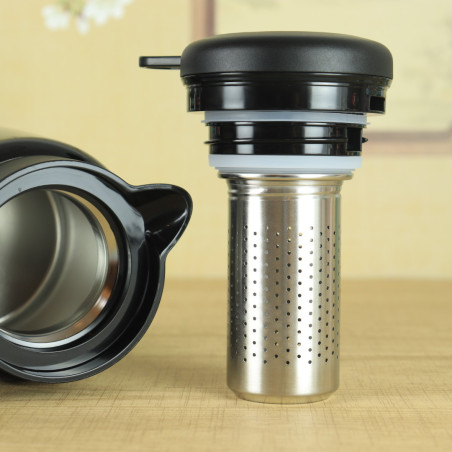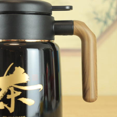 Кришка міцно закручується і не пропускає воду. Вода подається натисканням кнопки. За бажанням можна використовувати фільтр, що викручується, для чаю, тобто заварювання відбуватиметься безпосередньо в термосі. Ручка із приємної пружної гуми із забарвленням "під дерево". На корпусі намальовано ієрогліф "Чай".