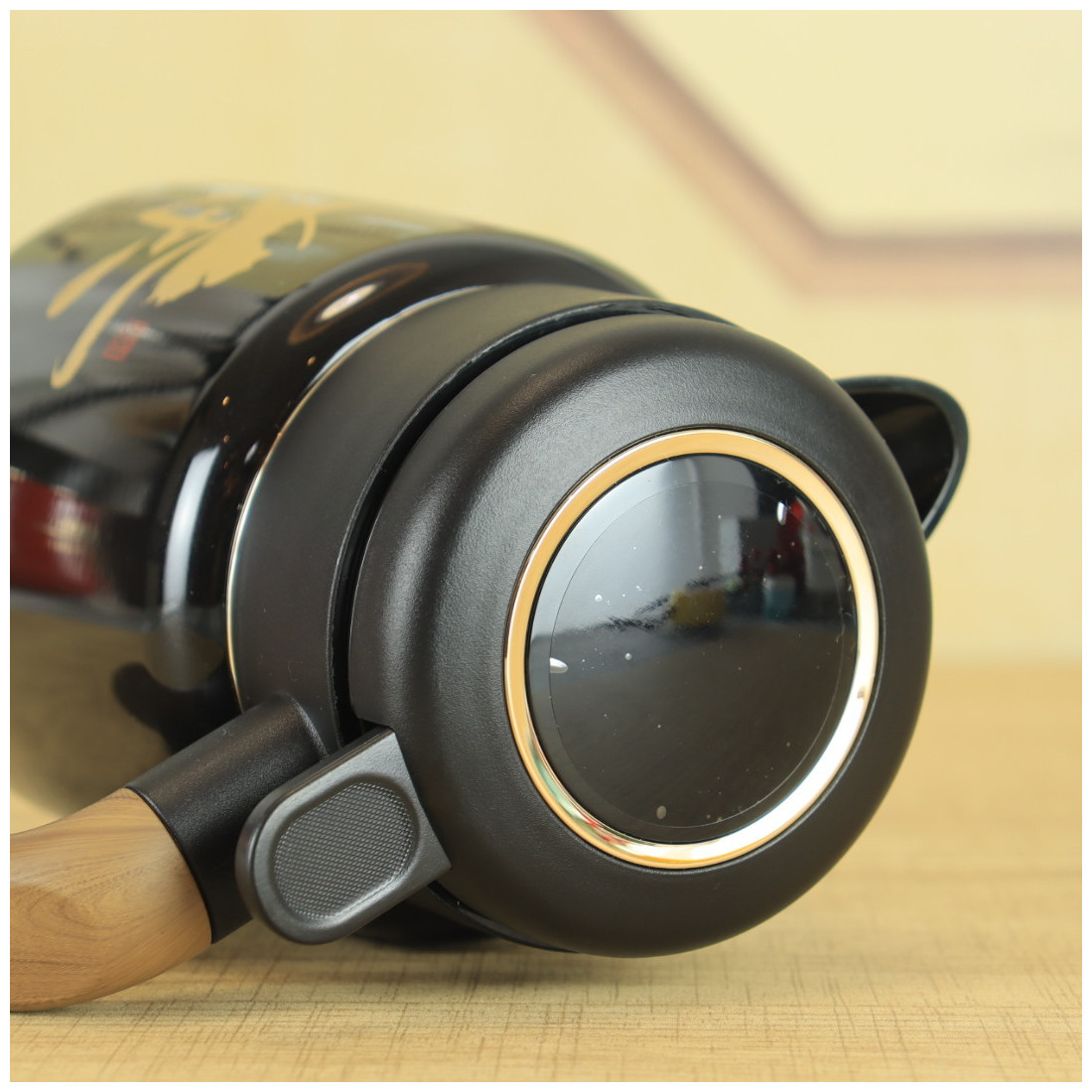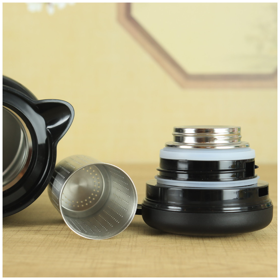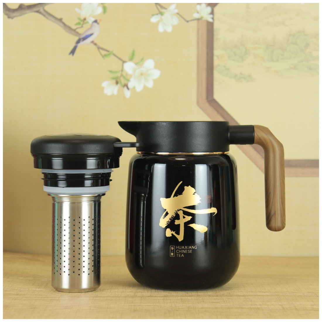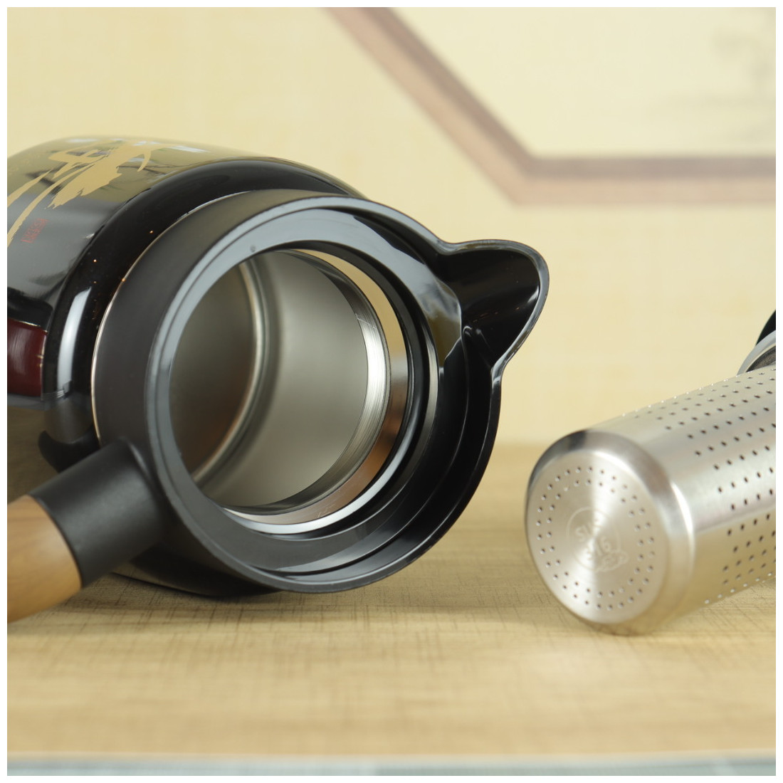 Кришка міцно закручується і не пропускає воду. Вода подається натисканням кнопки. За бажанням можна використовувати фільтр, що викручується, для чаю, тобто заварювання відбуватиметься безпосередньо в термосі. Ручка із приємної пружної гуми із забарвленням "під дерево". На корпусі намальовано ієрогліф "Чай".