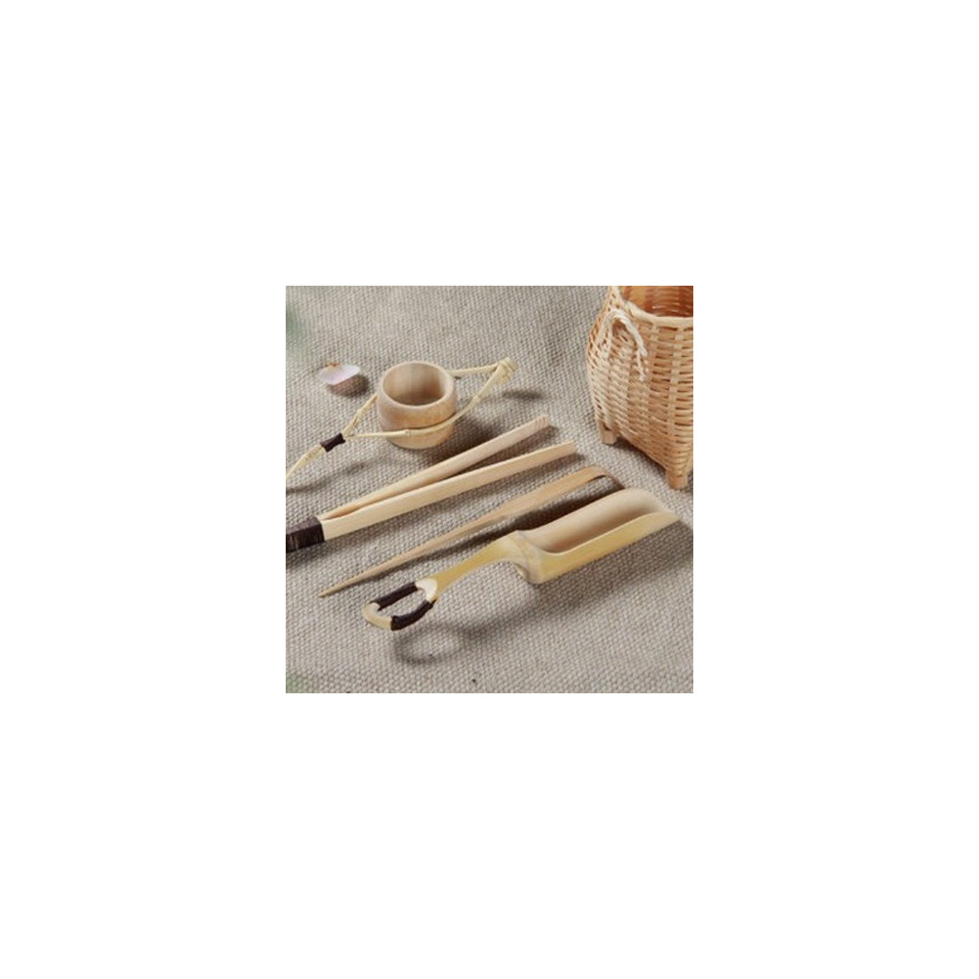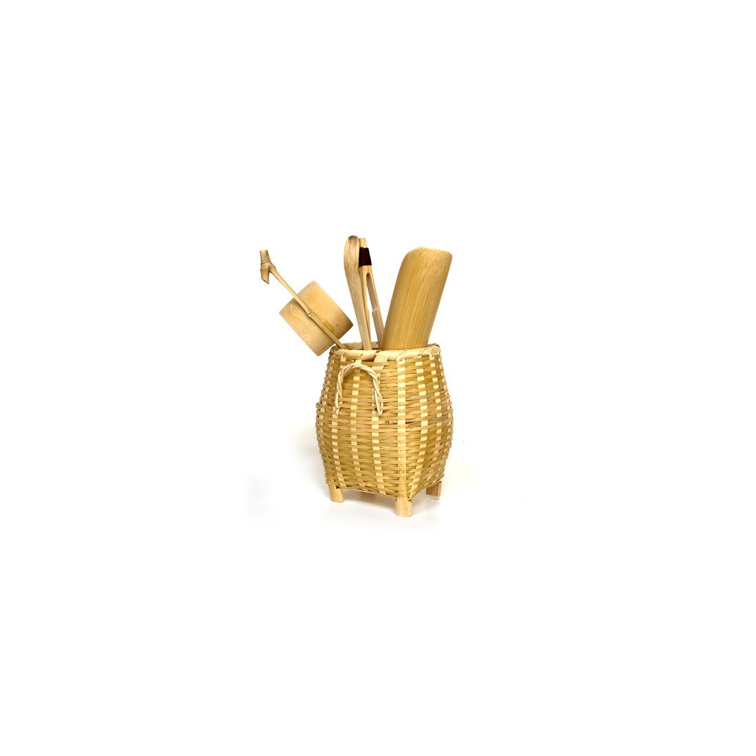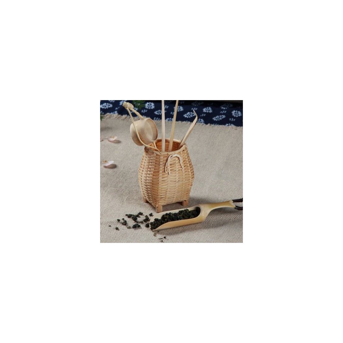 У набір входять 5 предметів: плетений кошик-склянка, ложечка-голка, лопатка, ситечко та щипці.