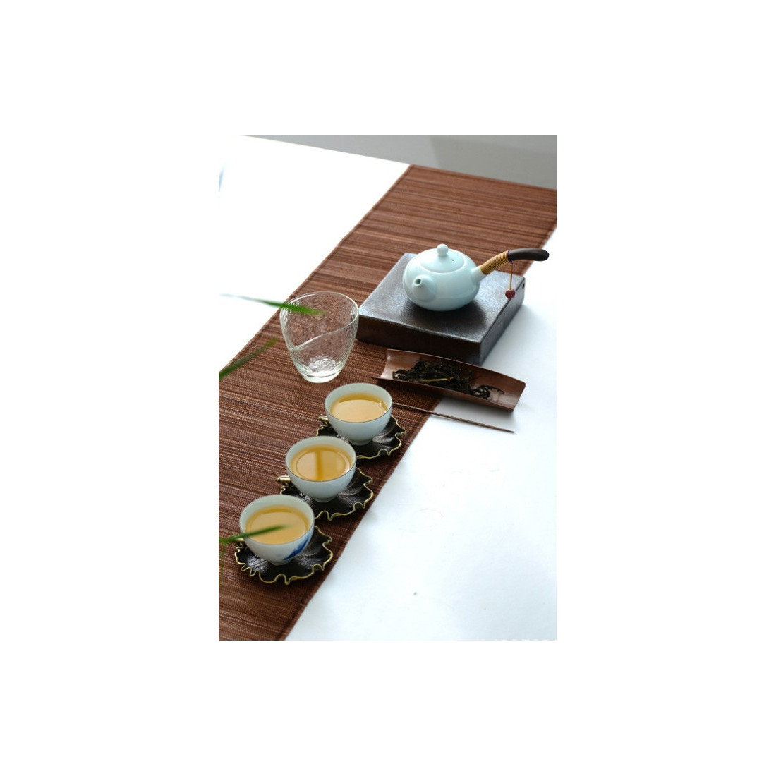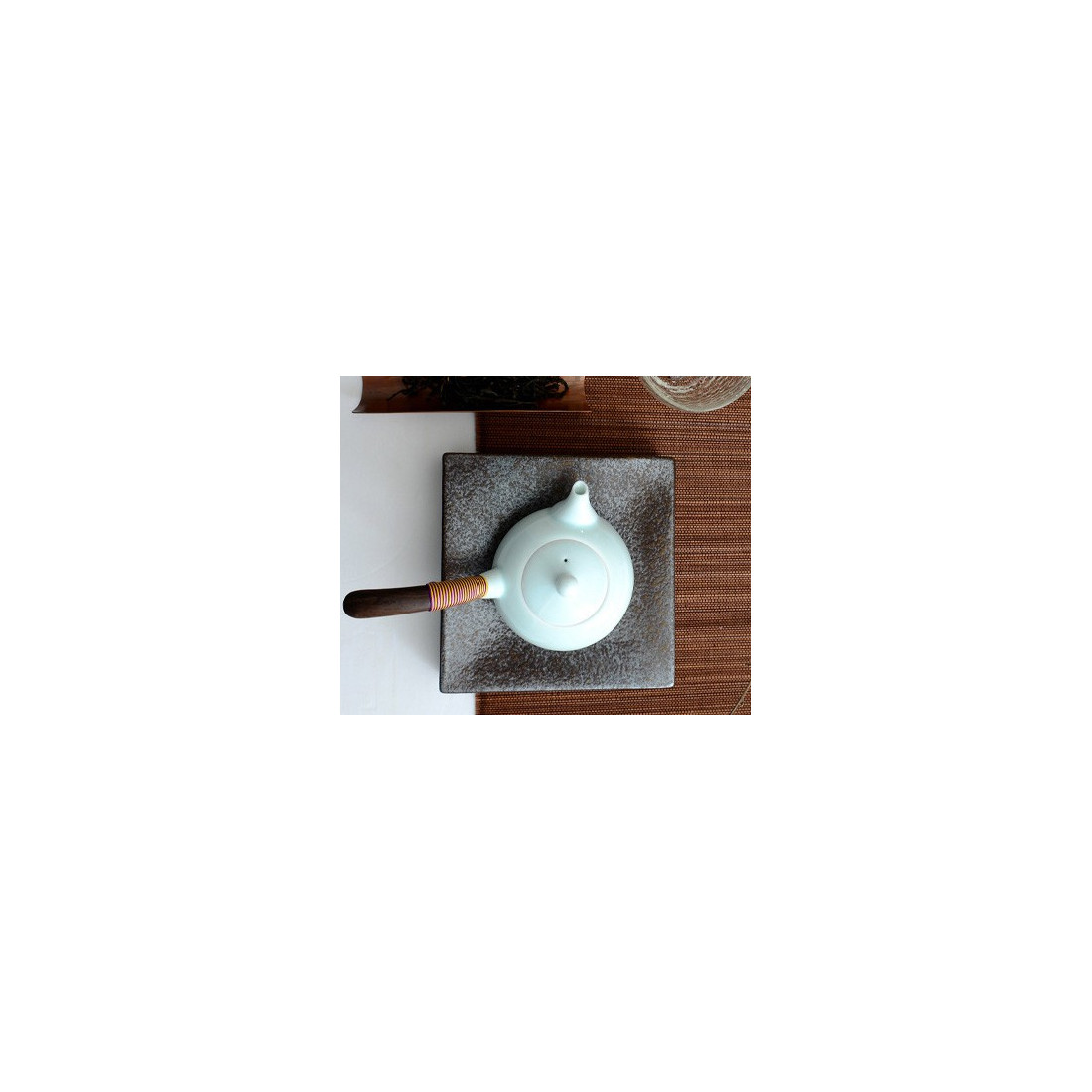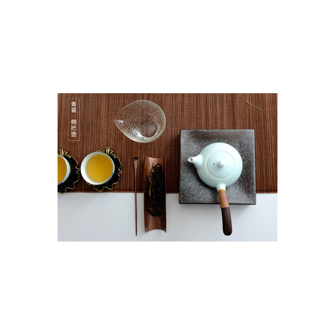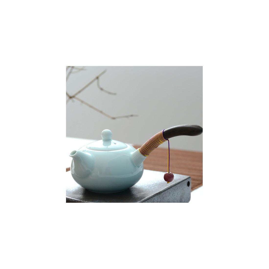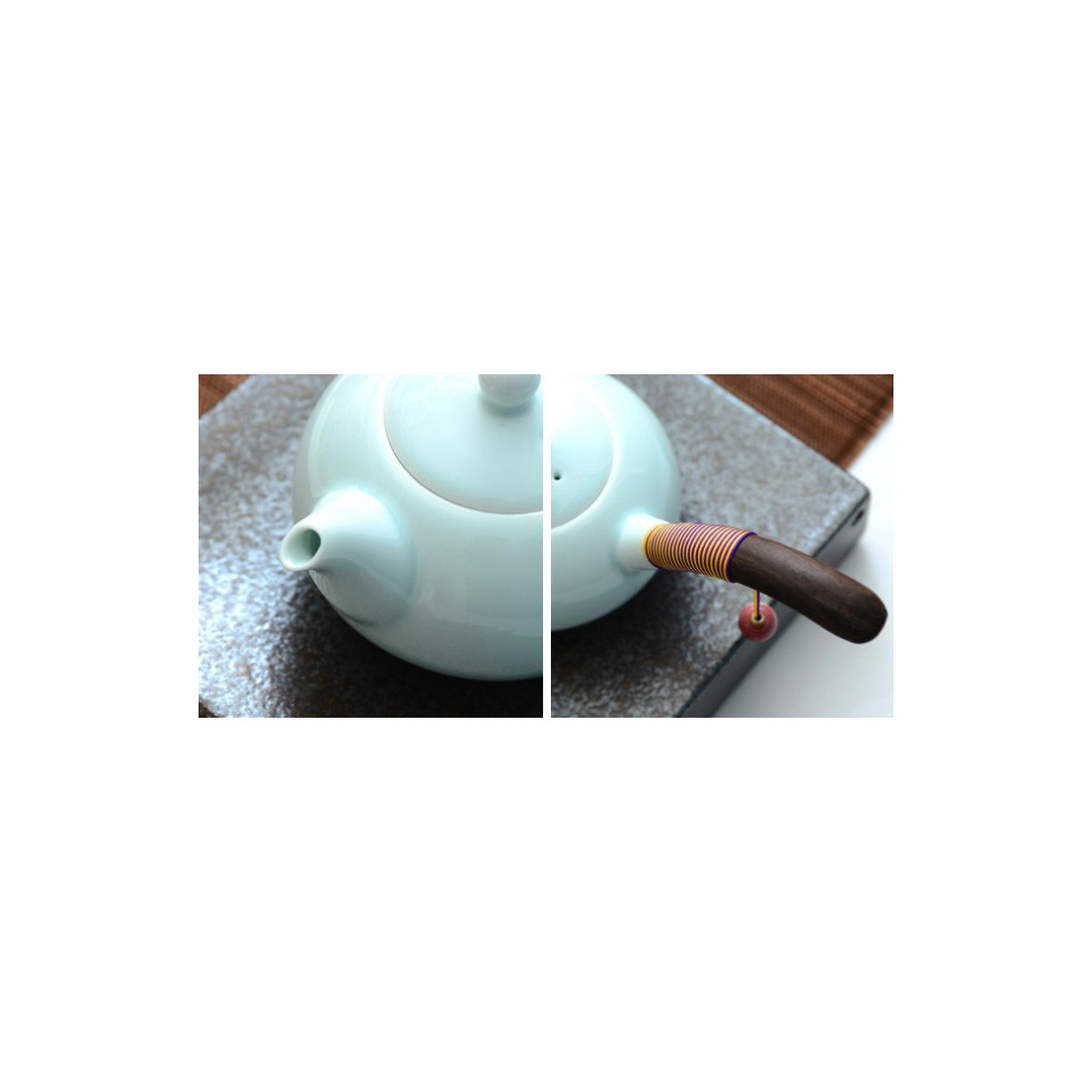 Світло-блакитний фарфоровий чайник лунцюаньського випалу. Ця кераміка відома ще з династії Сун. Досі вважається еталоном витонченості для церемоніального посуду. Порцеляна блідо-блакитного кольору, без малюнка, полонить своєю простотою та вишуканістю. А бічна ручка з чорного дерева ебенового з намистинкою довершує образ досконалості.