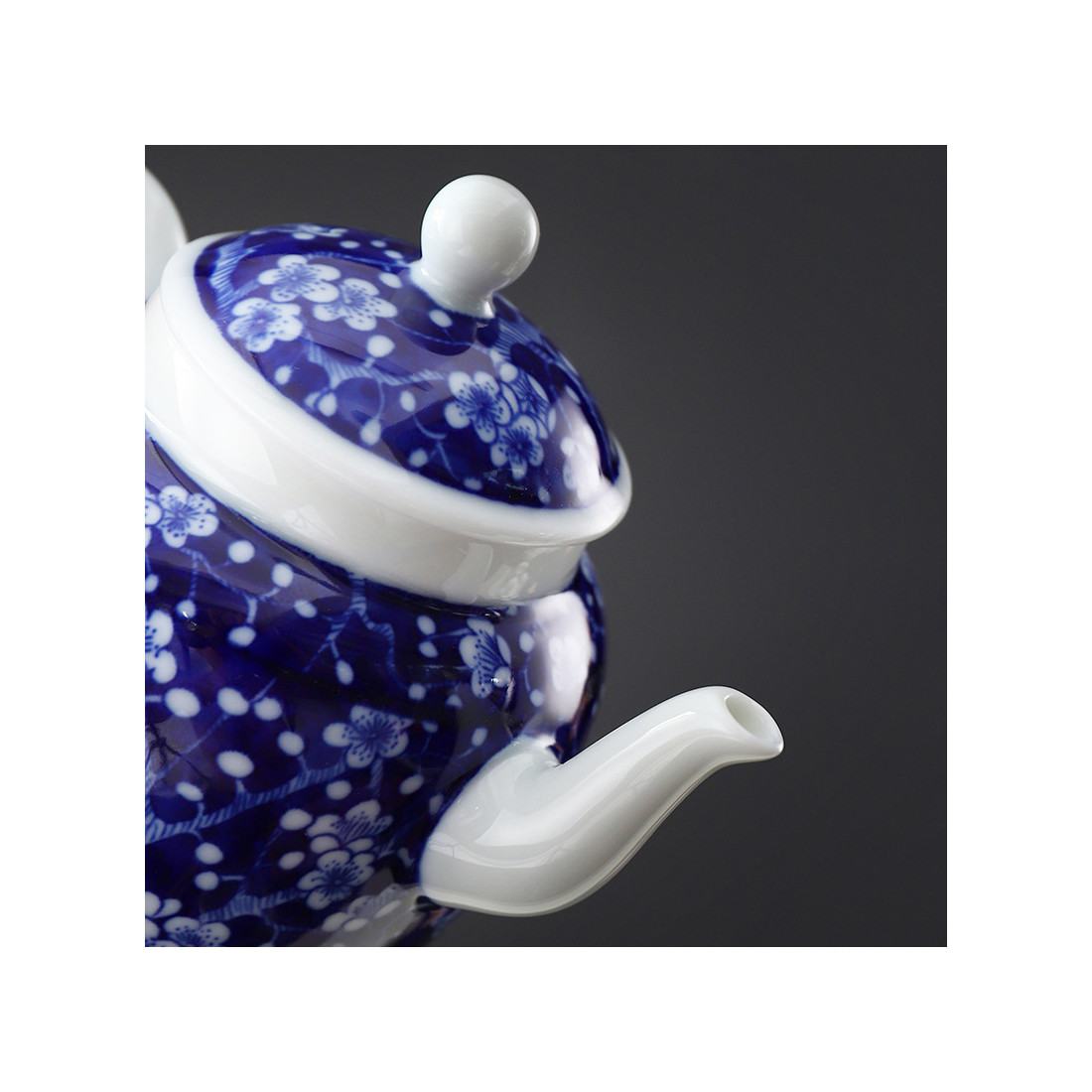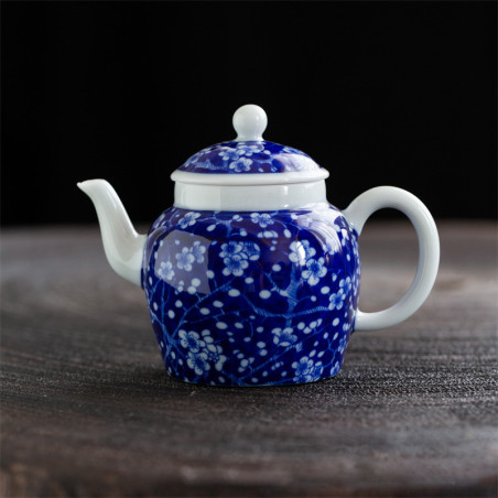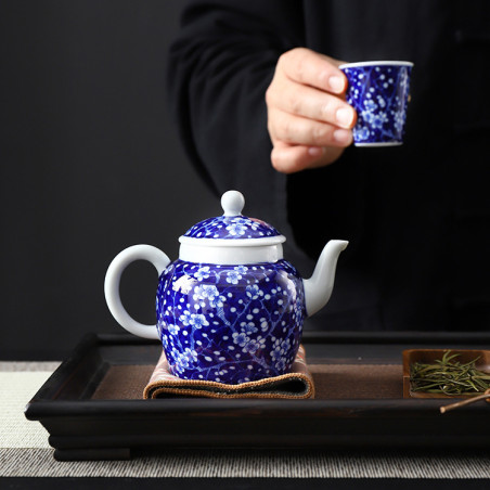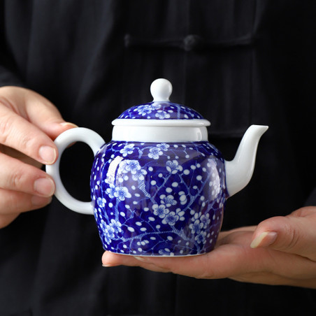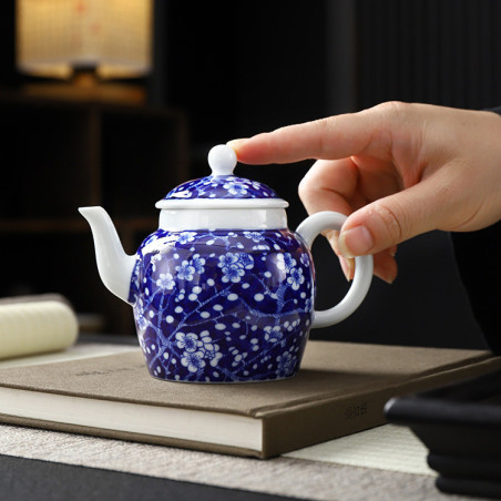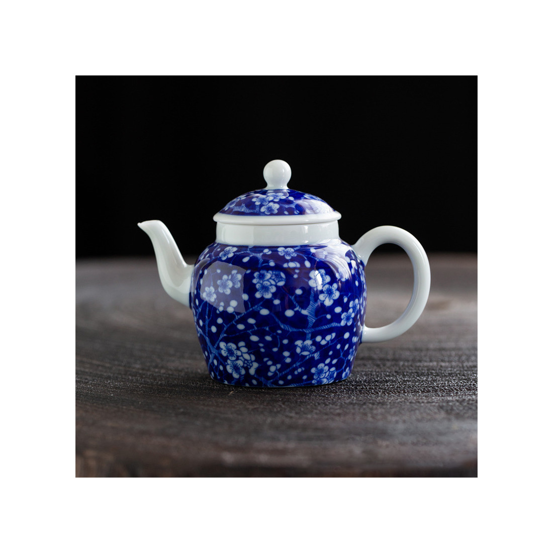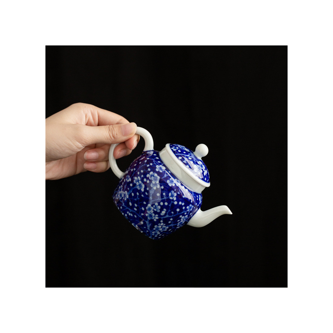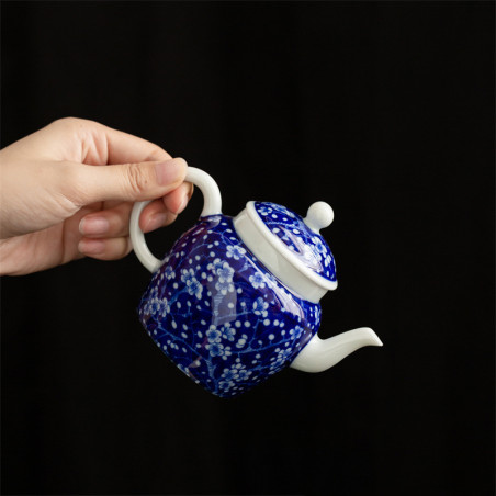 Порцеляновий чайник із зображенням снігової сливи в морозний день. Класичне поєднання білої порцеляни з темно-синім малюнком кобальтом.