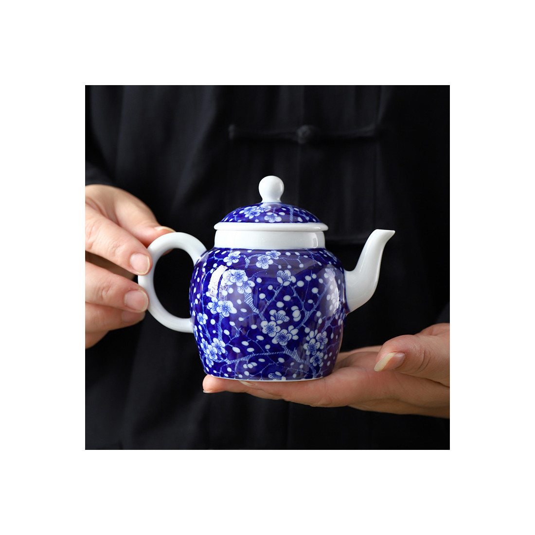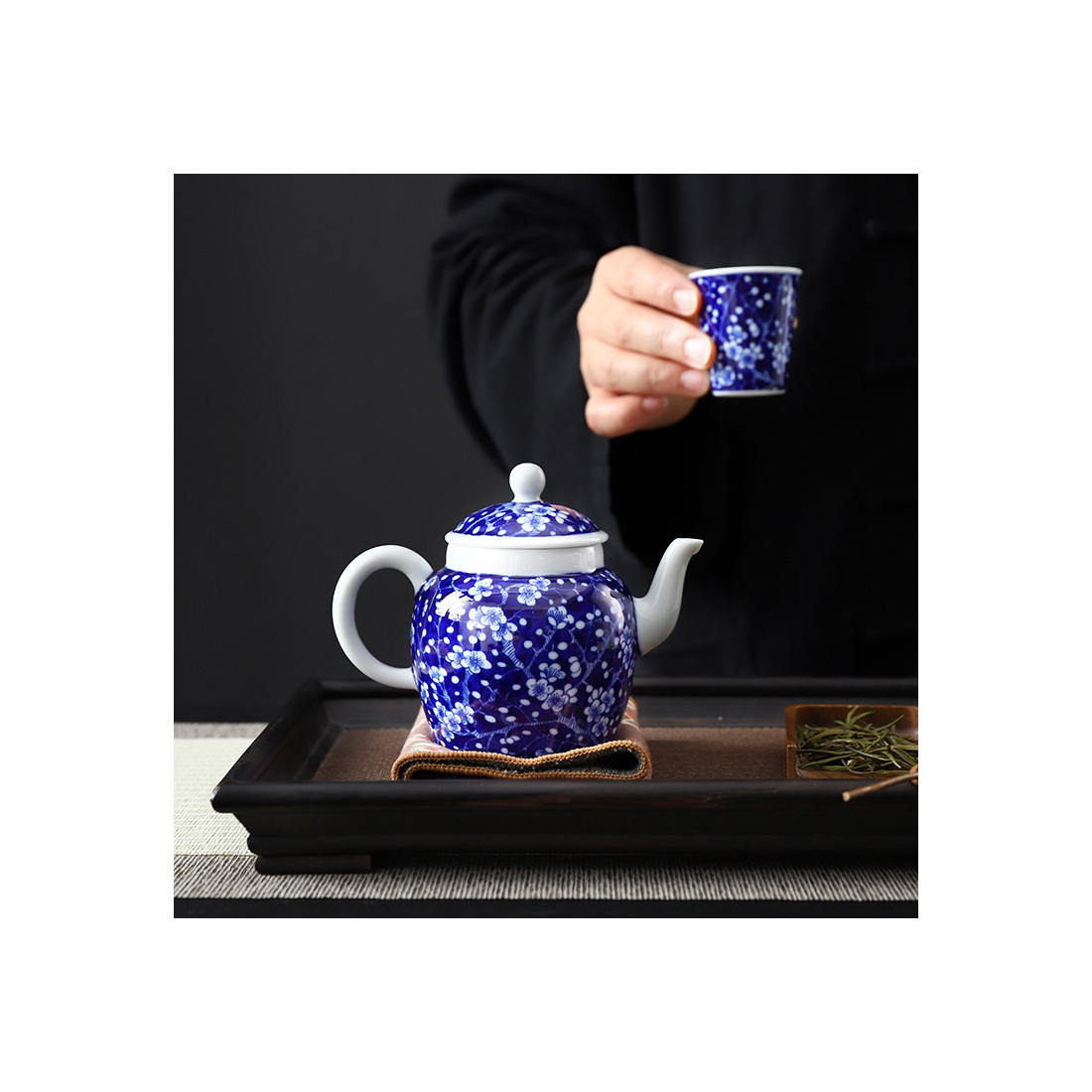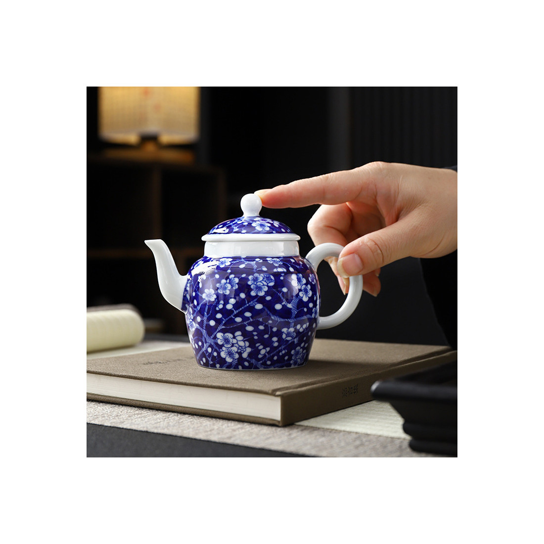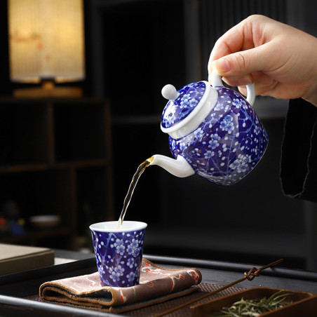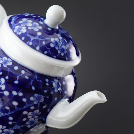 Порцеляновий чайник із зображенням снігової сливи в морозний день. Класичне поєднання білої порцеляни з темно-синім малюнком кобальтом.