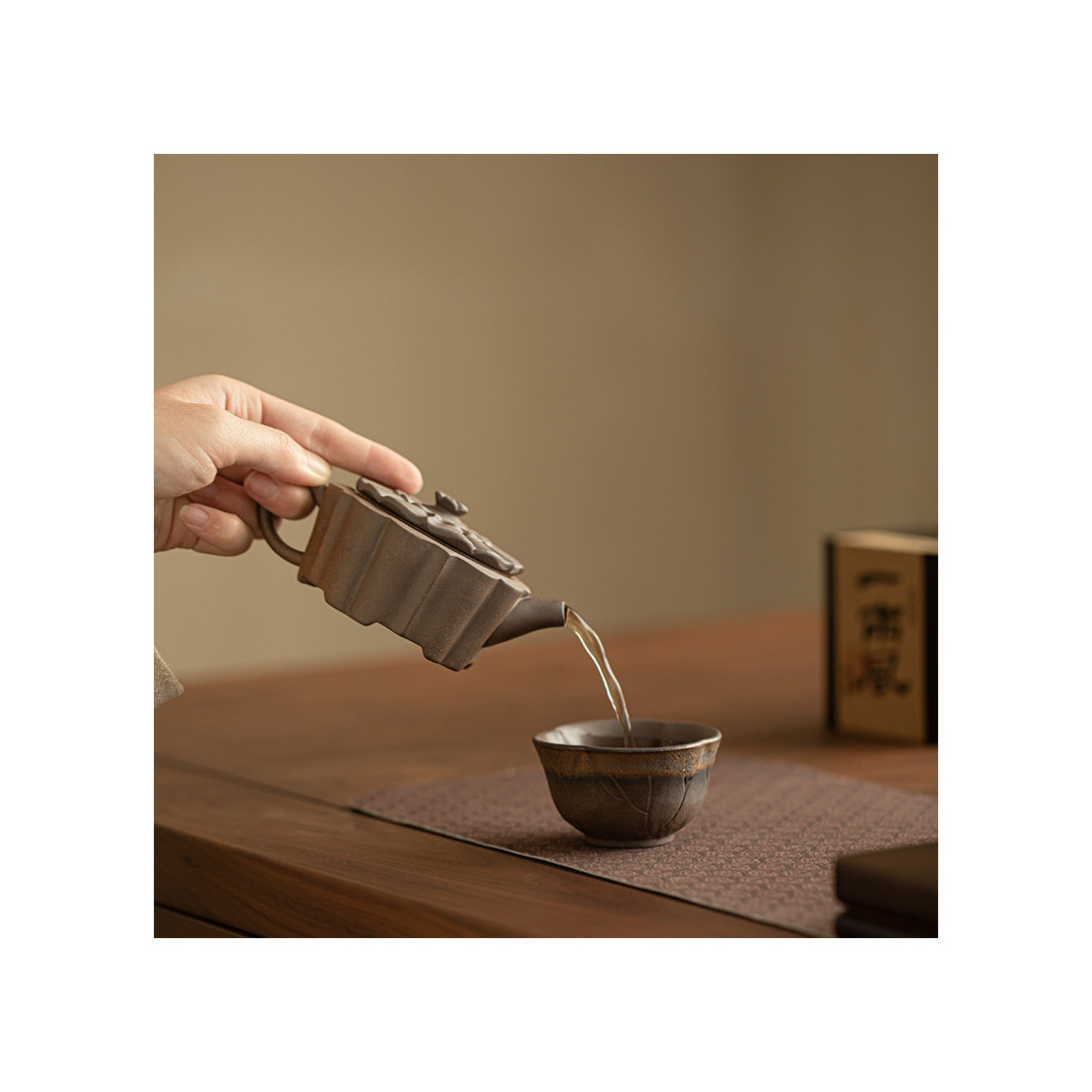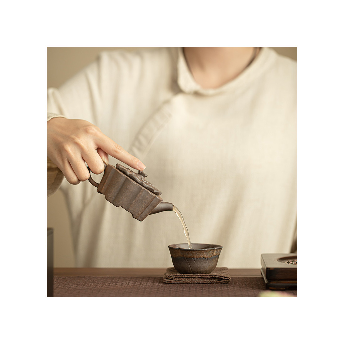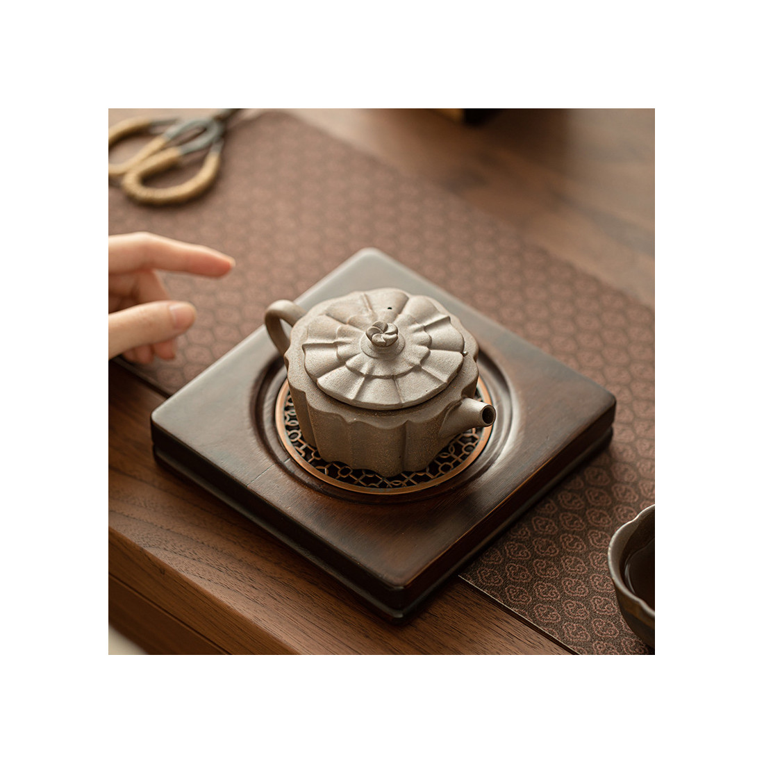 Зручний чайник для заварювання будь-якого чаю. Форма цілком відповідає канонам ліплення їсінських чайників, але використано звичайну глину. Великий отвір дозволяє закласти чай з великого листа, що ідеально підійде для білого чаю або північнофуцзяньських улунів. Шу пуер пофарбує цей чайник, але при правильному догляді, це може зробити його лише красивішим і фактурнішим.