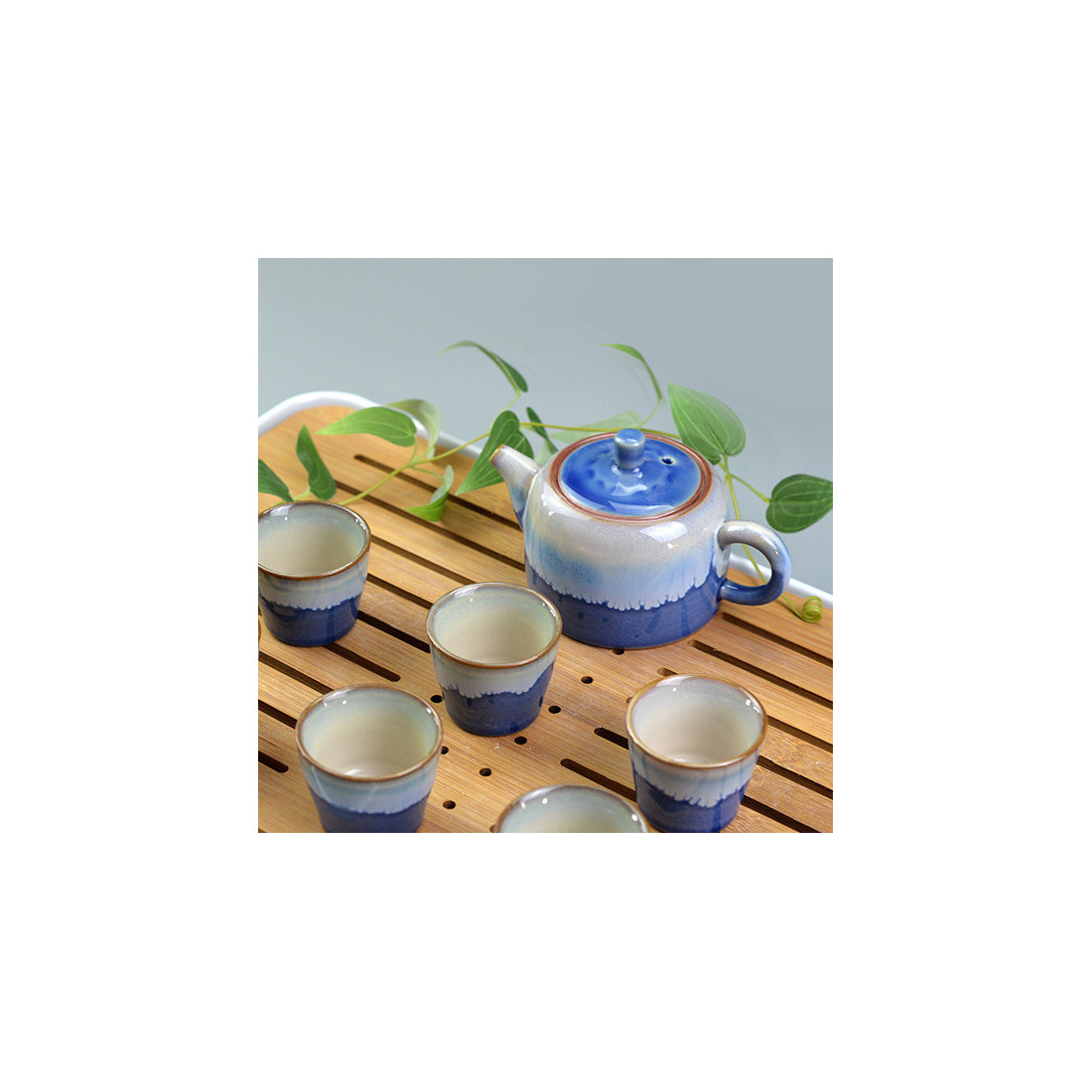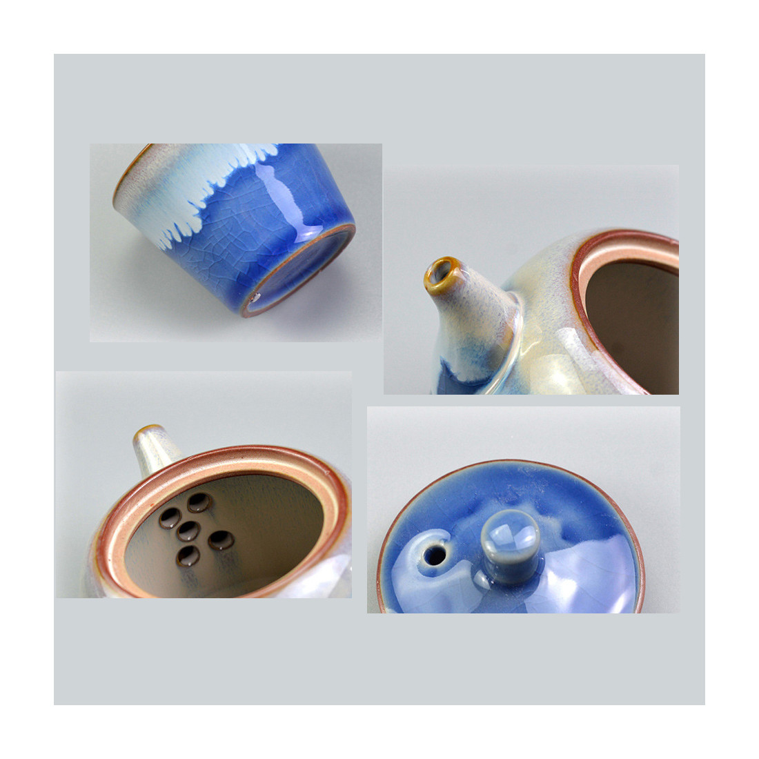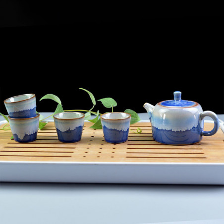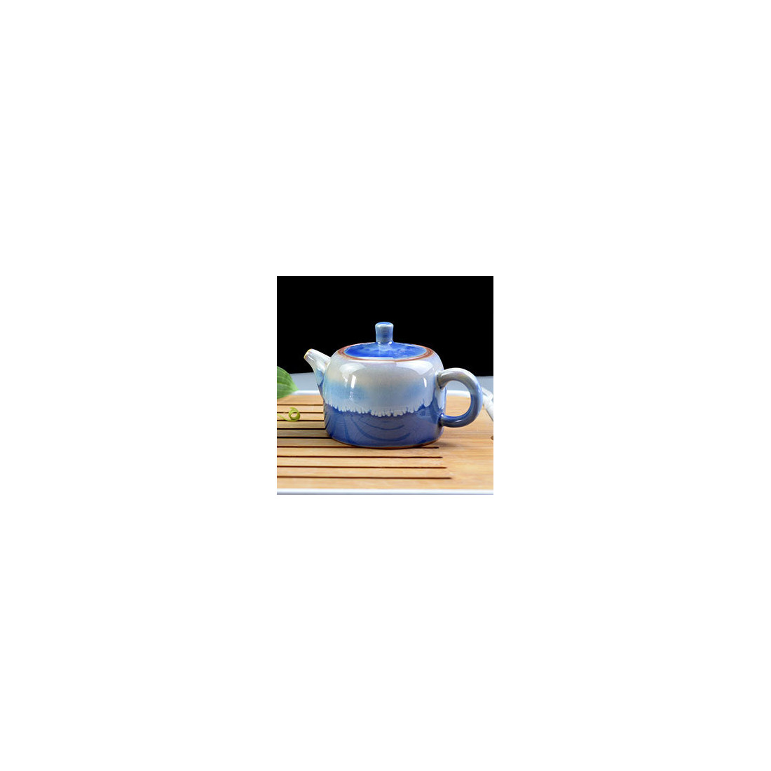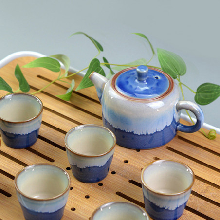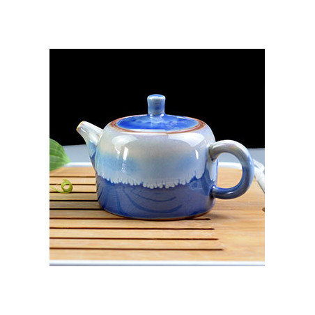 Чайник із двома ефектарними глазурями. Одна глазур синього кольору з тріщинами, що нагадує блакитне небо; друга - блакитно-біла, як хмари.