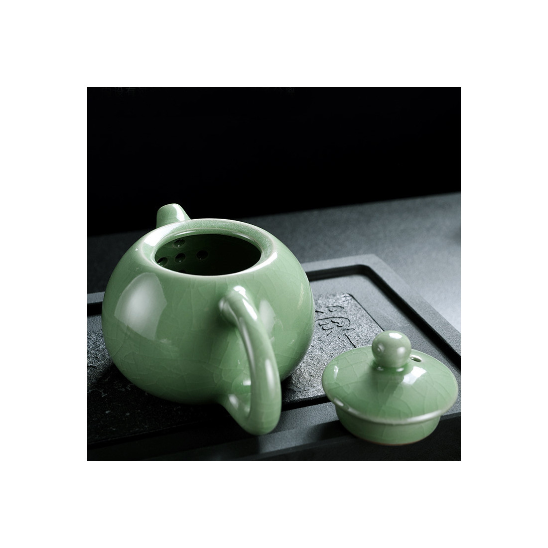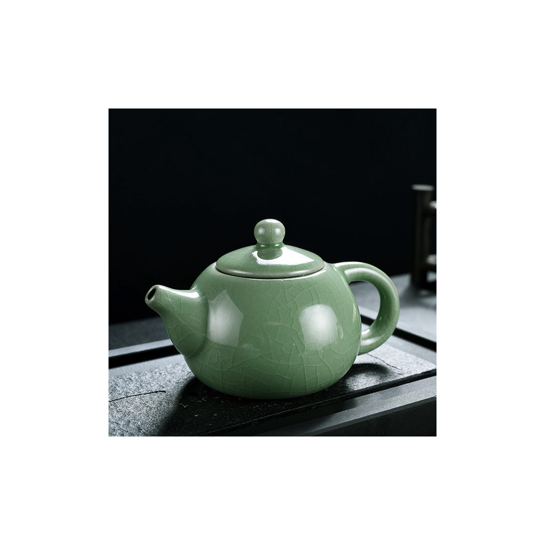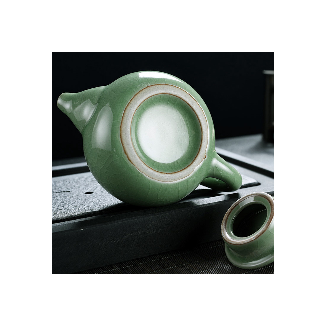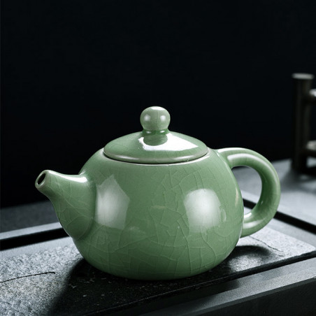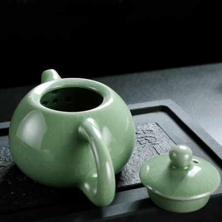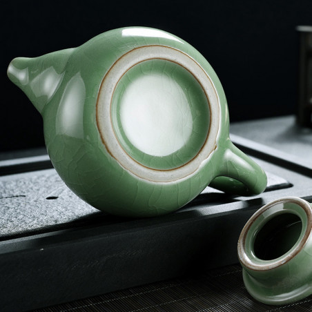 Чайник виконаний з класичної кераміки ґеяо кольору зеленої сливи, форма чайника – Сіши.