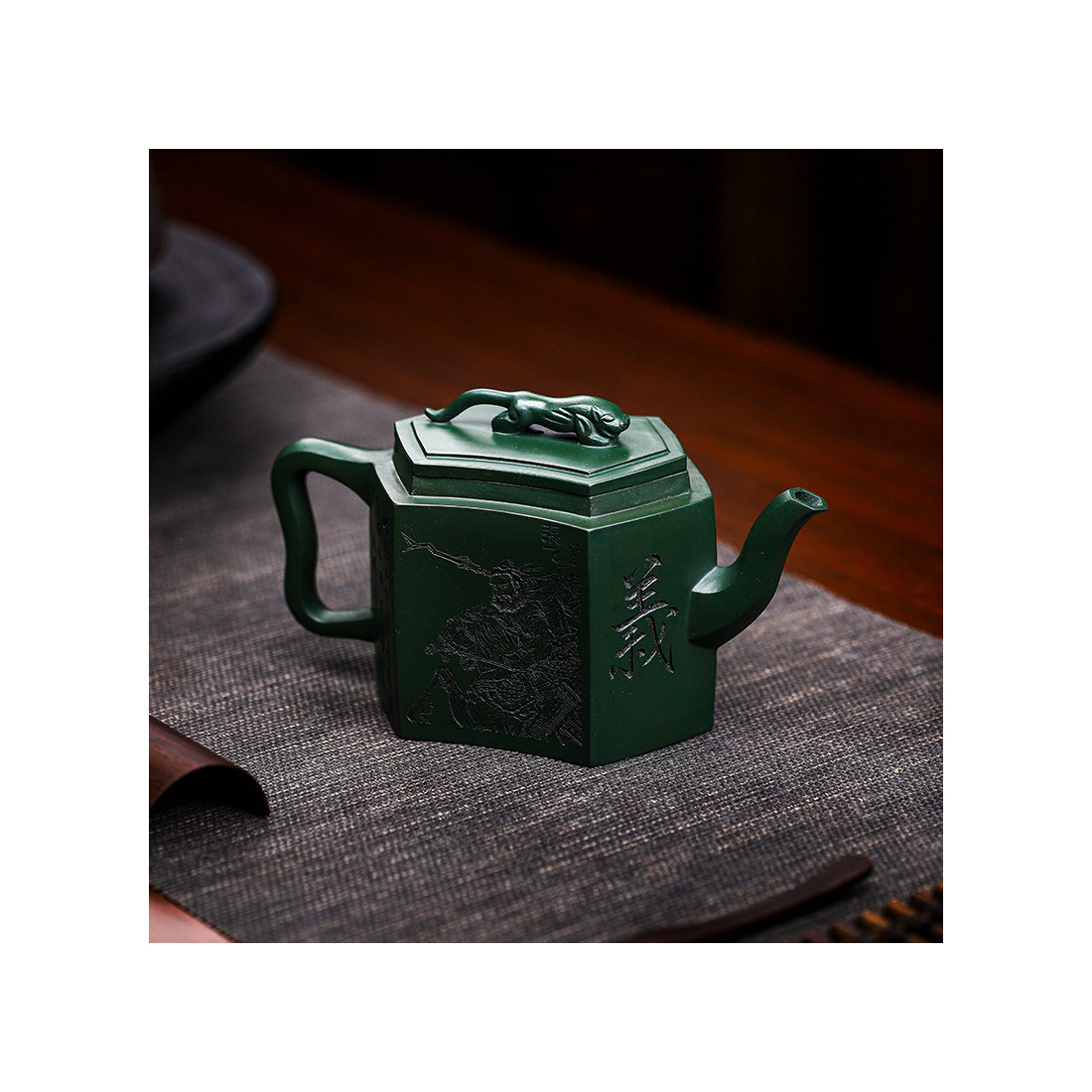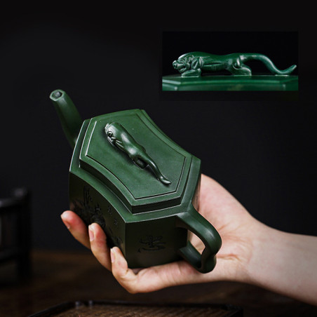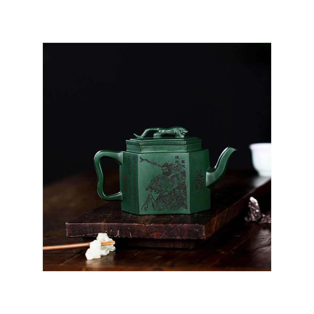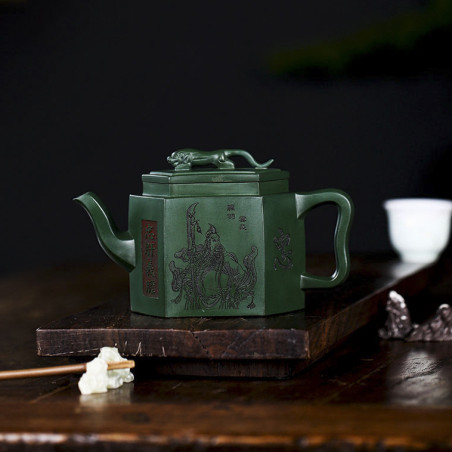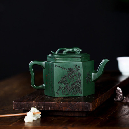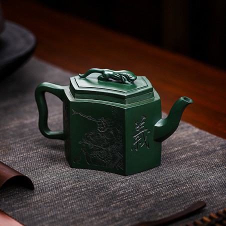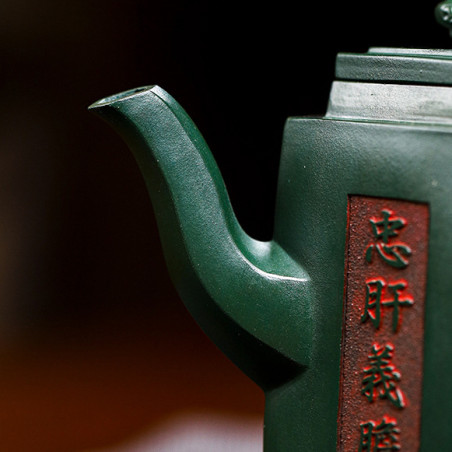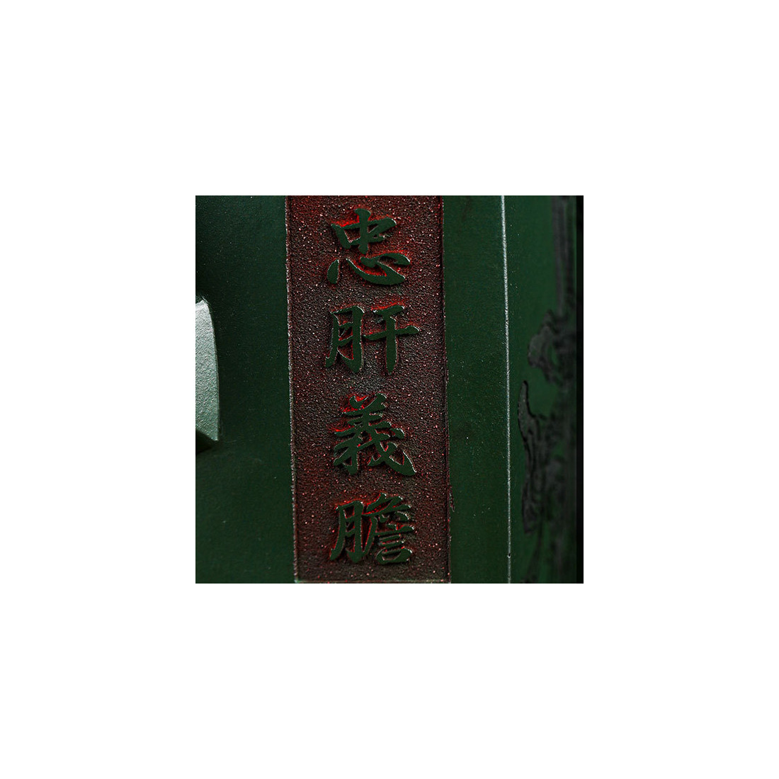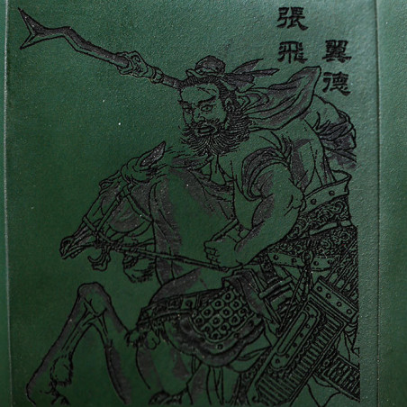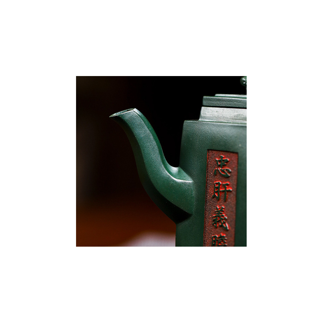Прикрашений зображенням уславлених війн епохи Троєцарства Гуань Юєм та Чжан Феєм. Центральною фразою на чайнику є вираз: Сповнений почуттями вірності та обов'язку. На кришці розміщена фігурка ягуару. Майстер використав рідкісну смарагдову глину з високопористою структурою.