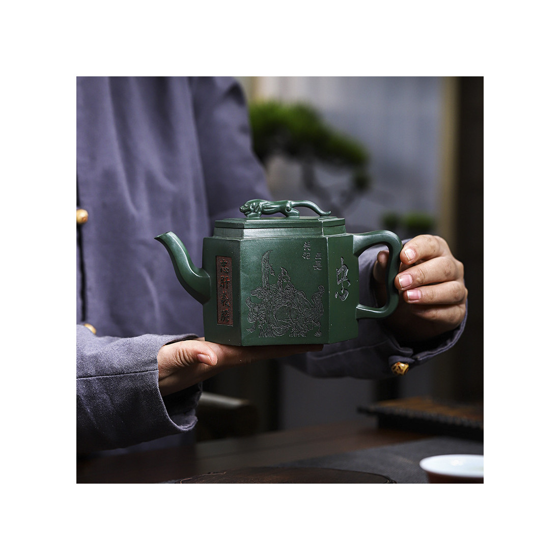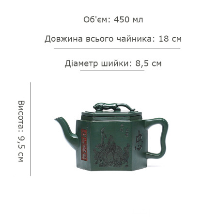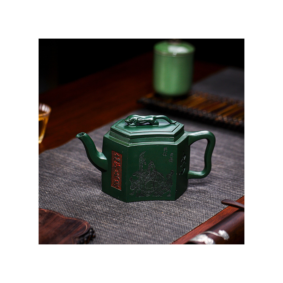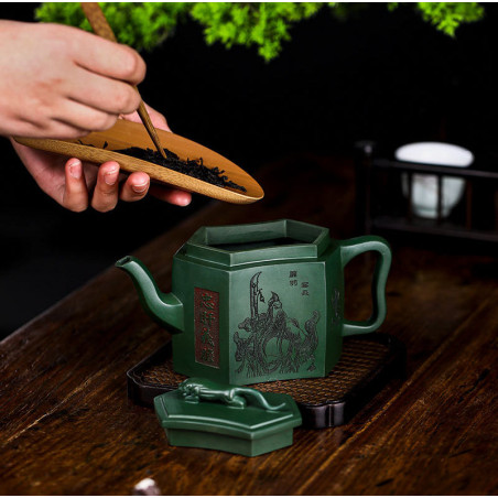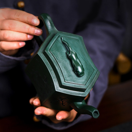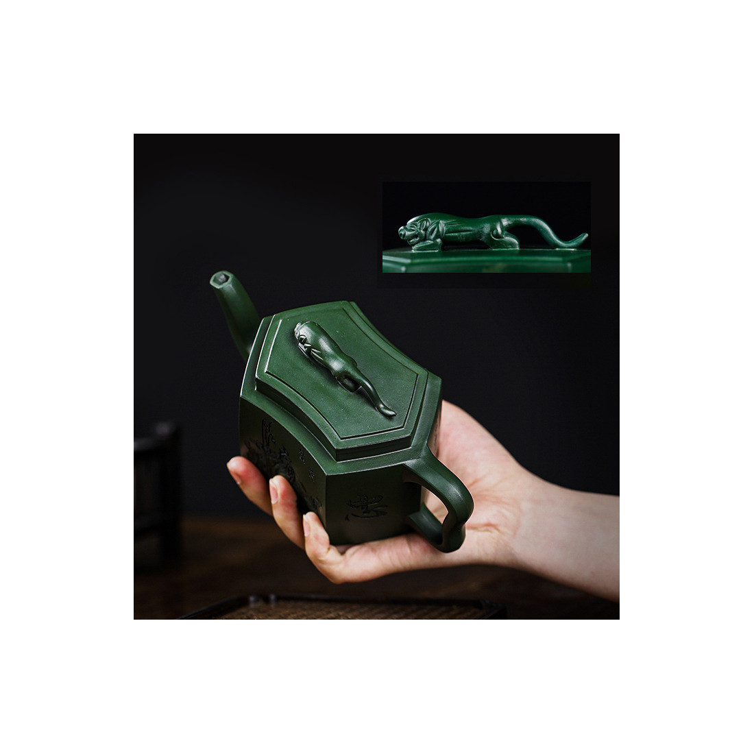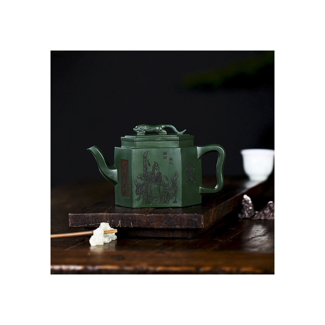 Прикрашений зображенням уславлених війн епохи Троєцарства Гуань Юєм та Чжан Феєм. Центральною фразою на чайнику є вираз: Сповнений почуттями вірності та обов'язку. На кришці розміщена фігурка ягуару. Майстер використав рідкісну смарагдову глину з високопористою структурою.