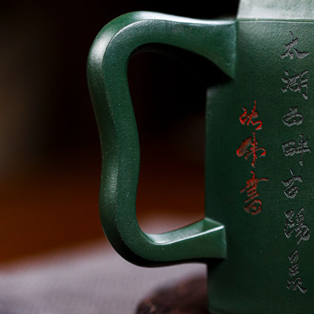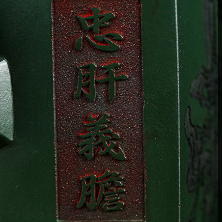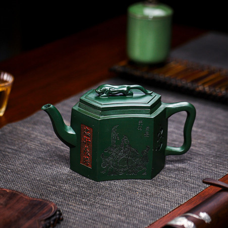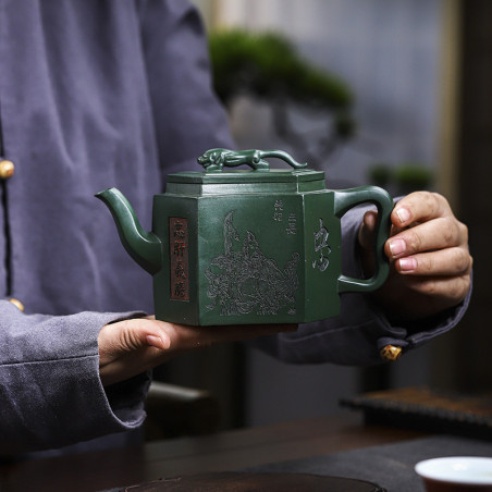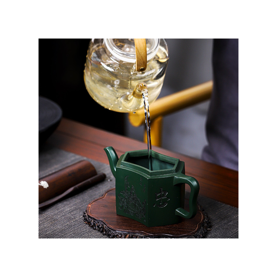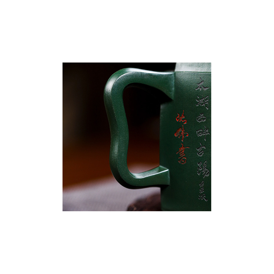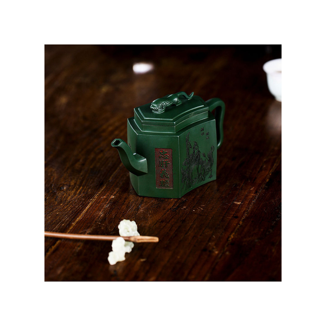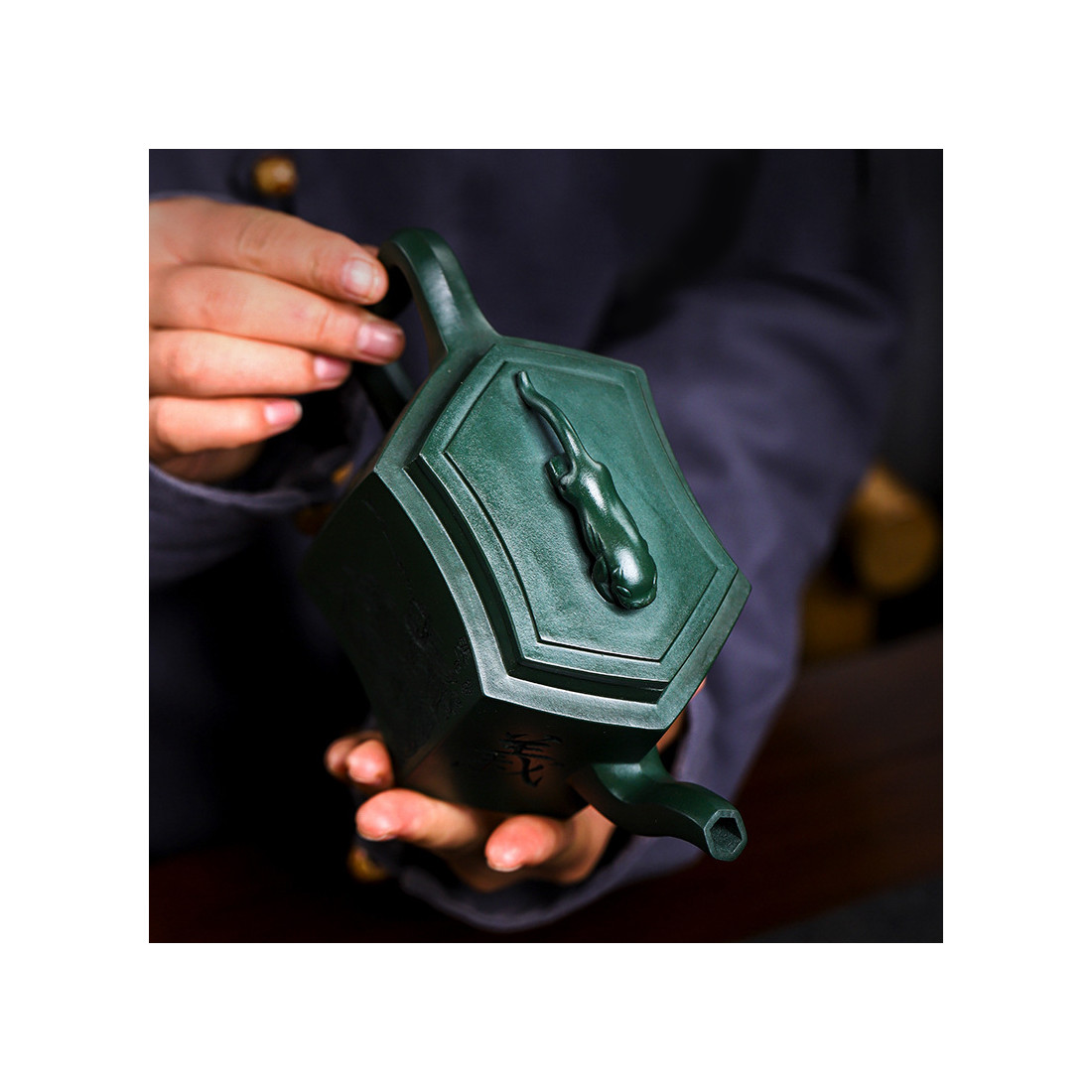 Прикрашений зображенням уславлених війн епохи Троєцарства Гуань Юєм та Чжан Феєм. Центральною фразою на чайнику є вираз: Сповнений почуттями вірності та обов'язку. На кришці розміщена фігурка ягуару. Майстер використав рідкісну смарагдову глину з високопористою структурою.