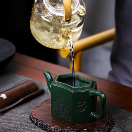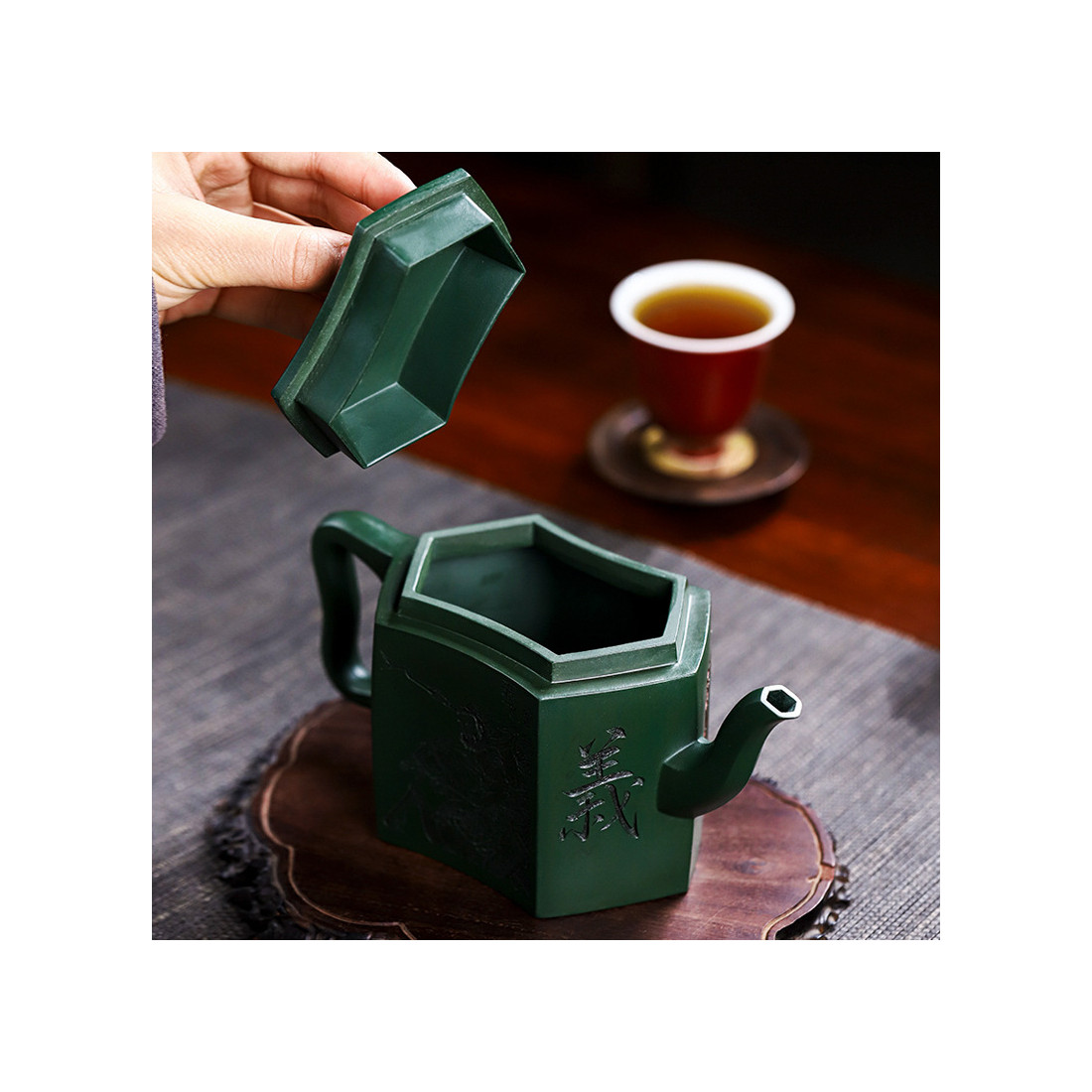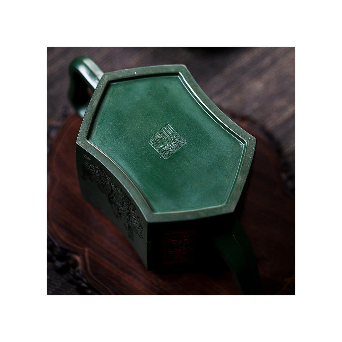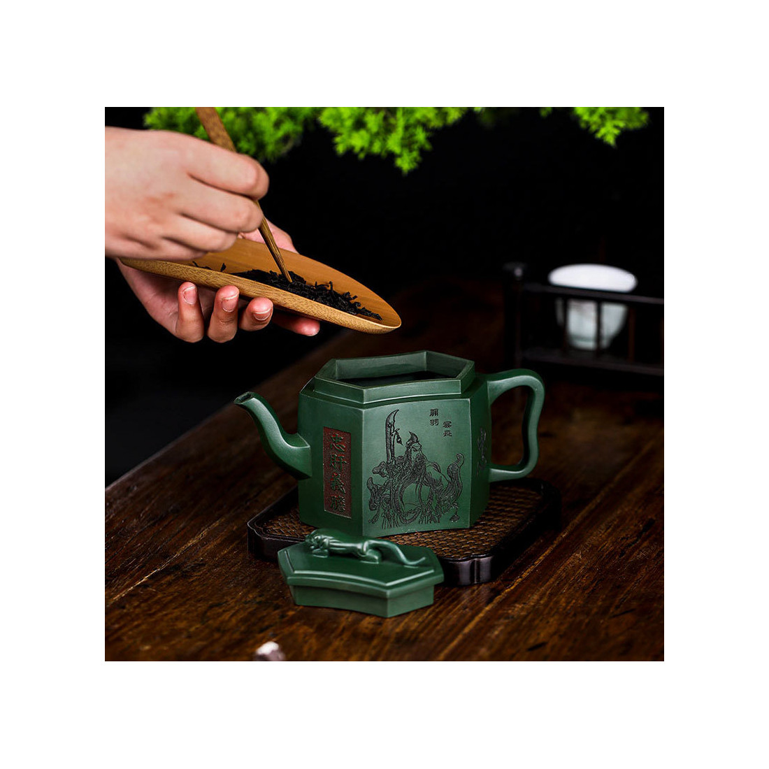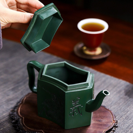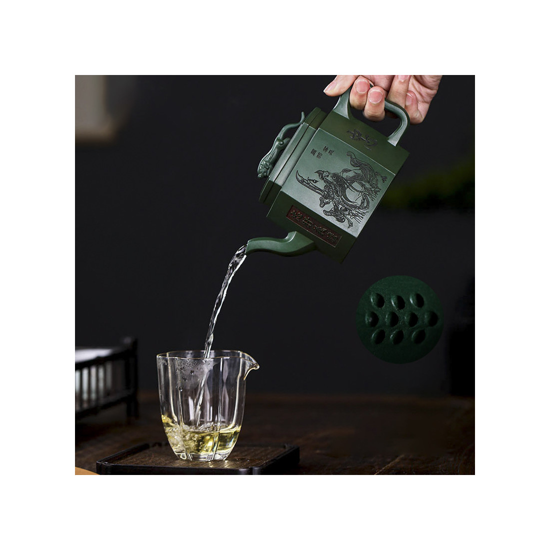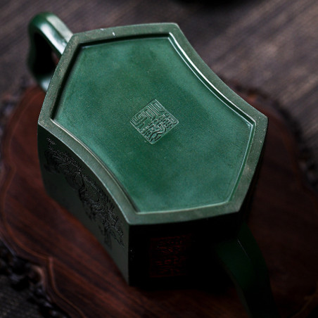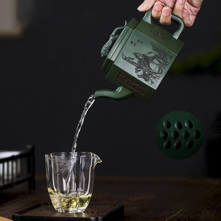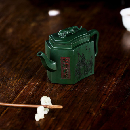 Прикрашений зображенням уславлених війн епохи Троєцарства Гуань Юєм та Чжан Феєм. Центральною фразою на чайнику є вираз: Сповнений почуттями вірності та обов'язку. На кришці розміщена фігурка ягуару. Майстер використав рідкісну смарагдову глину з високопористою структурою.