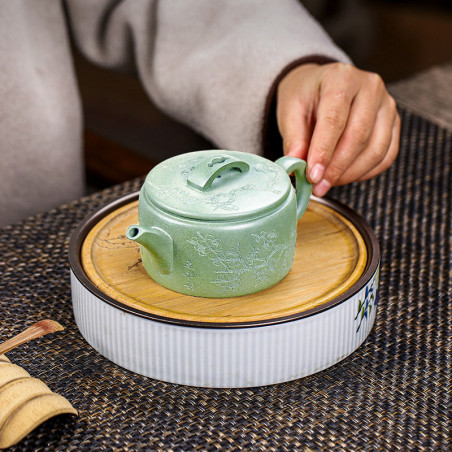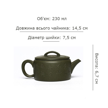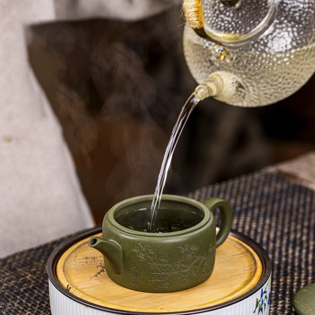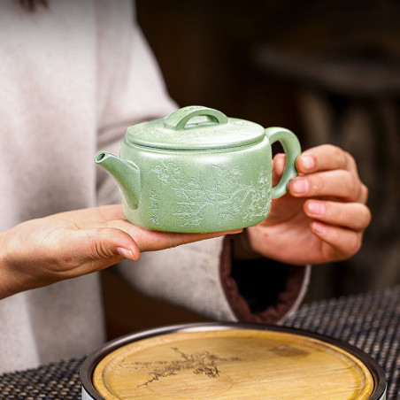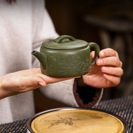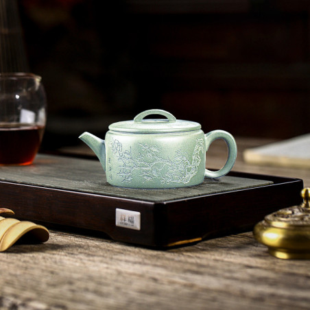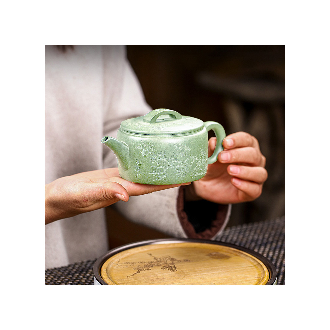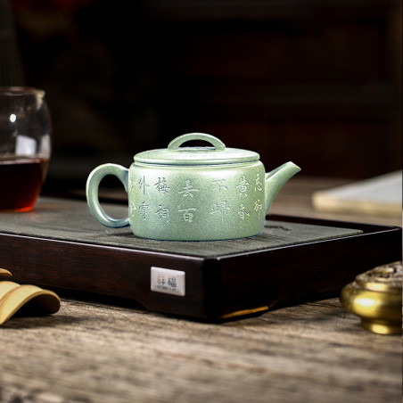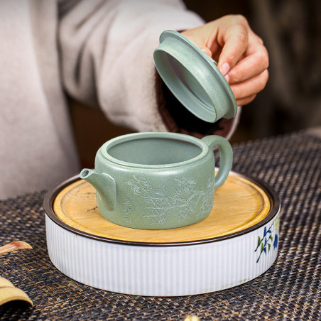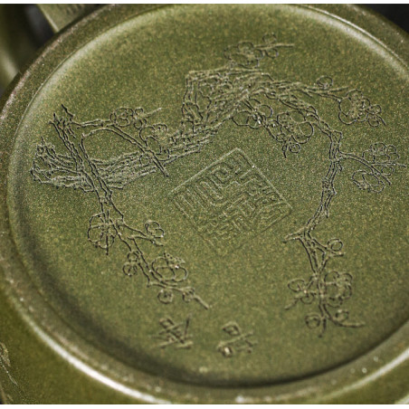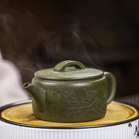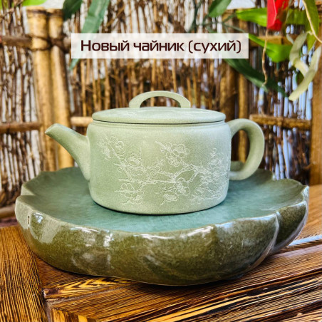 Використання майстром форми чайника "ханьська черепиця" посилює образ, що ми знаходимося поза храмом і милуємося цвітінням та снігом (дрібні вкраплення в глину). Крім того, така форма характеризується широкою шийкою, що дозволяє заварювати в ньому крупнолистовий чай. Майстром було обрано рідкісну персикову зелену глину, завдяки вкрапленням, дуже пористу, яка згодом добре просочиться ароматом чаю. Тому він ідеально підійде під пахучі північнофуцзяньські улуни або данцуни.