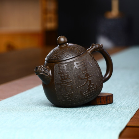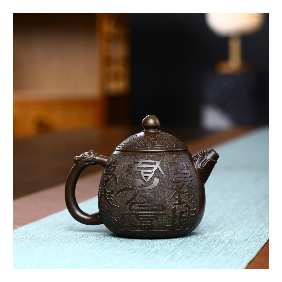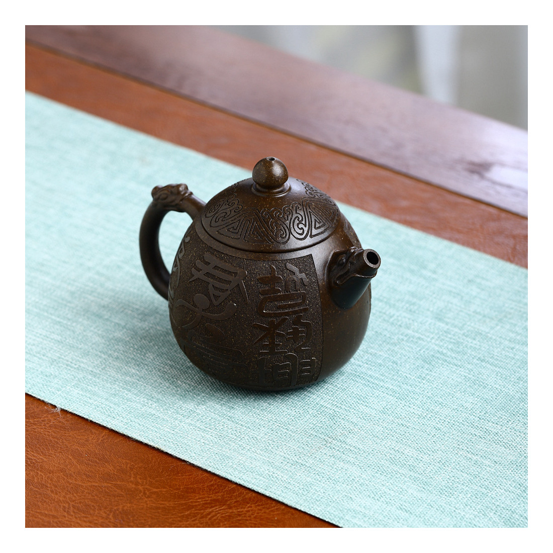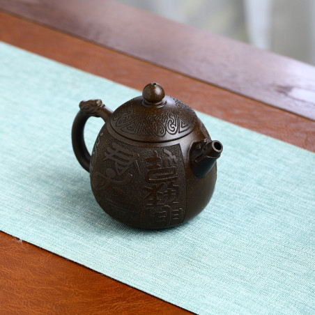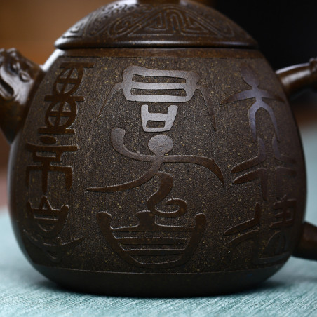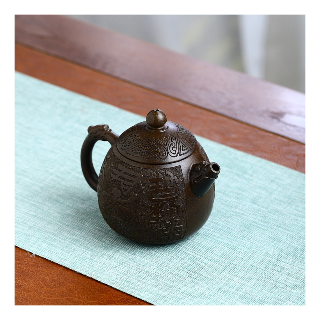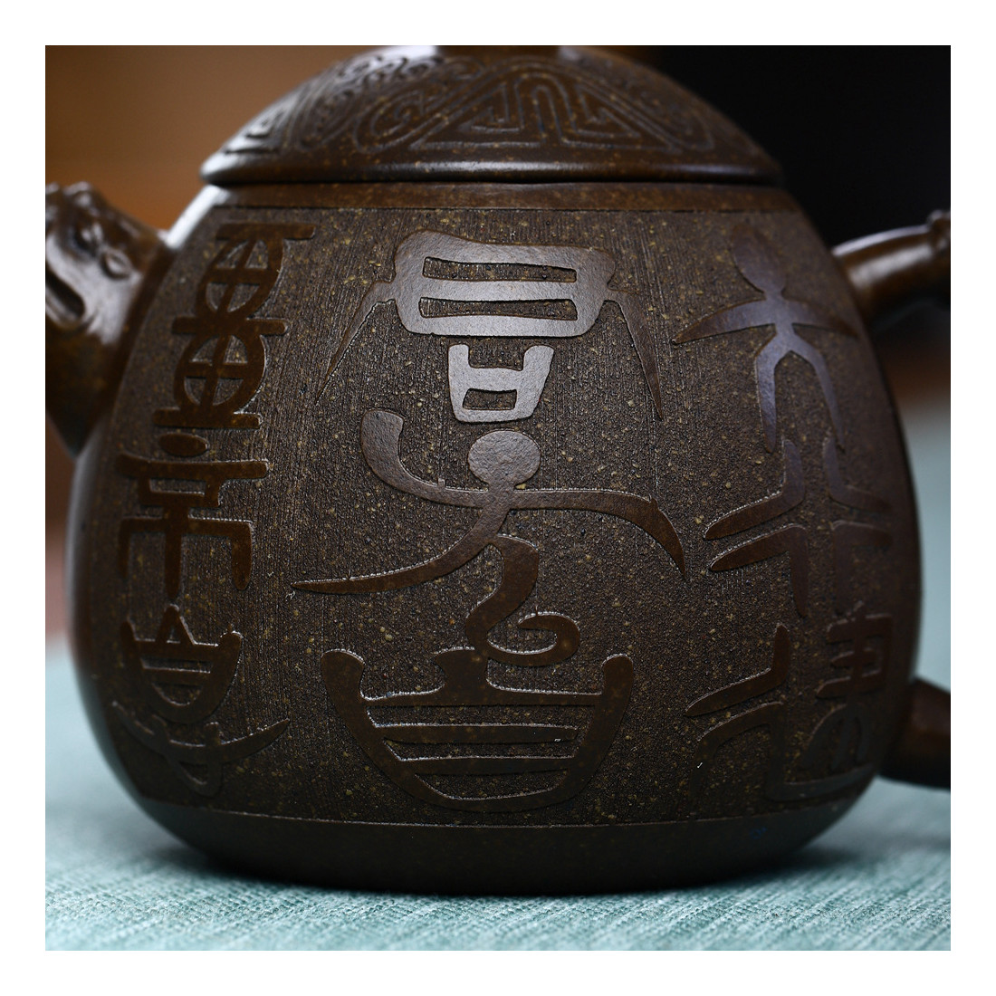 Чайник приємної та універсальної форми "яйце дракона" із глини, що імітує старовинну бронзу. Згодом поверхня напрацюється і стане ще контрастнішою і схожою з металом. До глини автор підібрав оформлення у вигляді старовинних візерунків та написів давніми письменами. У чайнику гарний водяний замок, а також досить вільний та швидкий слив. Чайник чудово підходить для проведення церемоній.