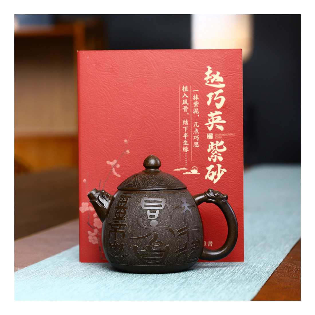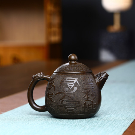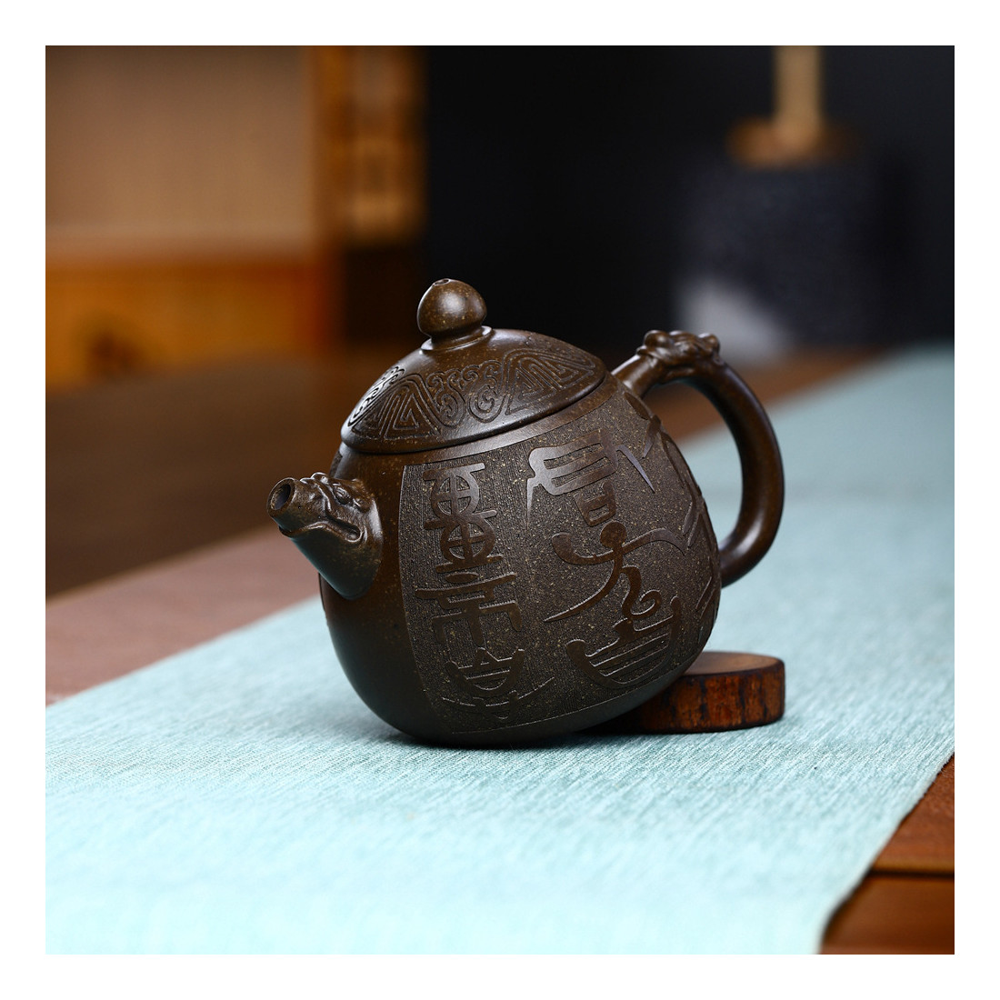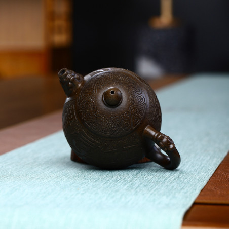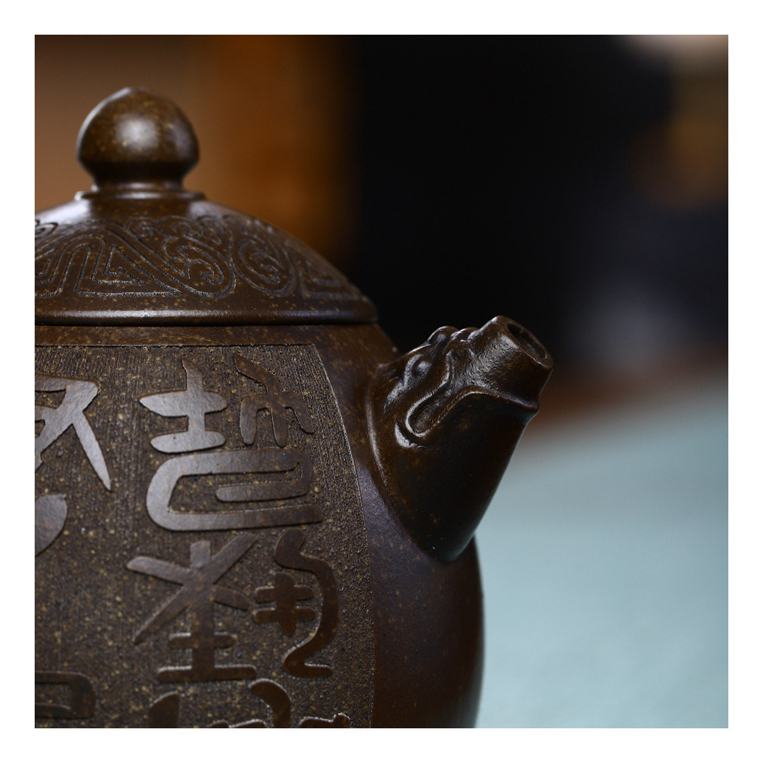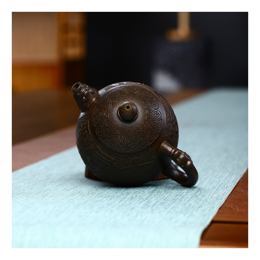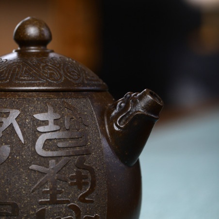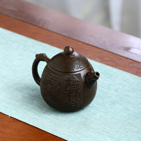 Чайник приємної та універсальної форми "яйце дракона" із глини, що імітує старовинну бронзу. Згодом поверхня напрацюється і стане ще контрастнішою і схожою з металом. До глини автор підібрав оформлення у вигляді старовинних візерунків та написів давніми письменами. У чайнику гарний водяний замок, а також досить вільний та швидкий слив. Чайник чудово підходить для проведення церемоній.