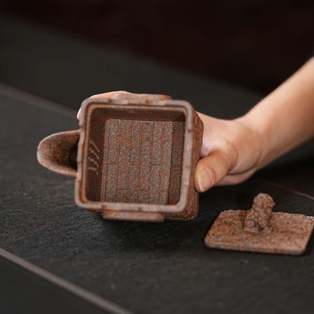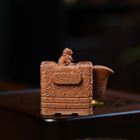 Незвичайний і дуже зручний чайник, що представляє сучасний дизайн їсінських чайників. По-перше використана модифікована їсінська глина, яка отримала назву "Золотий пісок із драконячої кістки". Обпалюється за дуже високої температури навіть для їсінських чайників — 1400 °C. При спіканні частинок чайник стає менш пористим і набуває гучної міцної поверхні. Утворюється гарний помаранчевий колір, що візуально нагадує суміш великих фракцій фіолетової глини із золотом. По-друге, чайник виготовлений без класичної ручки. Замість неї з обох боків розміщені ручки-кнопки у вигляді хмари. А носик широкий із швидким зливом. Таку форму часто називаємо чайник-гайвань, тому що тіло чайника охоплюється рукою і ми самі можемо контролювати швидкість зливу настою.