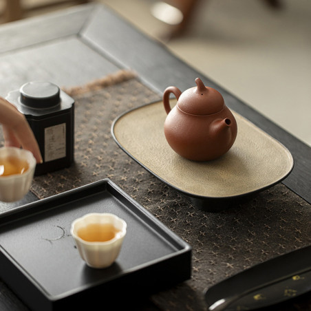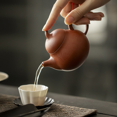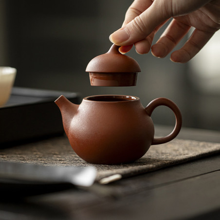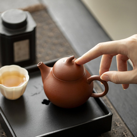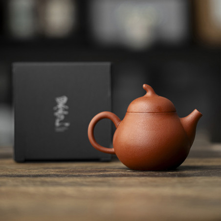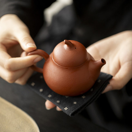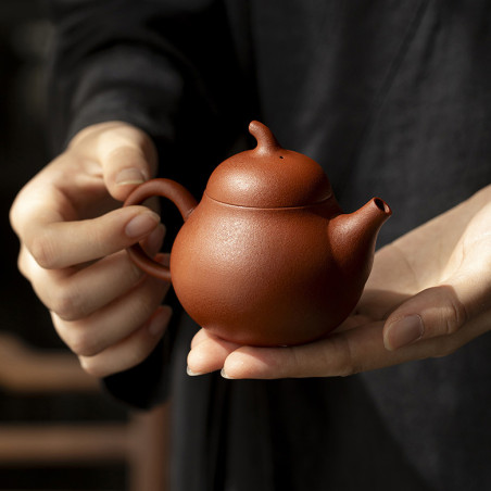 Чайник із глини чжуні "шкірка мандарина". Глина отримала таку назву, оскільки поверхня чайника своєю фактурою нагадує мандаринову шкірку. Чайник підійде для заварювання будь-якого виду чаю, тому що в цій формі закладені практично одні переваги: округле тіло (для розкриття скрученого чаю), хороший впевнений злив (насичений чай не перезавариться) і досить широкий отвір для закладки чаю (легко поміститься великий лист).