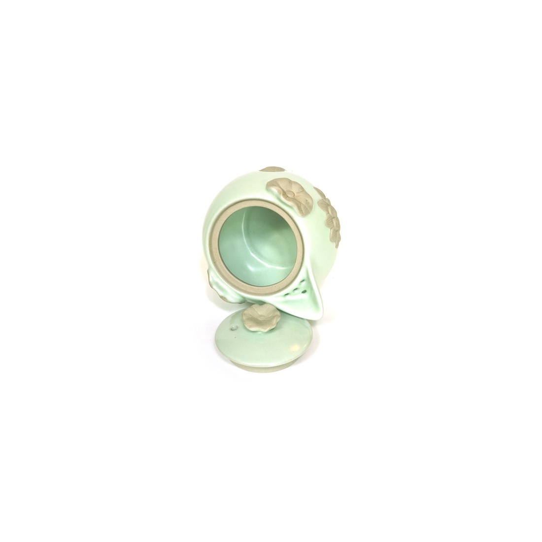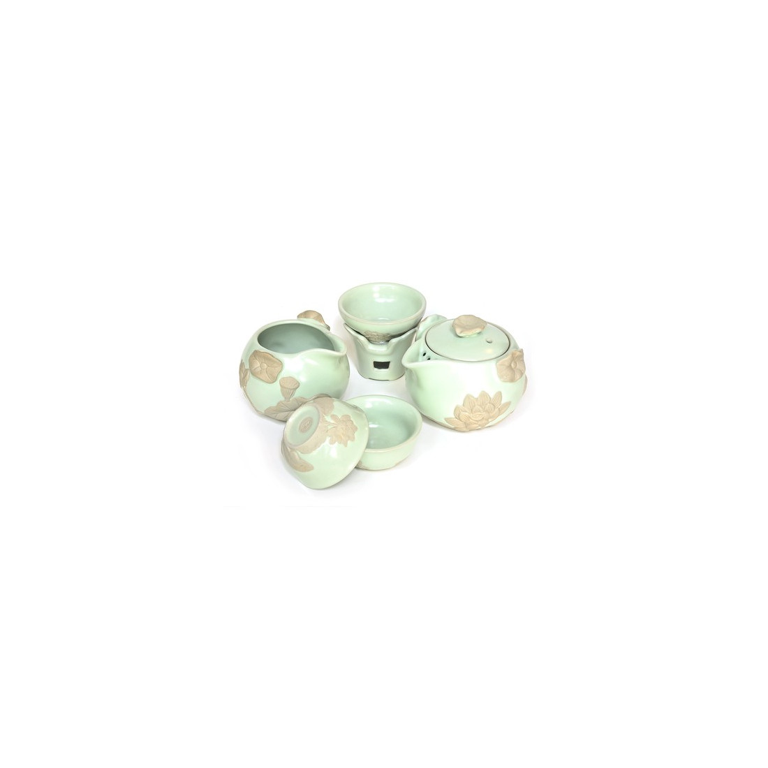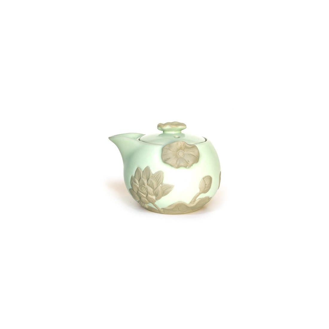 Чайник-гайвань виконаний з кераміки жу яо блакитного відтінку. Лотоси на посуді виліплені із глини.
