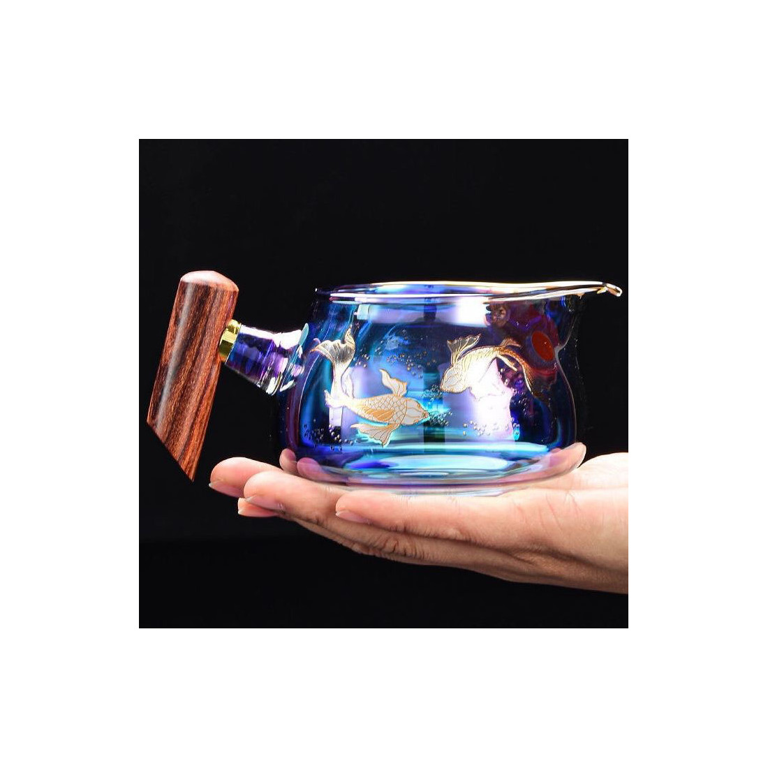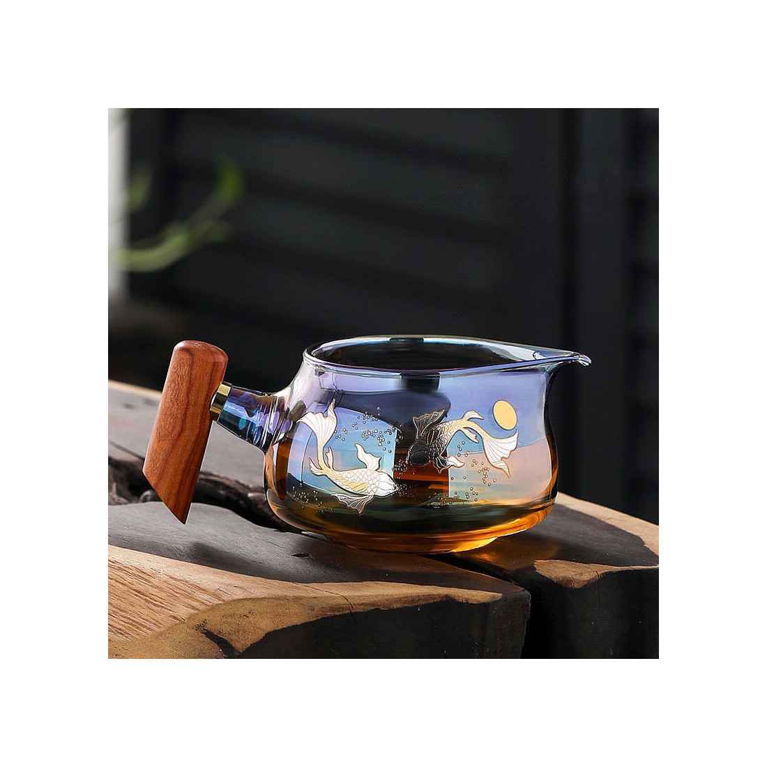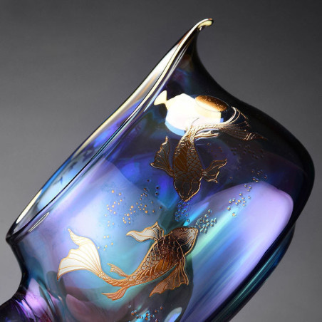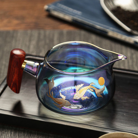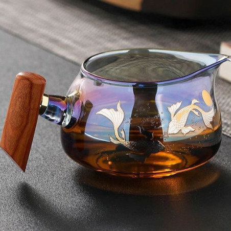 Чахай з ручкою із натурального дерева. Скло кольорове, що переливається, зверху малюнок: коропи коі.