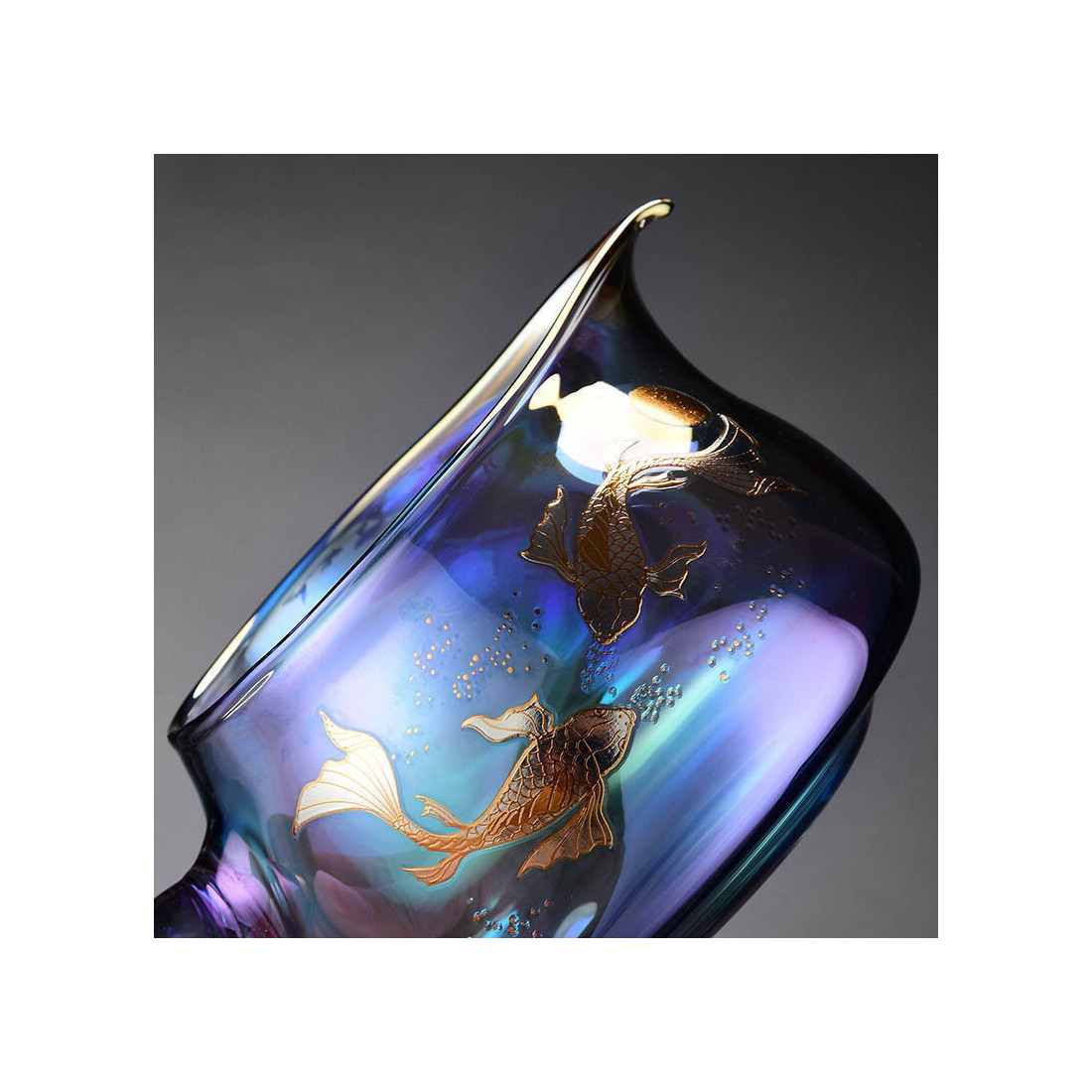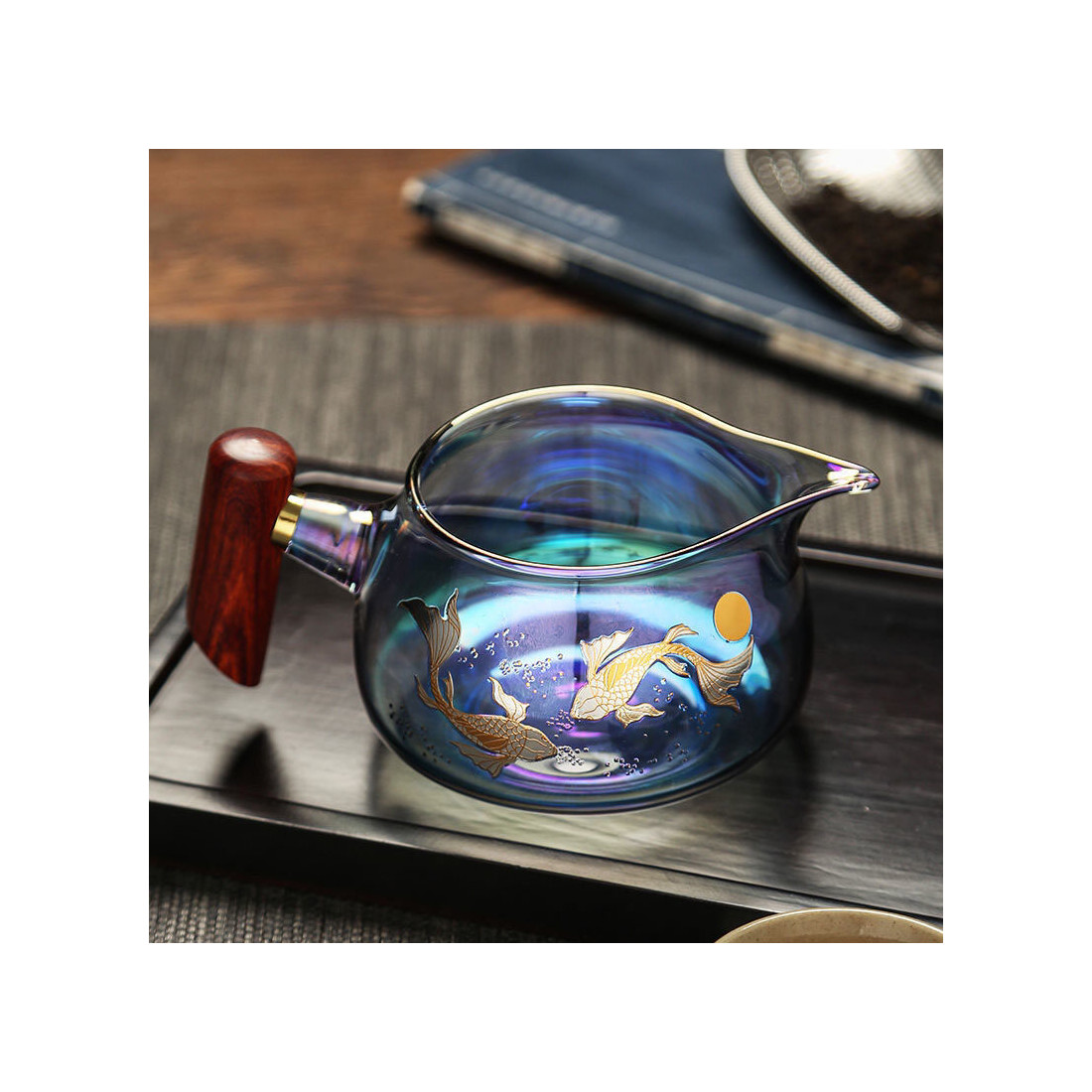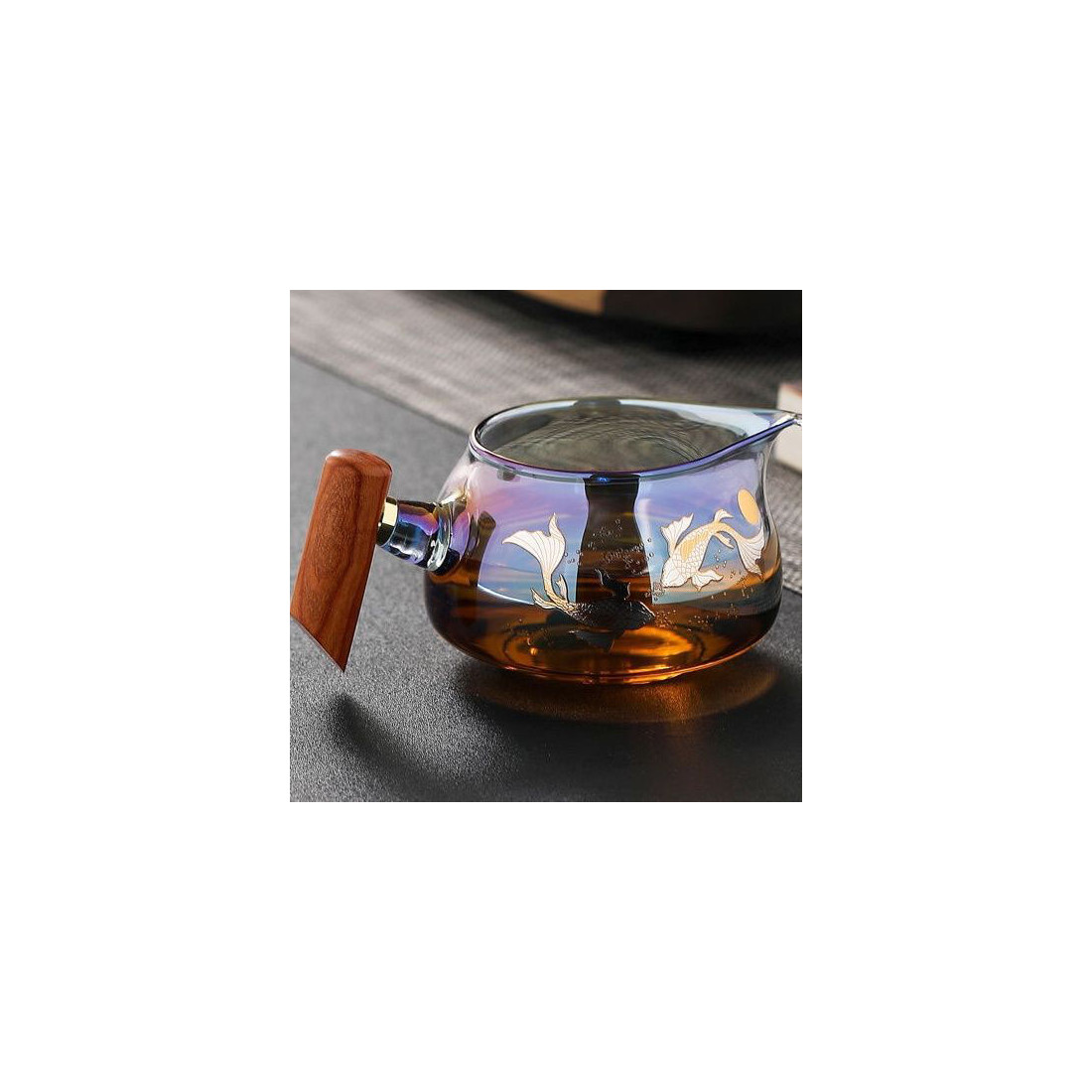 Чахай з ручкою із натурального дерева. Скло кольорове, що переливається, зверху малюнок: коропи коі.
