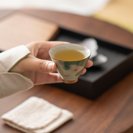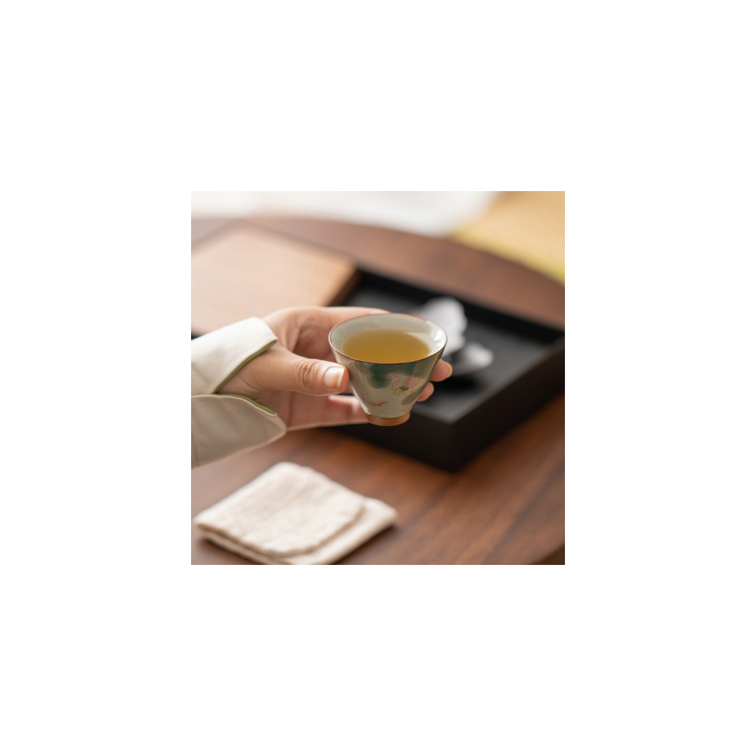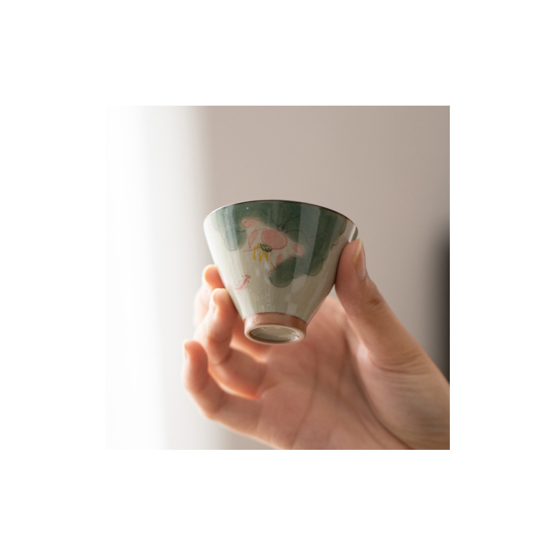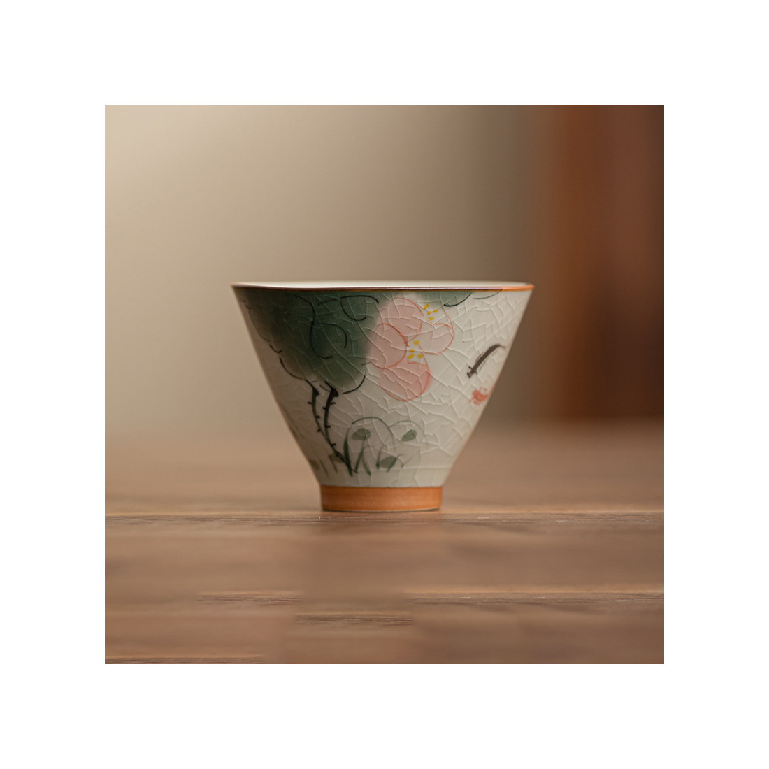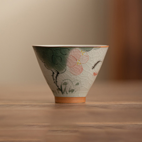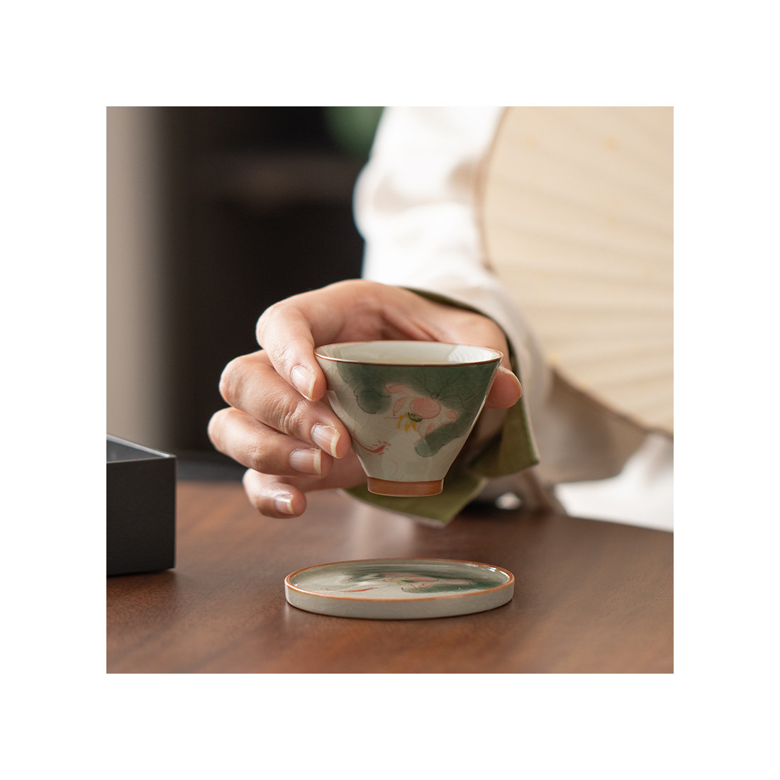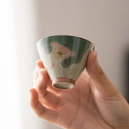 Поверхня чаші глянсова, покрита глазур'ю ґеяо з нанесенням зображення лотоса: з рибками, квіткою і листям лотоса. Тріщини, якими славиться глазур ґеяо, згодом профарбуються і стануть явнішими.