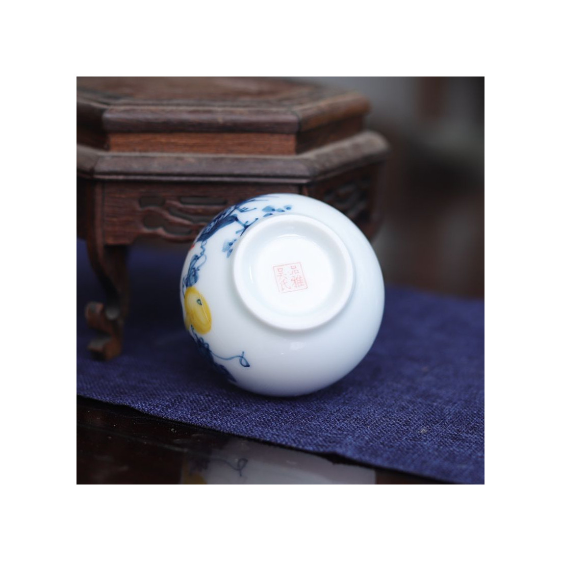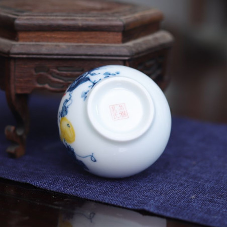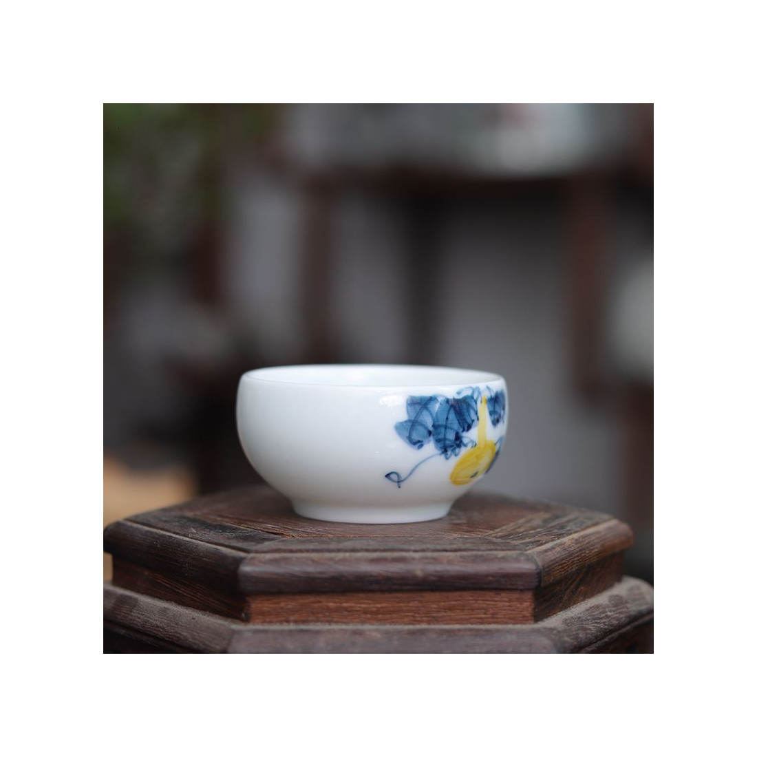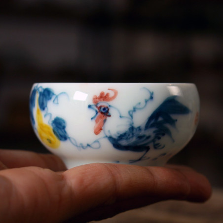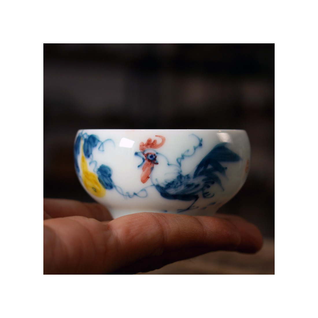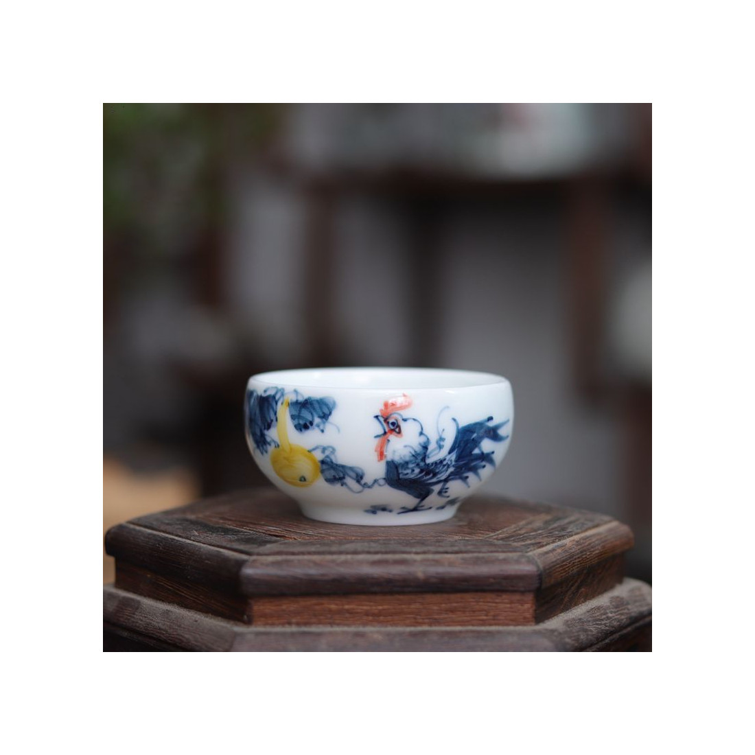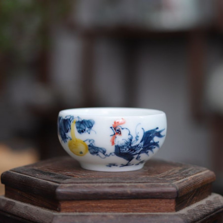 Чаша виконана з білої порцеляни з ручним розписом. На боці чаші намальований півень на тлі гарбуза-горлянки.