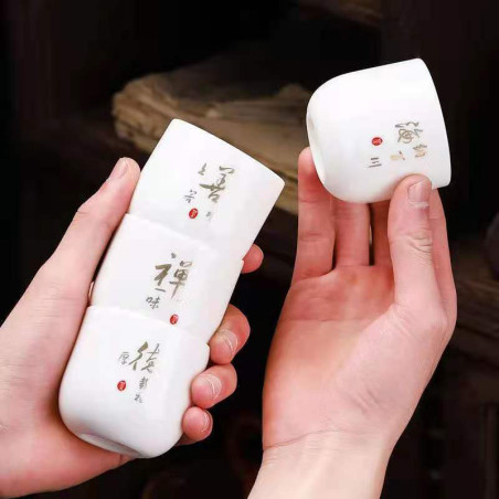 Чаша виконана з порцеляни кольору білого нефриту (羊脂玉瓷), відомого ще з часів імперії Мін (17 ст). Відмінність цієї порцеляни в тому, що вона не холодного, а теплого відтінку. На поверхню золотом нанесено мудрі висловлювання.