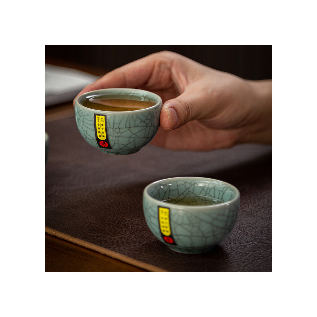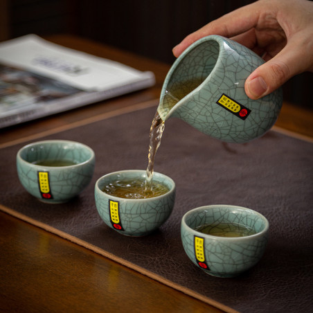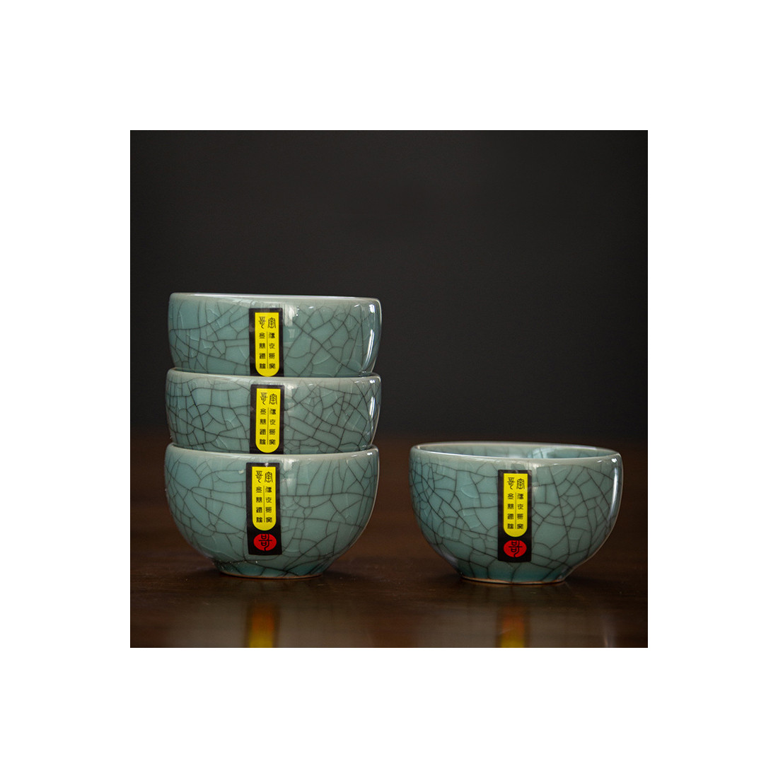 Чаші з блакитного ґеяо з темними прожилками. Без малюнку – зверху наклеєні жовті наліпки, які можна зняти одразу або вони самі змиються з часом.