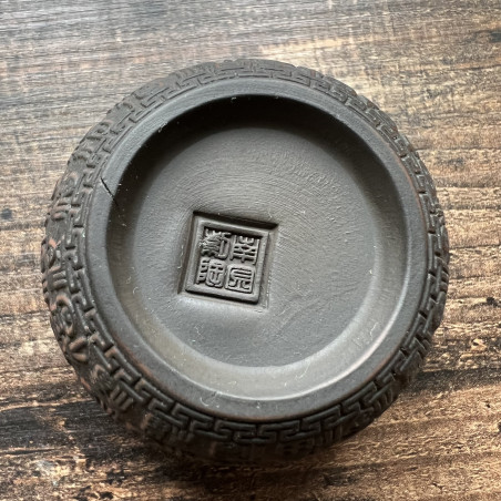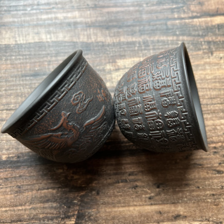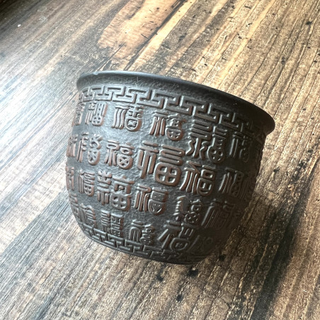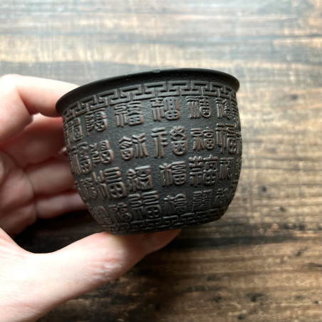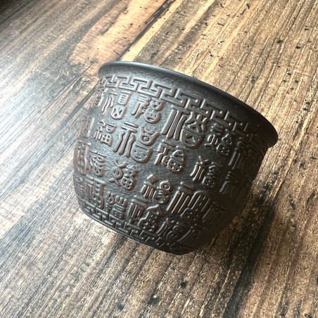 Глиняна чаша із зображенням ієрогліфів "щастя" у різних написаннях. Малюнок розташований на всій зовнішній поверхні чаші. Техніка виконання чаші нагадує зістарені бронзові судини.