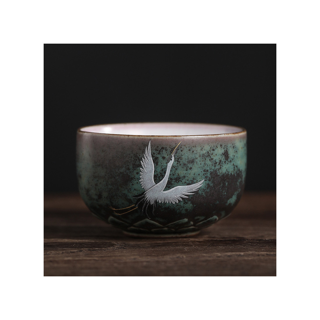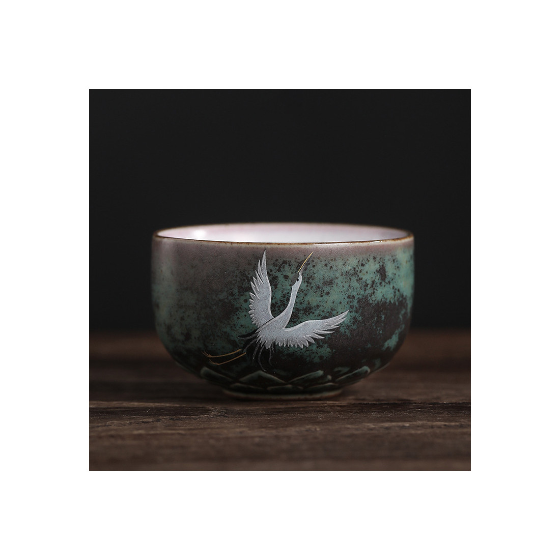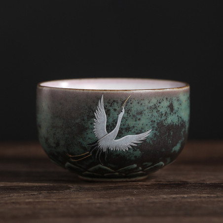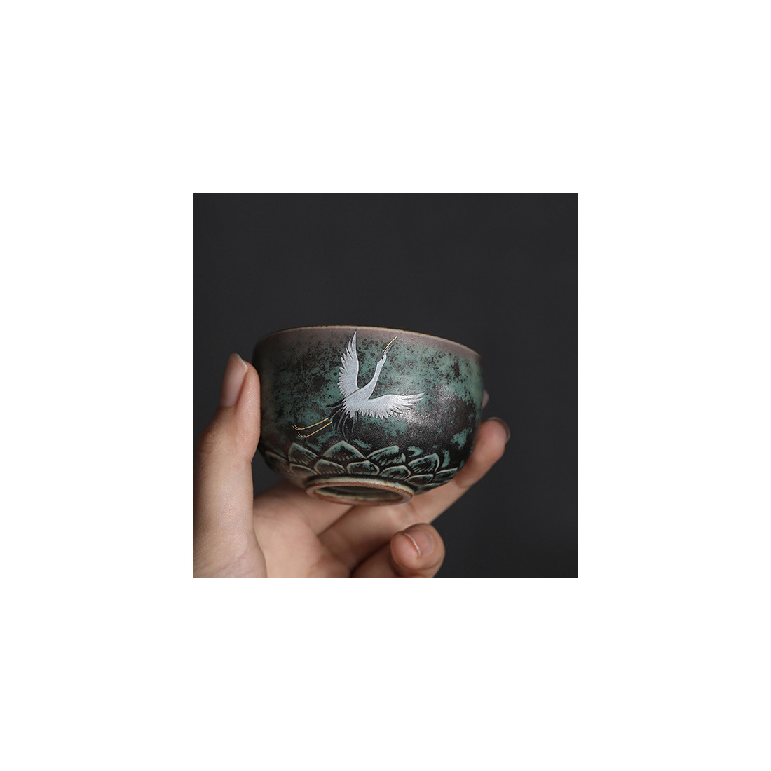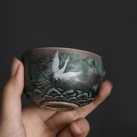 Керамічна чаша із зображенням журавля та фактурними пелюстками лотоса біля основи.