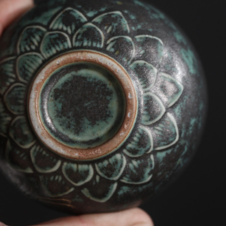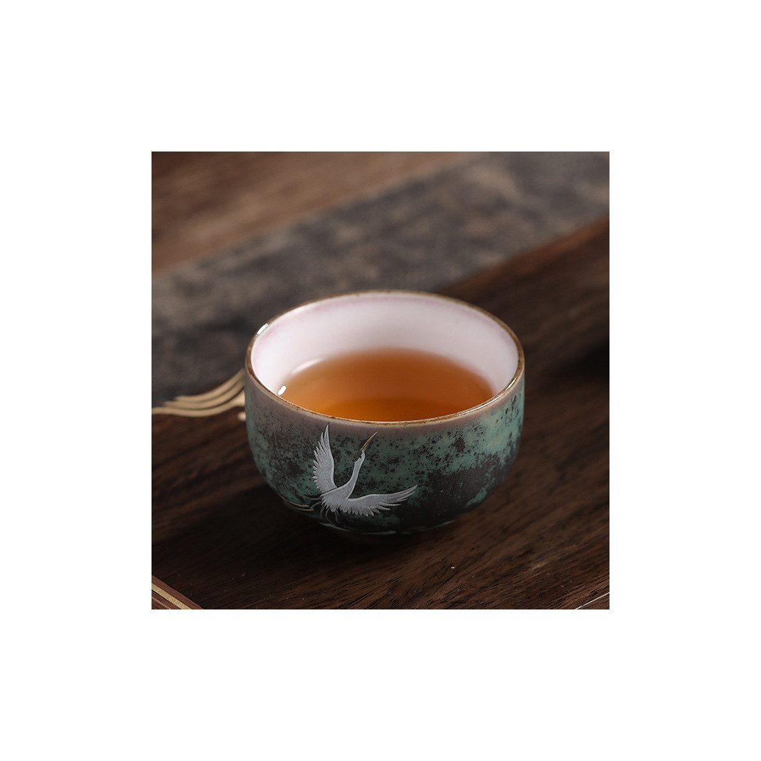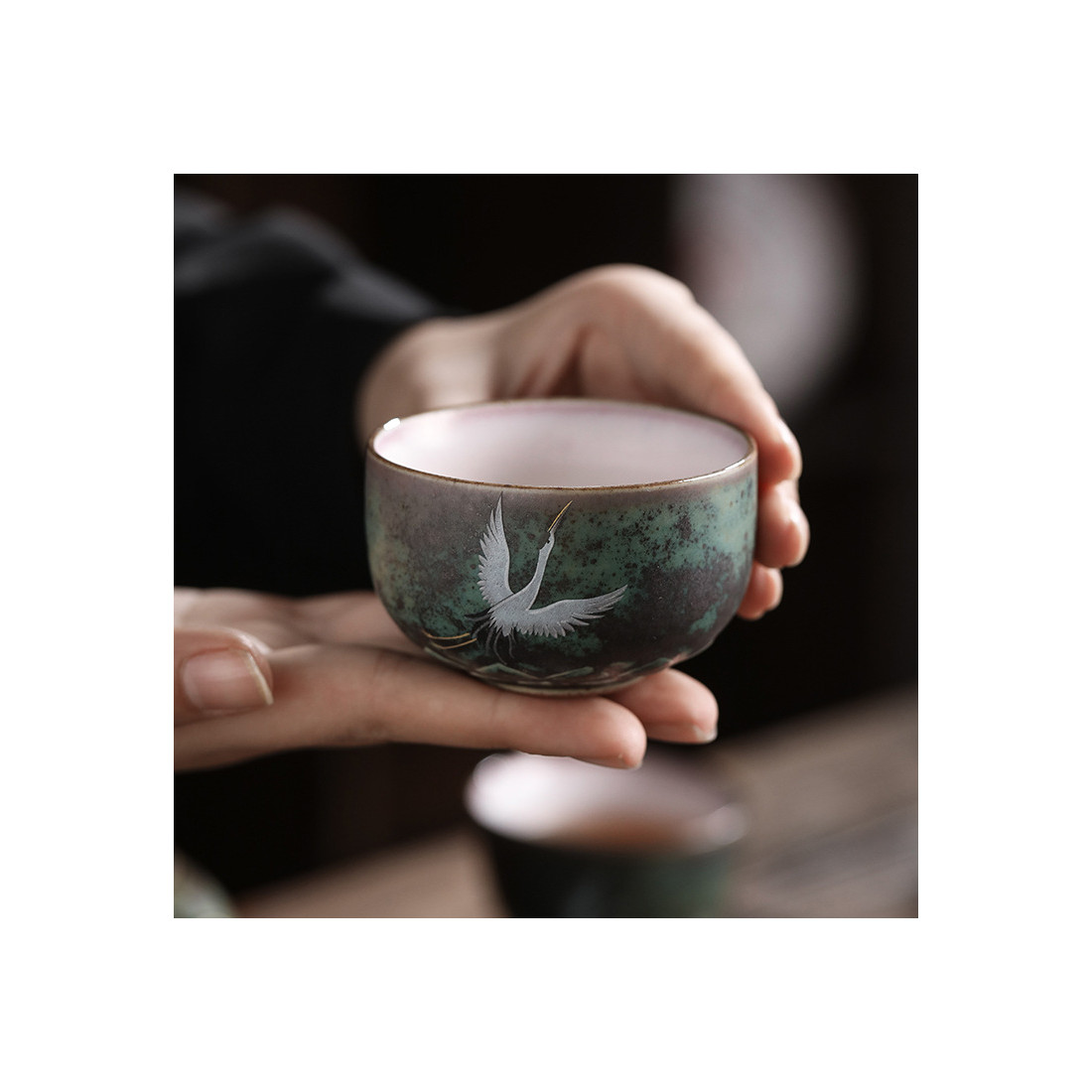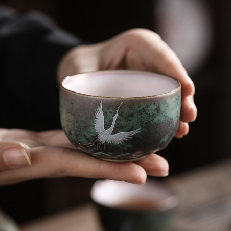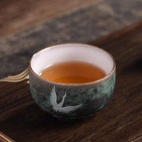 Керамічна чаша із зображенням журавля та фактурними пелюстками лотоса біля основи.