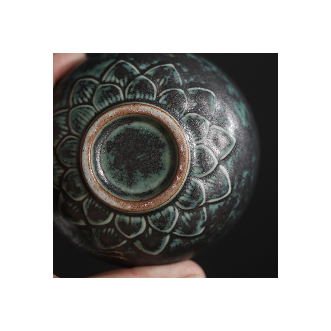 Так як покриття чаші з ефектом яобянь, тобто в печі утворюється остаточний малюнок і колір глазурі, всі чаші трохи відрізняються за забарвленням, але зберігають малиновий, золотистий і зелений відтінок, показаний на фотографії. Малюнок — аплікація.