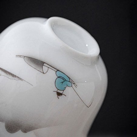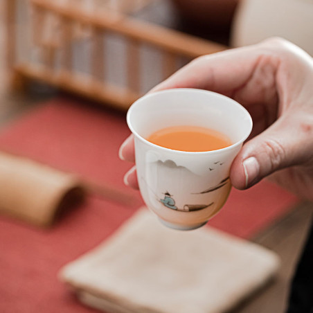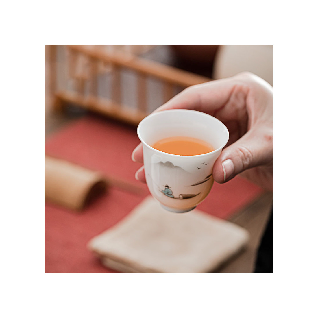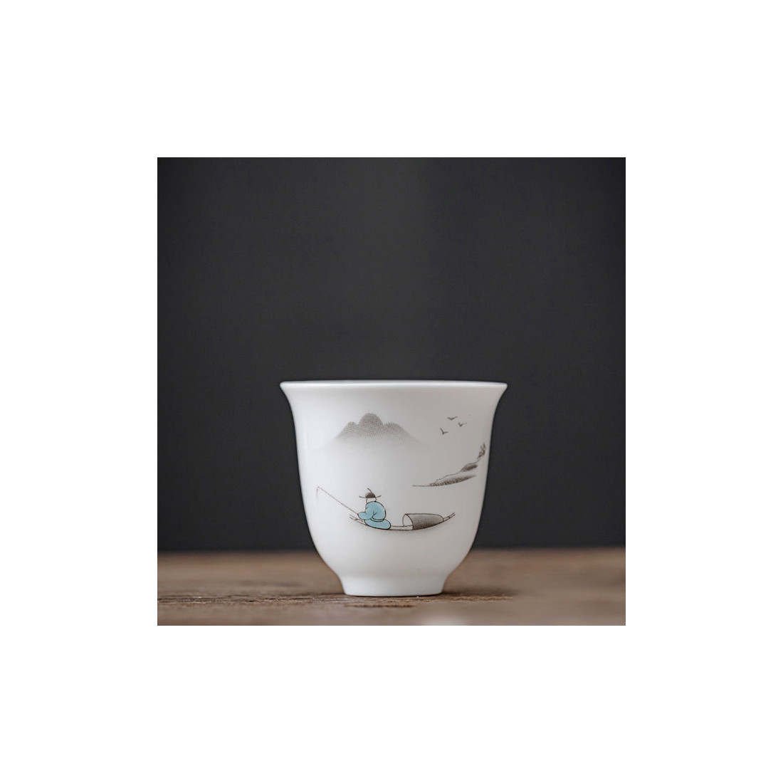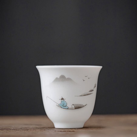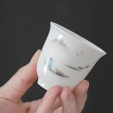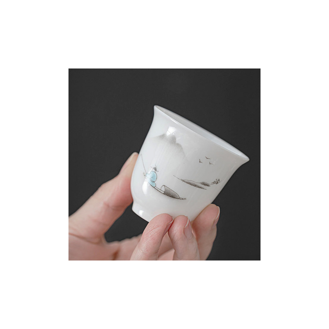 Чаша із зображенням річкового пейзажу з рибалкою. Виконана з тонкостінної порцеляни з нанесенням аплікації.
