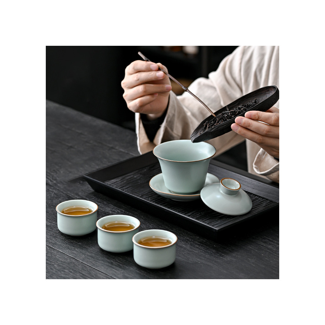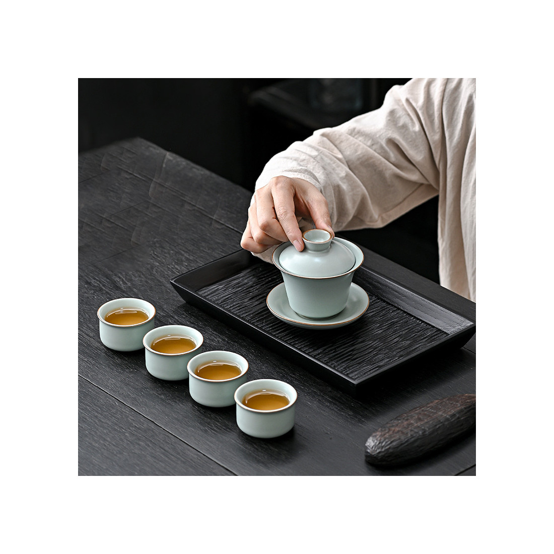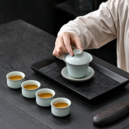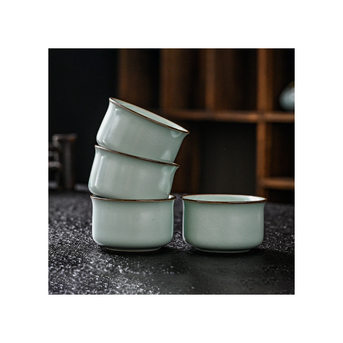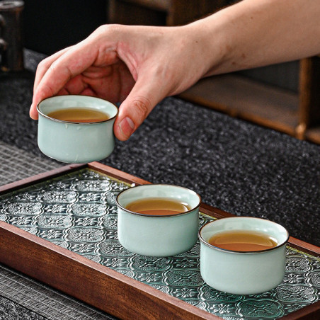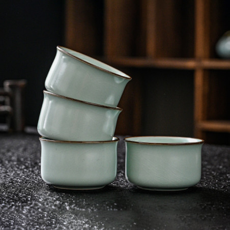Чаші з товстостінної кераміки жуяо сіро-блакитного кольору. Виготовлено традиційно: глибокий матовий колір, коричневі борти, проглядається "крокелюр", який з часом (від контакту з чаєм) промальовується і стане явним.