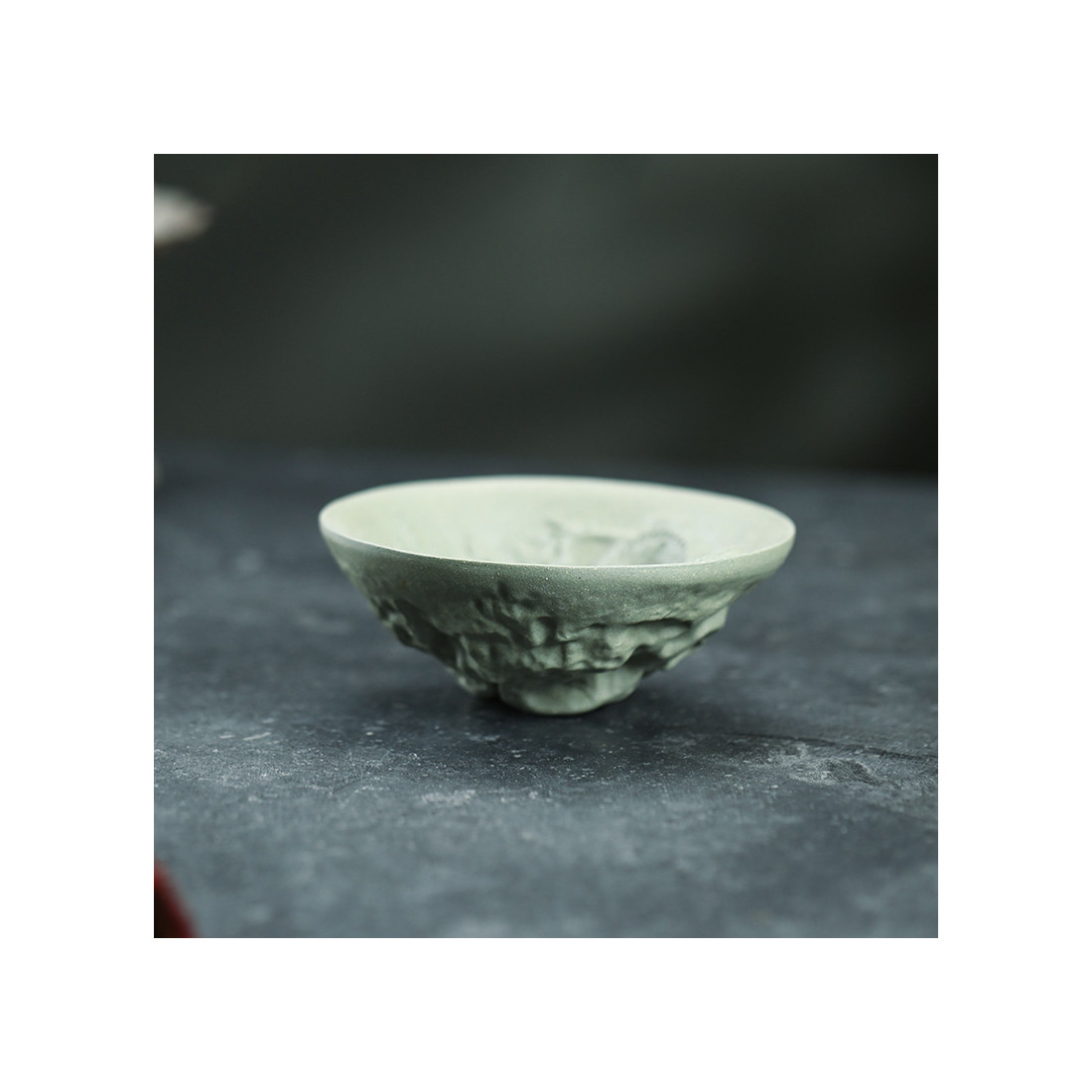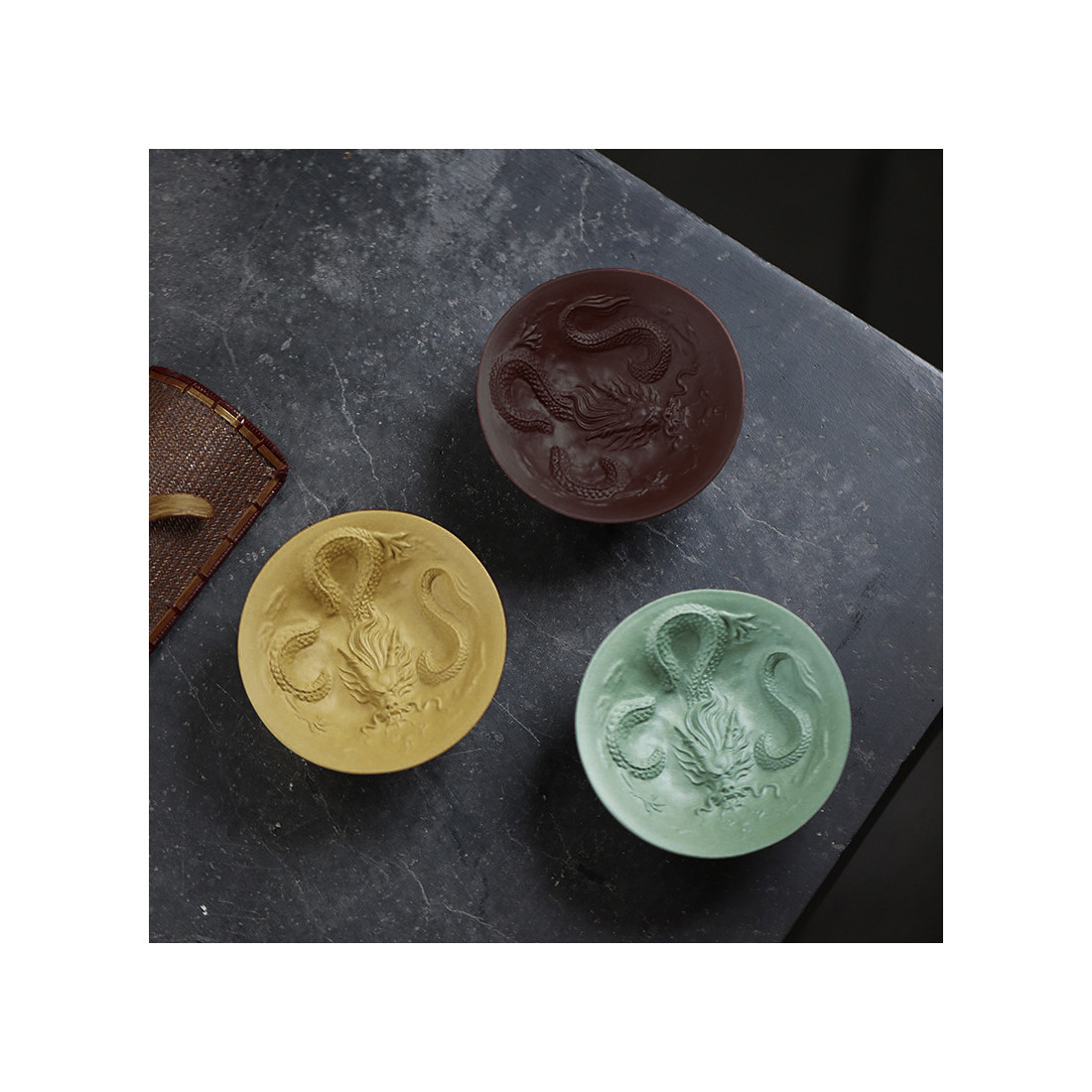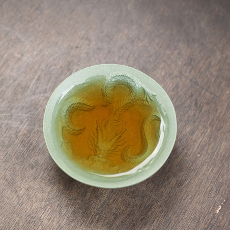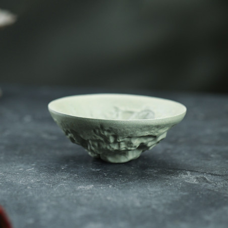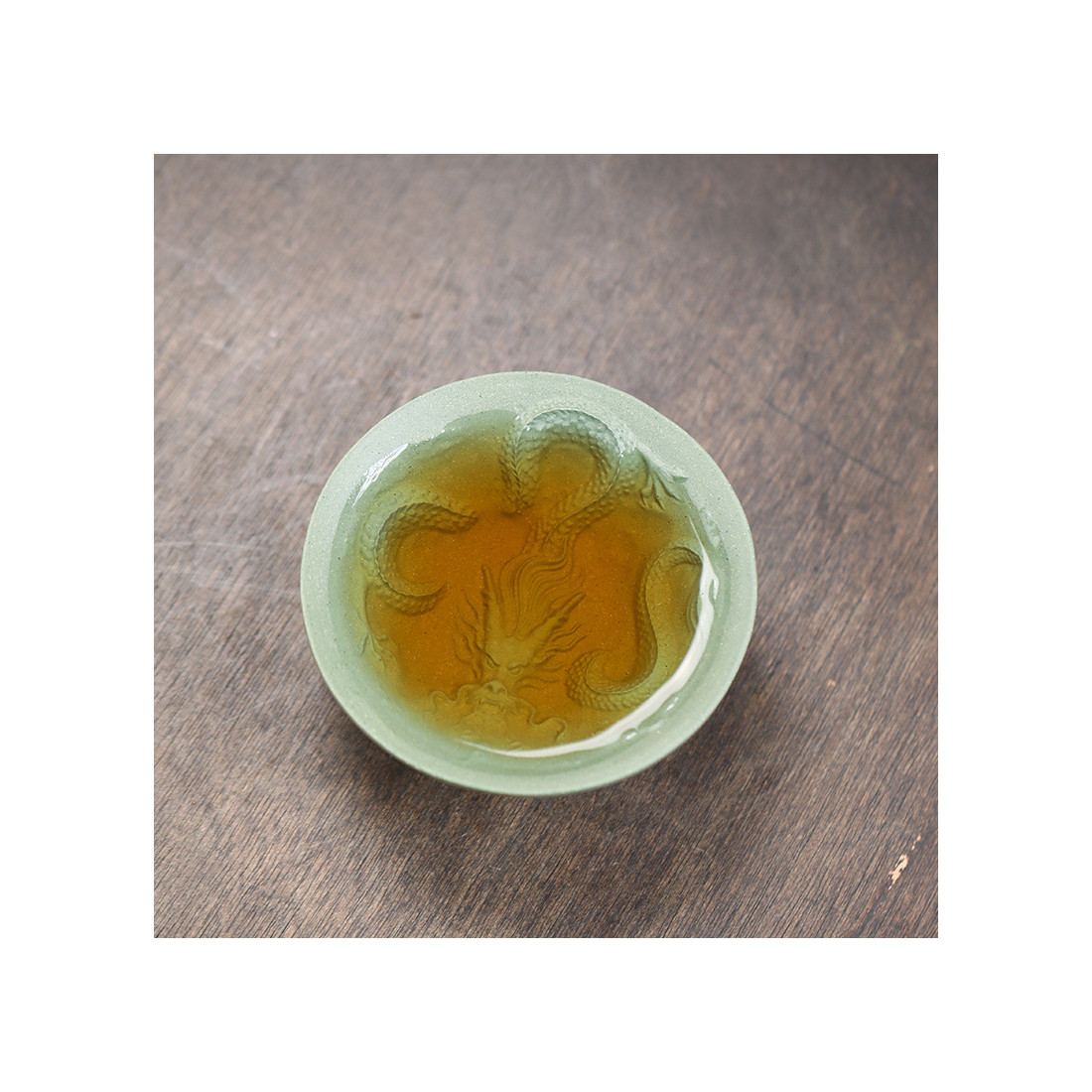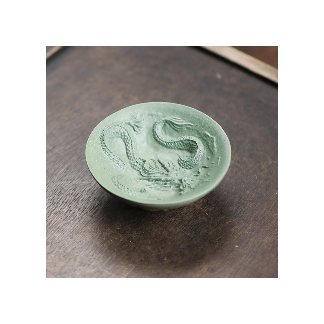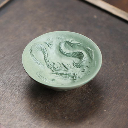 Чаша із їсінської глини зеленого кольору. Зовні фактура каменю з озера Тайху, а всередині об'ємний дракон. З часом глина вбере чай, забарвиться і дракон виглядатиме більш глянцевим і контрастним.