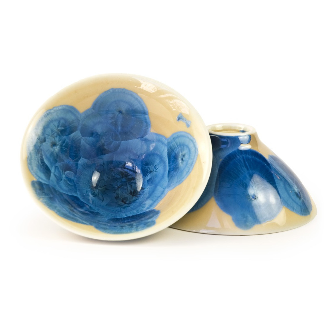 Фаянс із нанесенням синіх розлучень ефектарною глазур'ю на глазур пісочного кольору.