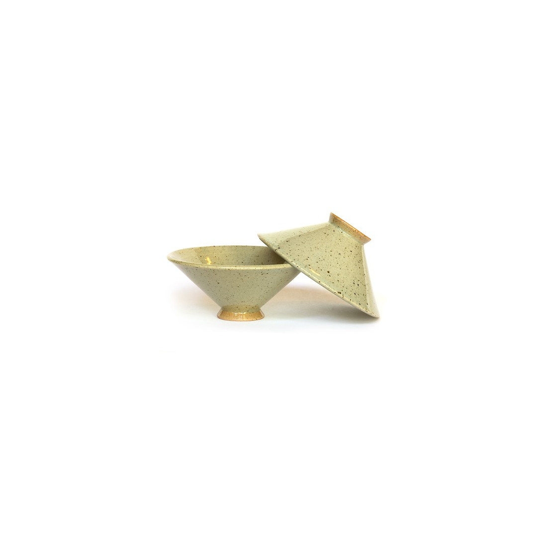 Чаша літньої, відкритої форми зліплена з глини, зверху покрита сірою емаллю з чорними крапками та рожевим обідком на ніжці. Дуже тонка, витончена, майже невагома.