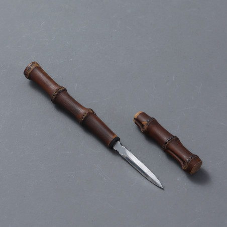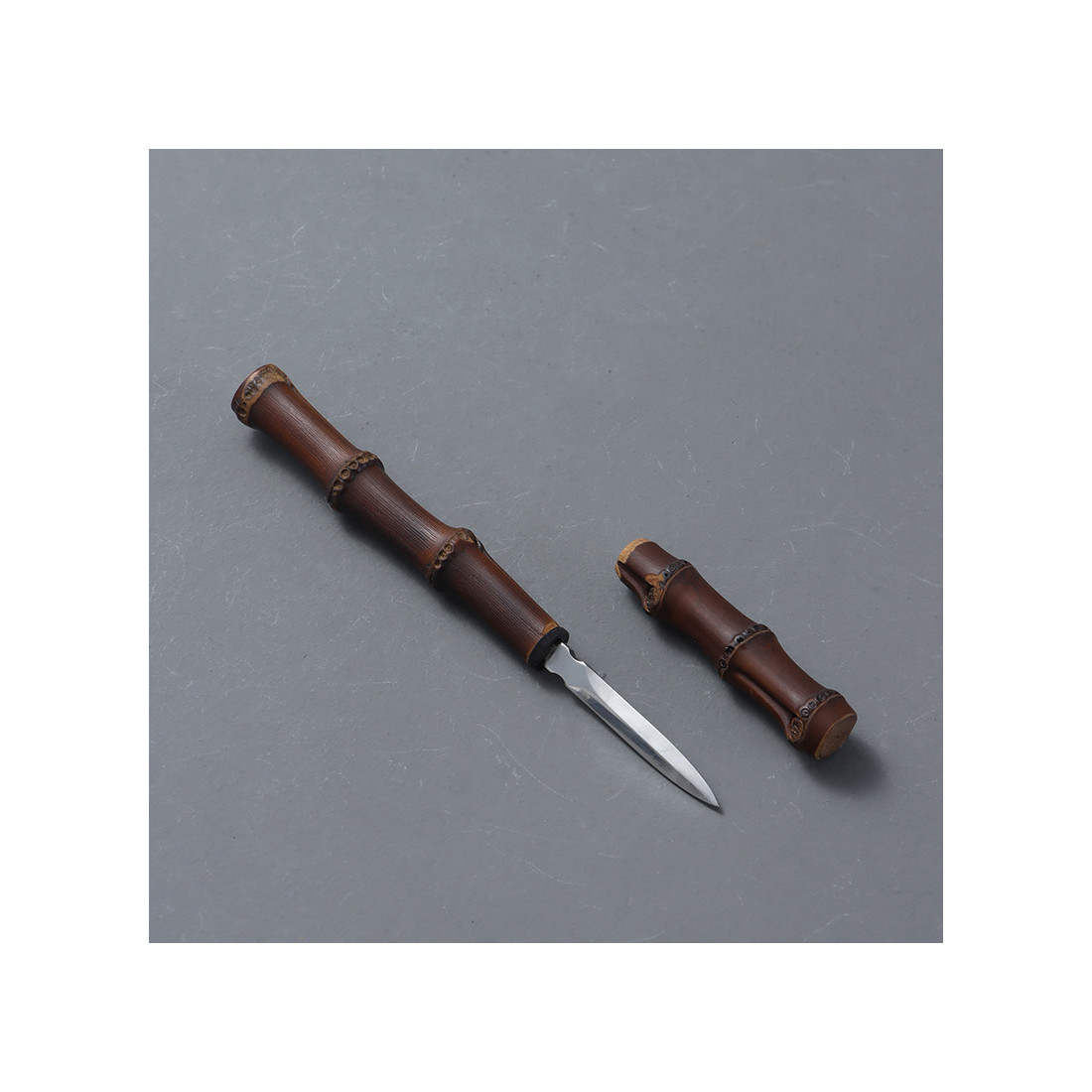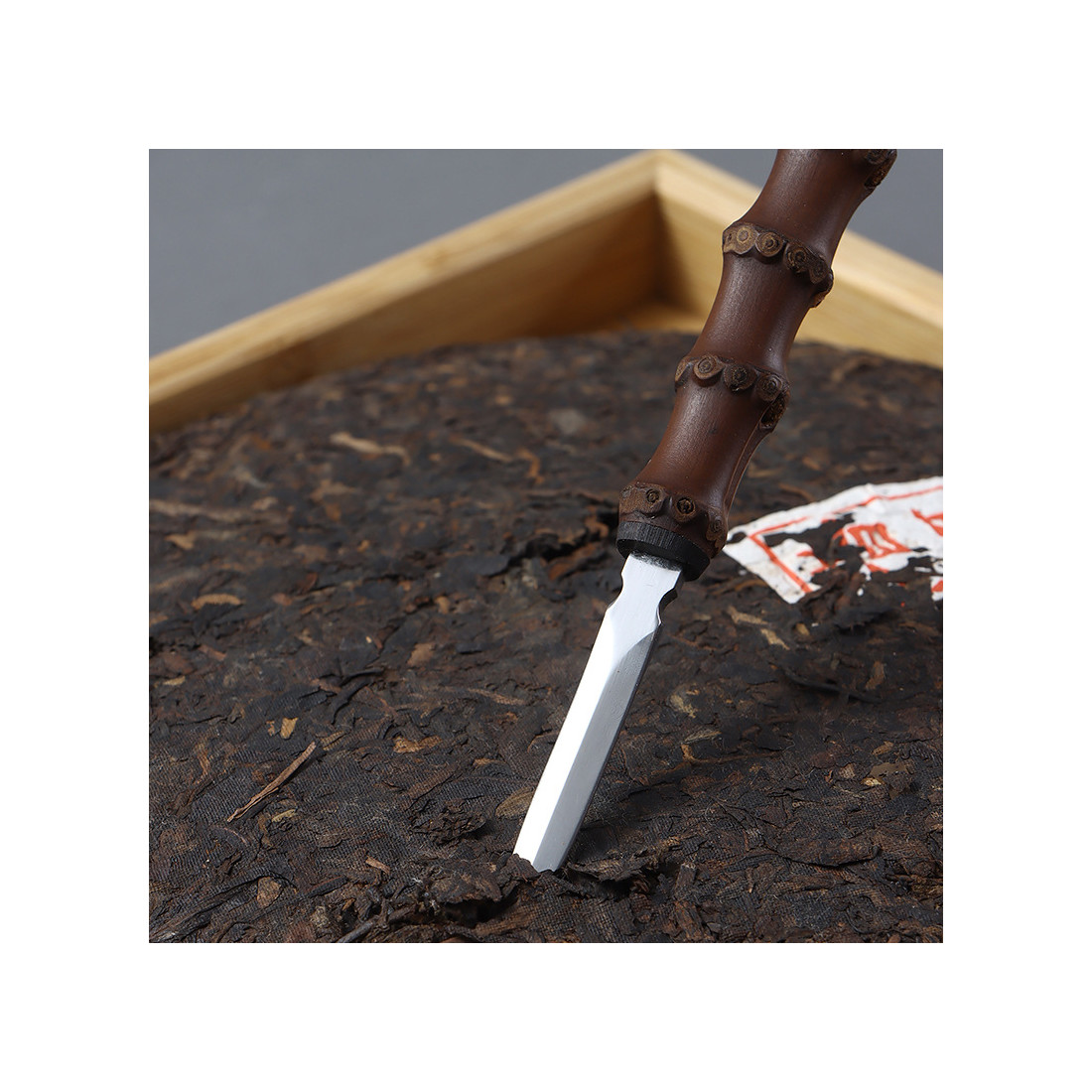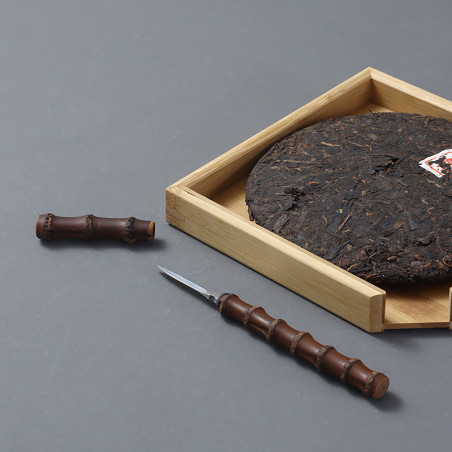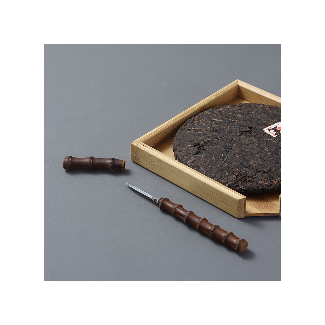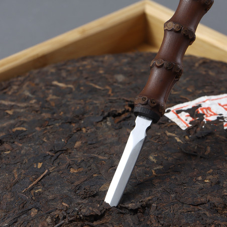 Цей ніж створений спеціально для розколювання спресованого пуеру. Для оформлення використано натуральний бамбук, з нього зроблена ручка та футляр на лезо. Саме лезо виготовлене із нержавіючої сталі.