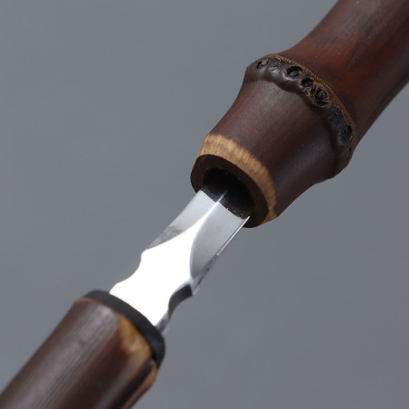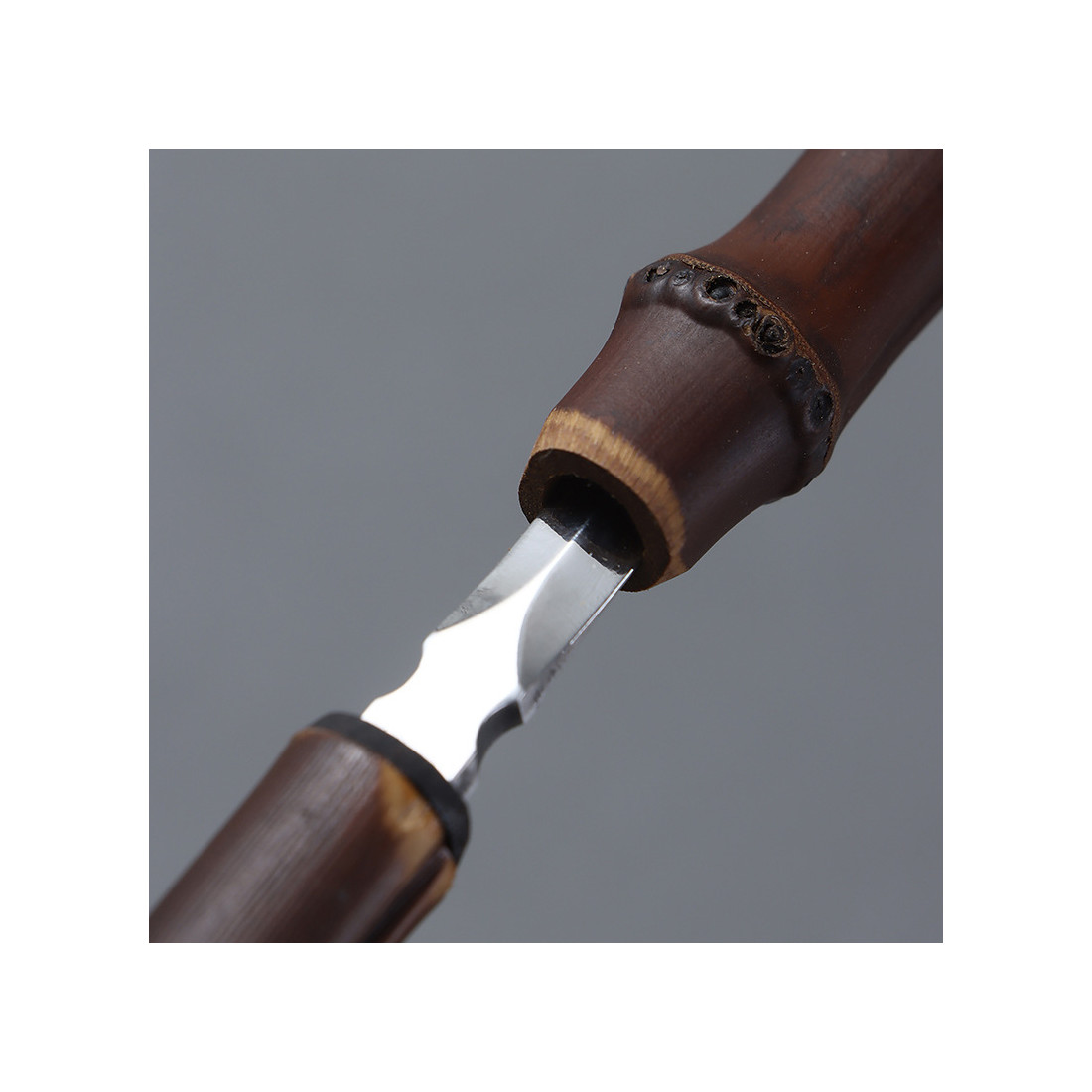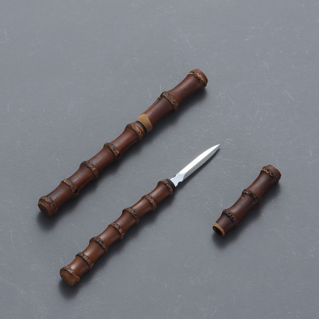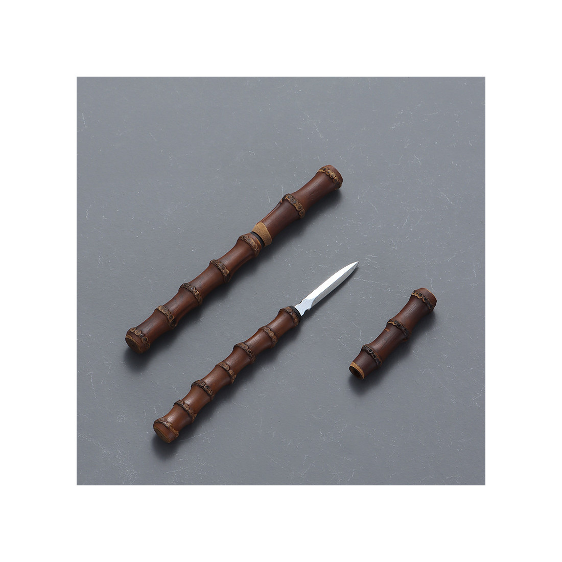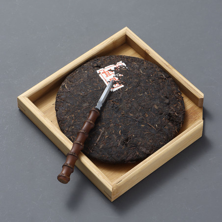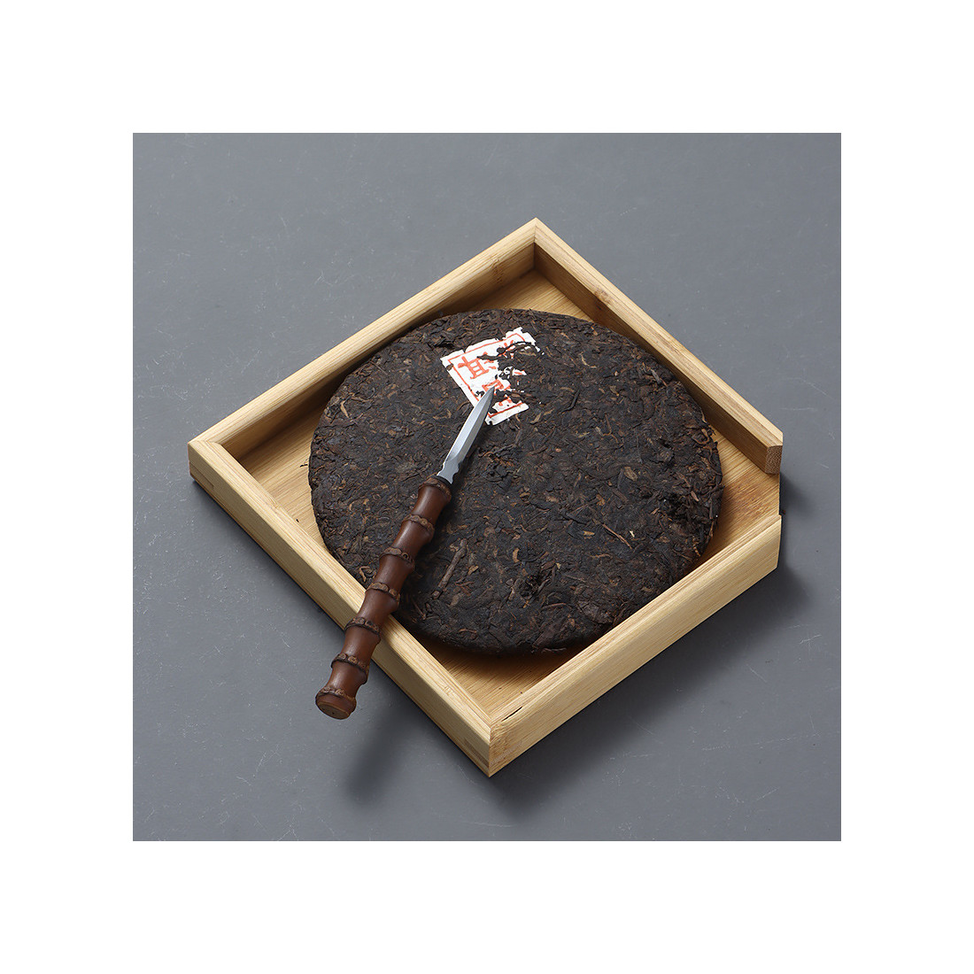 Цей ніж створений спеціально для розколювання спресованого пуеру. Для оформлення використано натуральний бамбук, з нього зроблена ручка та футляр на лезо. Саме лезо виготовлене із нержавіючої сталі.