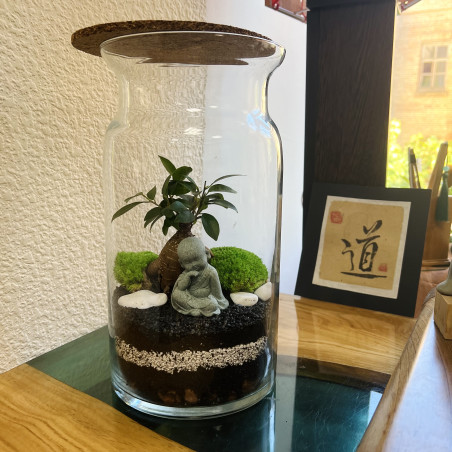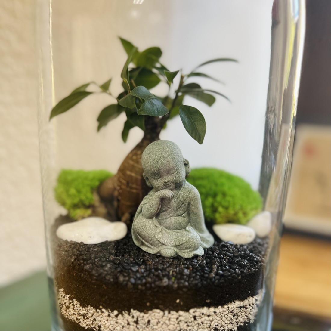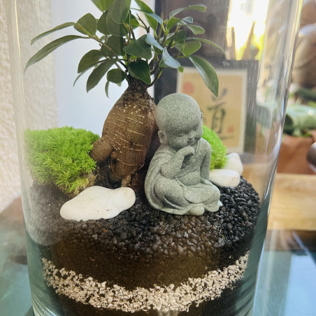 У скляну колбу посаджений фікус Гінсенг та стабілізований мох. Композиція прикрашається камінням та статуеткою у вигляді маленького будди із пісковика.